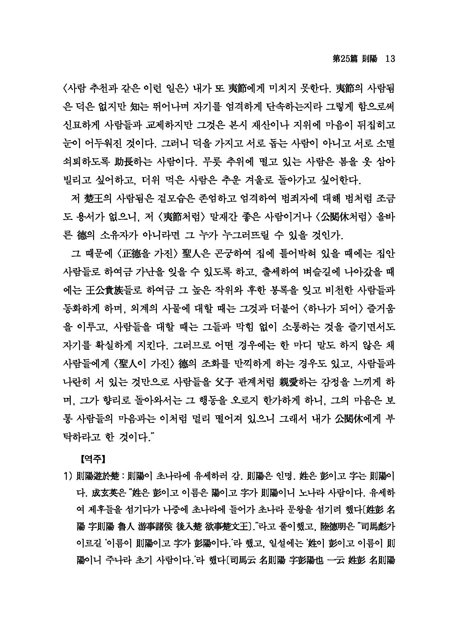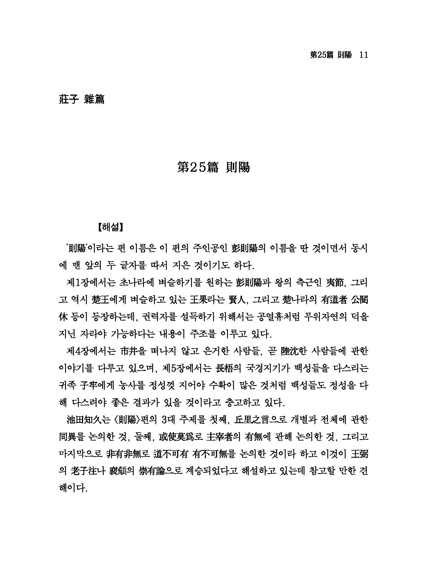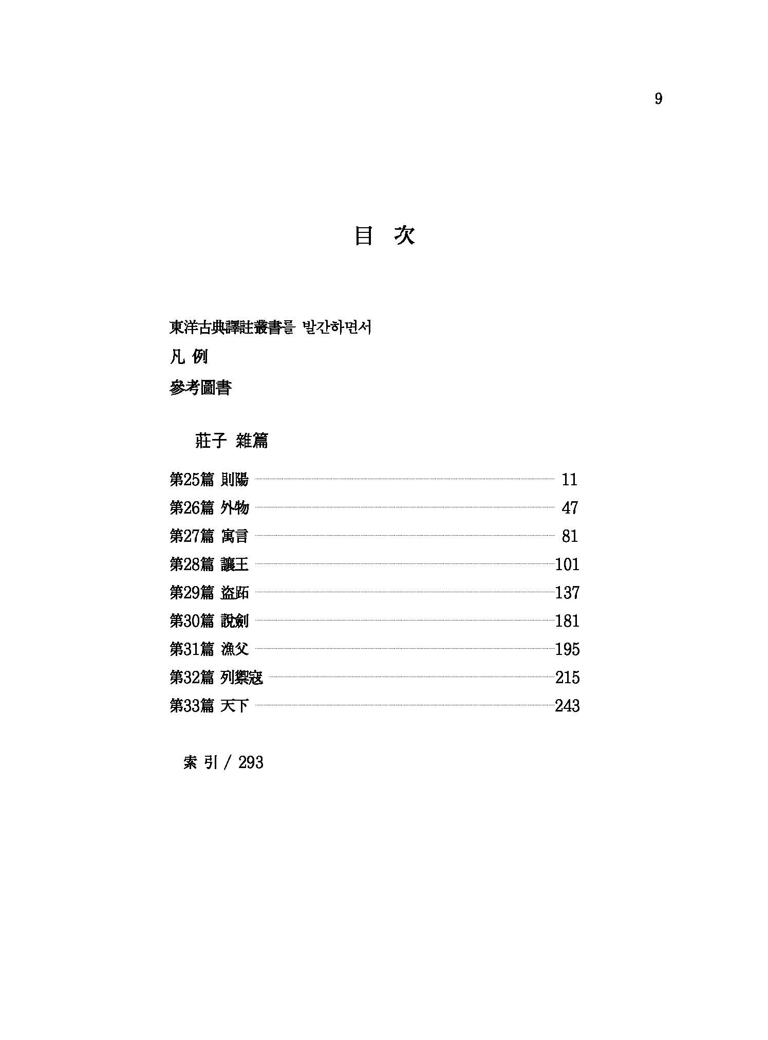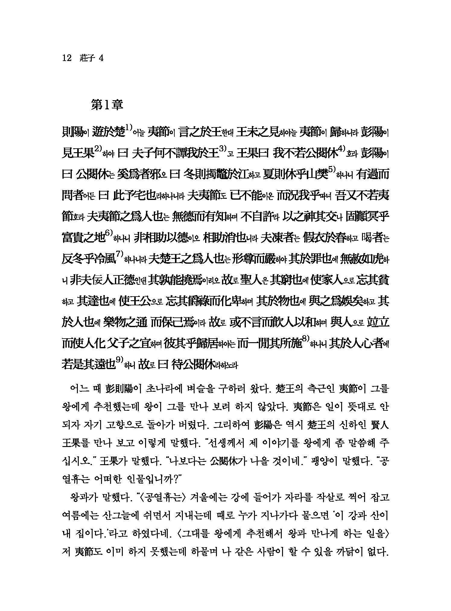 일명 ≪南華經≫ ≪南華眞經≫이라고도 불리는 ≪莊子≫는, 戰國 中晩期에 이루어진 道家學派의 대표적인 작품으로 先秦時代 諸家의 사상이 두루 透映되어 있다. ≪장자≫는 문체의 風格이 高雅하고 독특하다. 현묘한 哲理와 생동하는 구체적 형상을 하나로 鎔解하여, 추상적 思惟와 형상적 사유를 결합하여 풍부한 상상을 자아내게 하는 당세의 걸작일 뿐만 아니라 오늘을 사는 우리에게도 ‘道’에 대해 많은 생각을 갖게 한다. ≪장자≫의 저자인 莊子의 名은 周이고 字는 子休이며 蒙 땅 사람이다. 그에 대해서 전해오는 신상은 명확하지 않은데 대략 梁나라 惠王과 齊나라 宣王과 동시대 인물이라는 점, 그의 주장이 老子의 주장과 같다는 점, 저서로 남긴 十餘萬言의 내용이 대부분 寓言이라는 점 등이다. 우리나라에서 ≪莊子≫는 사서오경을 비롯한 유가경전만큼 중시되지는 않았으나 그렇다고 학자들이 장자를 읽지 않았던 것은 아니다. 우리 선현들의 시문집에는 장자의 胡蝶夢이나 知魚之樂과 관련된 언급이 종종 나온다. 宋의 林希逸 주석본이 통행하면서 현토본이 출간되기에 이르렀는데, 조선조 유학자들은 林希逸 주석을 중심으로 장자를 이해하였다. 이 책의 특징 ◈ ≪譯註 莊子2≫는, ≪譯註 莊子1≫의 內篇 7편 완역에 이어, 外篇 7편의 완역서이다. ◈ 郭象을 비롯한 諸家의 주석은 물론, 최근 우리나라에서 간행된 역서와 중국 및 대만, 일본의 번역본에서 참고할 만한 내용을 선별하여 譯註에 실었다. ◈ 일관된 의견으로 역주하되 많은 주석가의 주석을 싣고, 때로는 본류와 다른 의견을 함께 보여줌으로써 독자에게 ≪장자≫의 원뜻을 이해하는 데 도움을 주고자 하였다. ◈ 인용한 주석의 말미에 주석가의 성명을 표기해 누구의 주장인지 알 수 있도록 하여 ‘주석서의 안내서’ 역할까지 하고 있다. ◈ 寓言化된 ≪장자≫의 내용을 가장 잘 표현할 만한 단어를 쓰는 데 고심하였다. ◈ 마음의 여유를 얻고 삶의 방향을 다른 차원에서 보고자 하는 사람들의 애독서로 권장할 만하다.