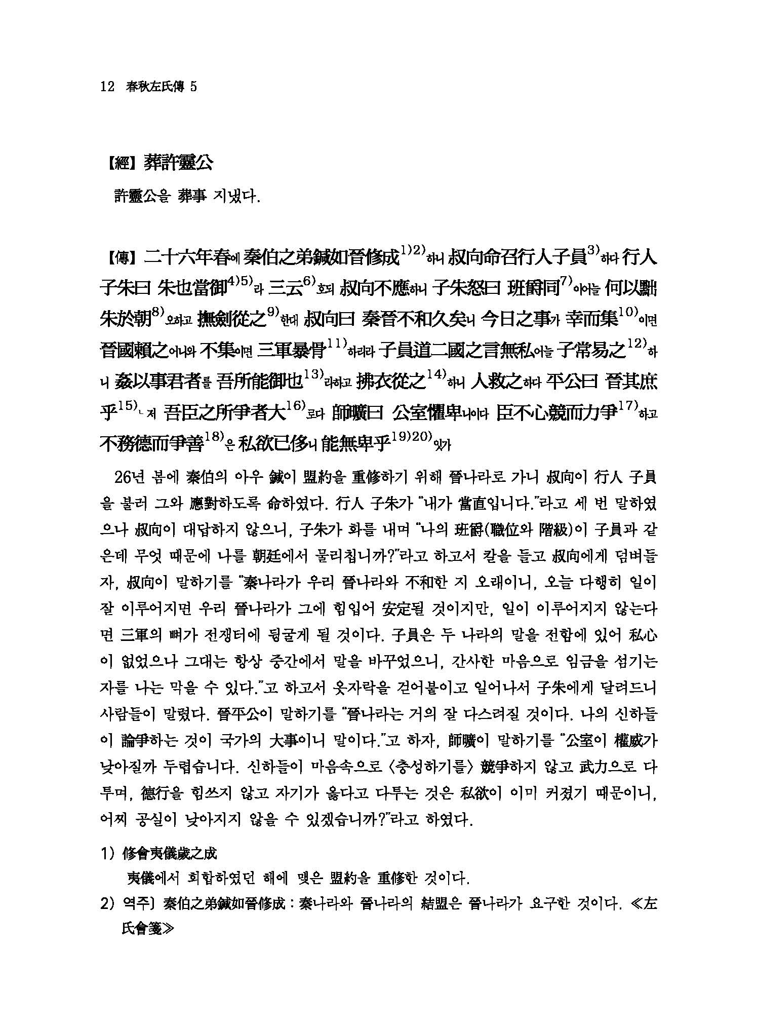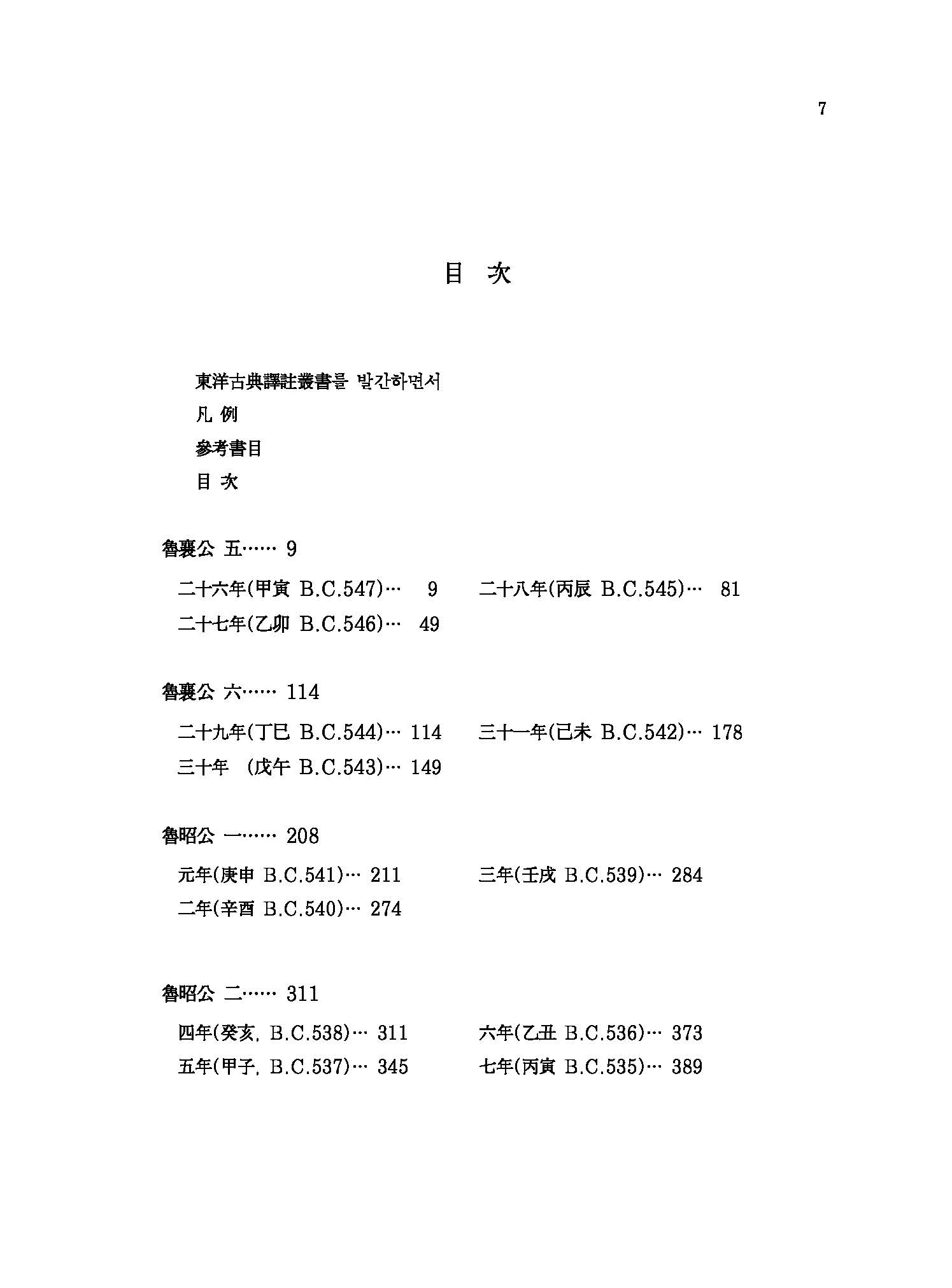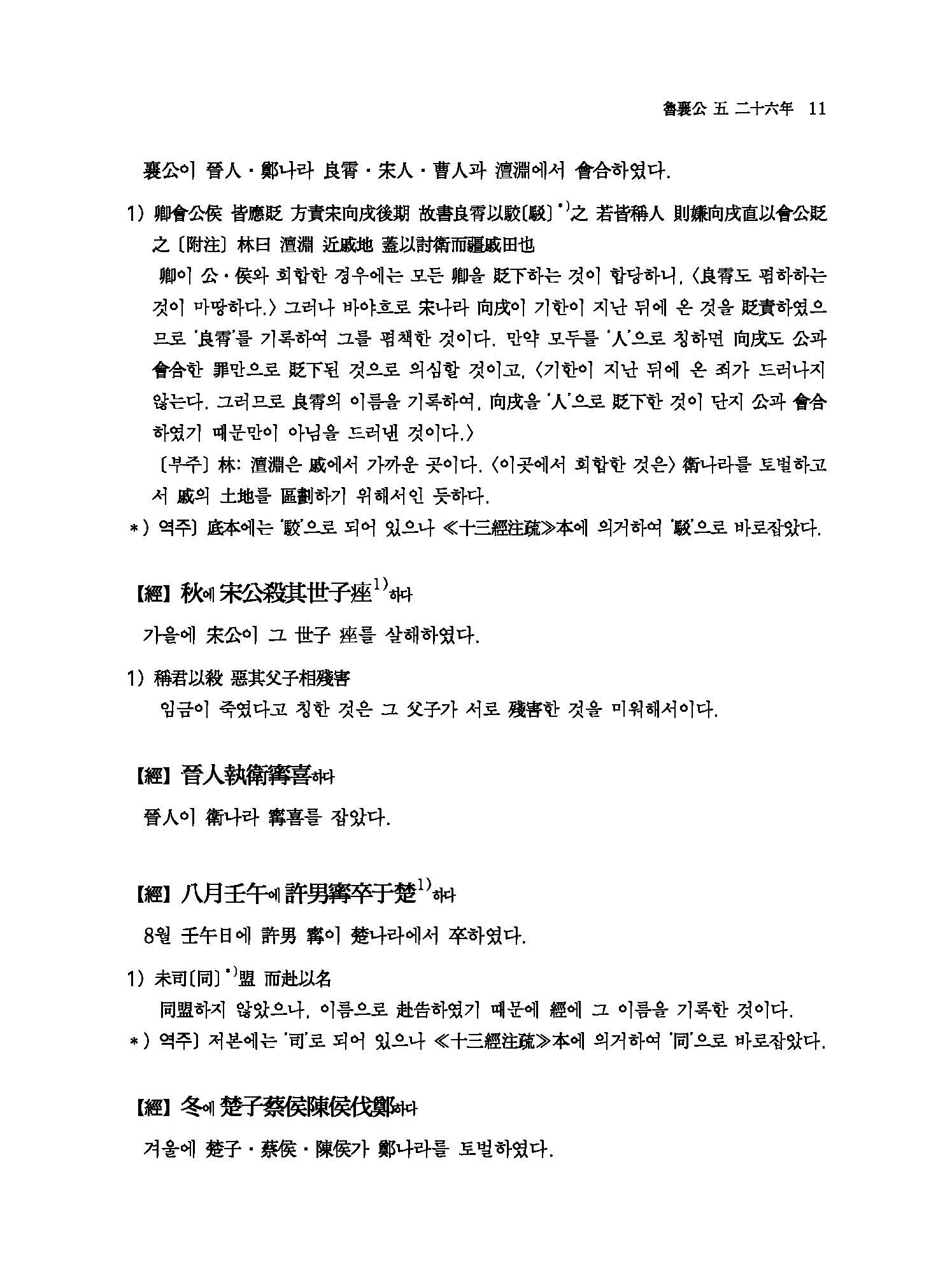 이 ≪좌씨전≫에 대한 註釋書는 수없이 많으나, 그 중에서도 晉나라 두예(杜預)의 注, 唐나라 공영달(孔穎達)의 소(疏)와 근대 중국 학자 양백준(楊伯峻)의 주석이 대표적이라 할 수 있다. 번역의 臺本은 조선 世宗 때 集賢殿 學士들이 王命을 받아 두예주(杜預注)를 위주로 삼고 임요수(林堯?)와 주신(朱申)의 설을 附注하여 편찬해 출간한 內閣本을 底本으로 삼았다. 이 번역을 위하여 韓國文集叢刊(한국고전번역원 간행)과 ≪韓國經學資料集成≫(성균관대 대동문화연구원 간행)을 참고하여 우리 나라 先學들의 註說이나 辨證을 譯註로 소개하였고, ≪春秋左傳正義≫(十三經注疏本)를 참고해 誤脫字를 訂補하였으며, 서울대학교 奎章閣 소장본인 ≪春秋經傳集解≫의 懸吐를 참고하여 經과 傳에 懸吐함으로써 原典의 이해를 도왔다.