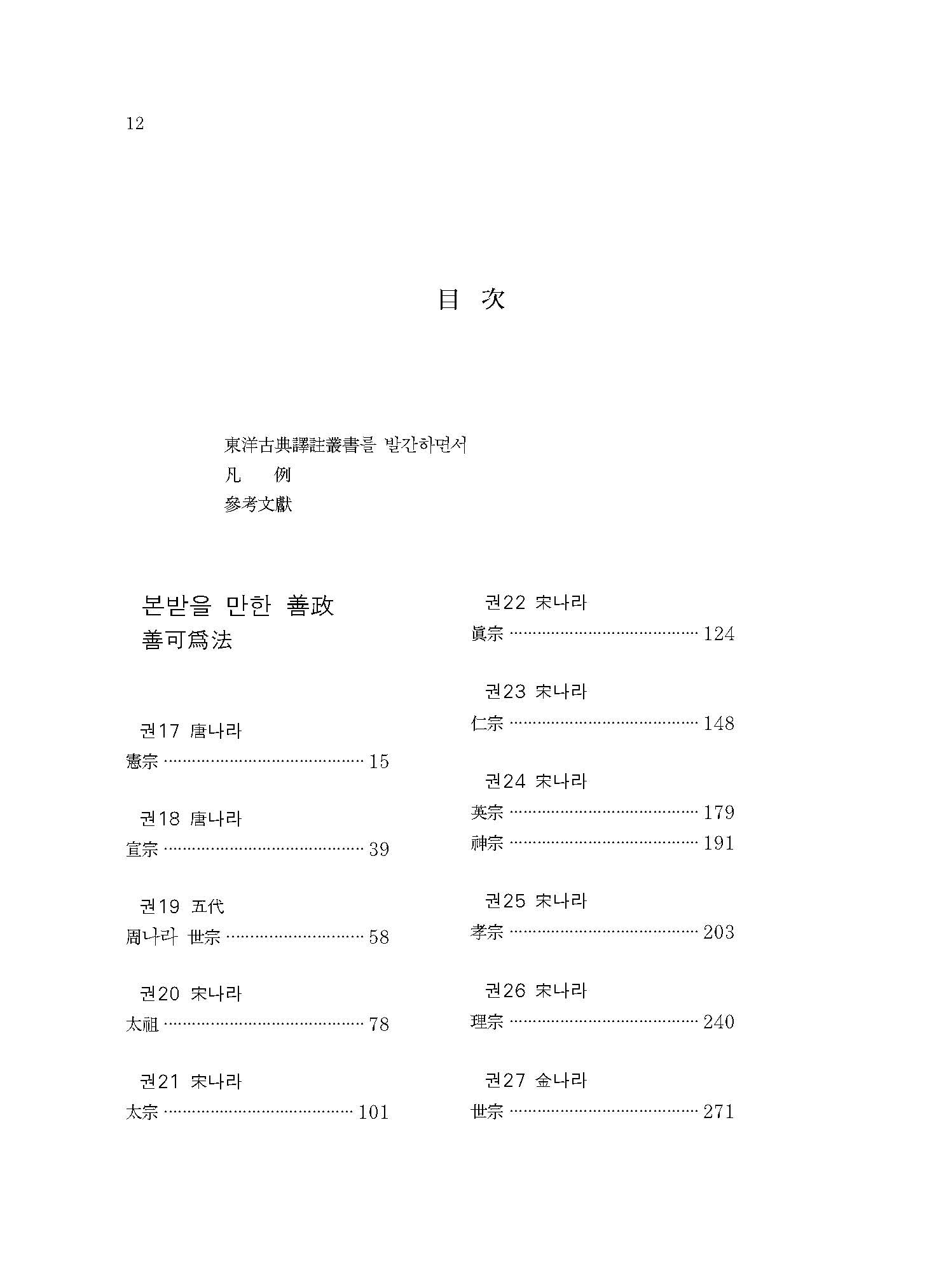 송宋나라 시기에는 북송北宋의 태조太祖, 태종太宗, 진종眞倧, 인종仁宗, 영종英宗, 신종神宗과 남송南宋의 효종孝宗, 이종理宗의 선정善政을 다루고 있다. 우선 창업군주인 태조가 백성들 위해 근검절약하고 천하 통일에 이바지하는 모습을 그리고 있다. 태종에서 인종까지는 나라가 안정되고 제도가 정비되면서 뛰어난 인재들이 등장하여 국력의 절정기를 맞이하는데, 여기서는 이들의 공손하고 검소한 행실과 어질고 관대한 정사를 다루고 있다. 또한 개혁의 시기였던 영종英宗과 신종神宗의 정사를 아쉽게 바라보고 있으며, 정강靖康의 변으로 남쪽으로 천도한 이후 국가의 안정에 힘쓴 효종과 그 사이에 등장한 주희朱熹, 그리고 성리학性理學을 중시한 이종의 행적을 그리고 있다.