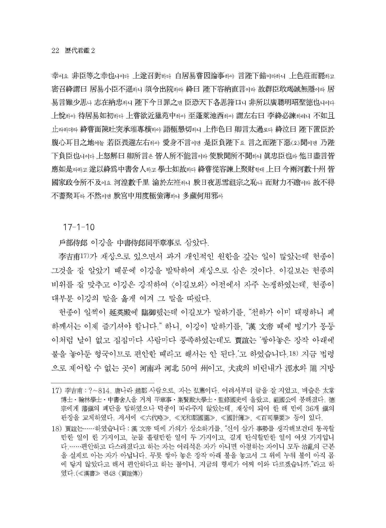 ≪역대군감 1≫은 ‘선가위법善可爲法’에 해당하는 부분으로 상고시대 삼황오제三皇五帝부터 당 태종唐太宗까지 38명의 군주를 대상으로 하였다. ≪역대군감 2≫ 역시 ‘선가위법’에 해당하는데, 당 헌종부터 명 태조까지 15명의 군주를 다루고 있다.