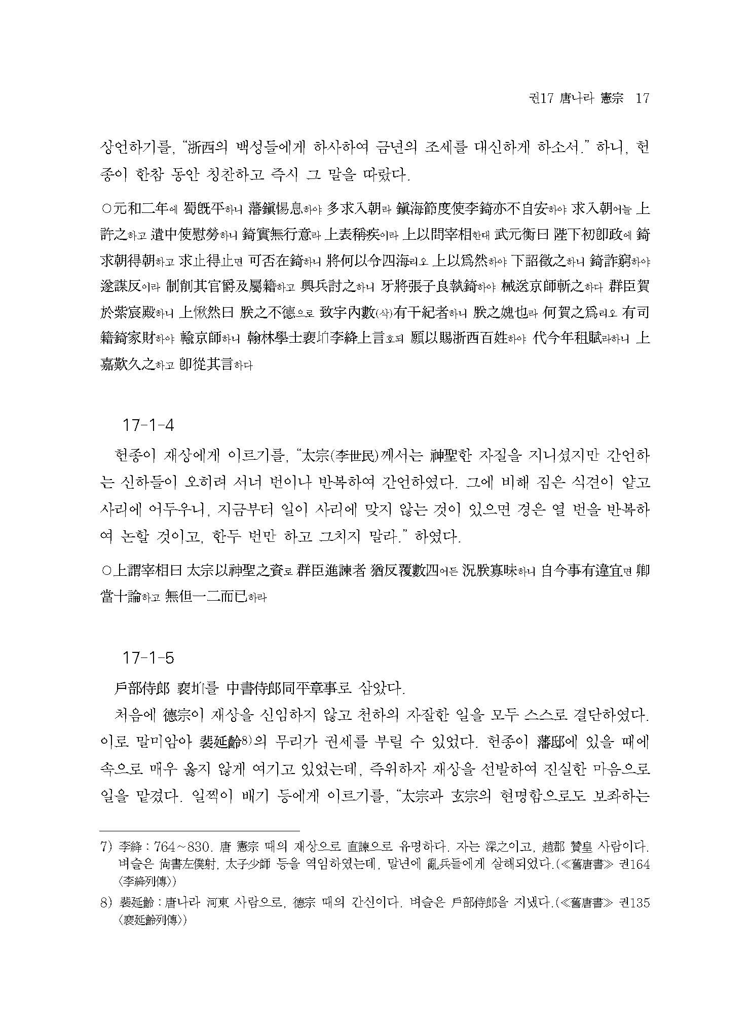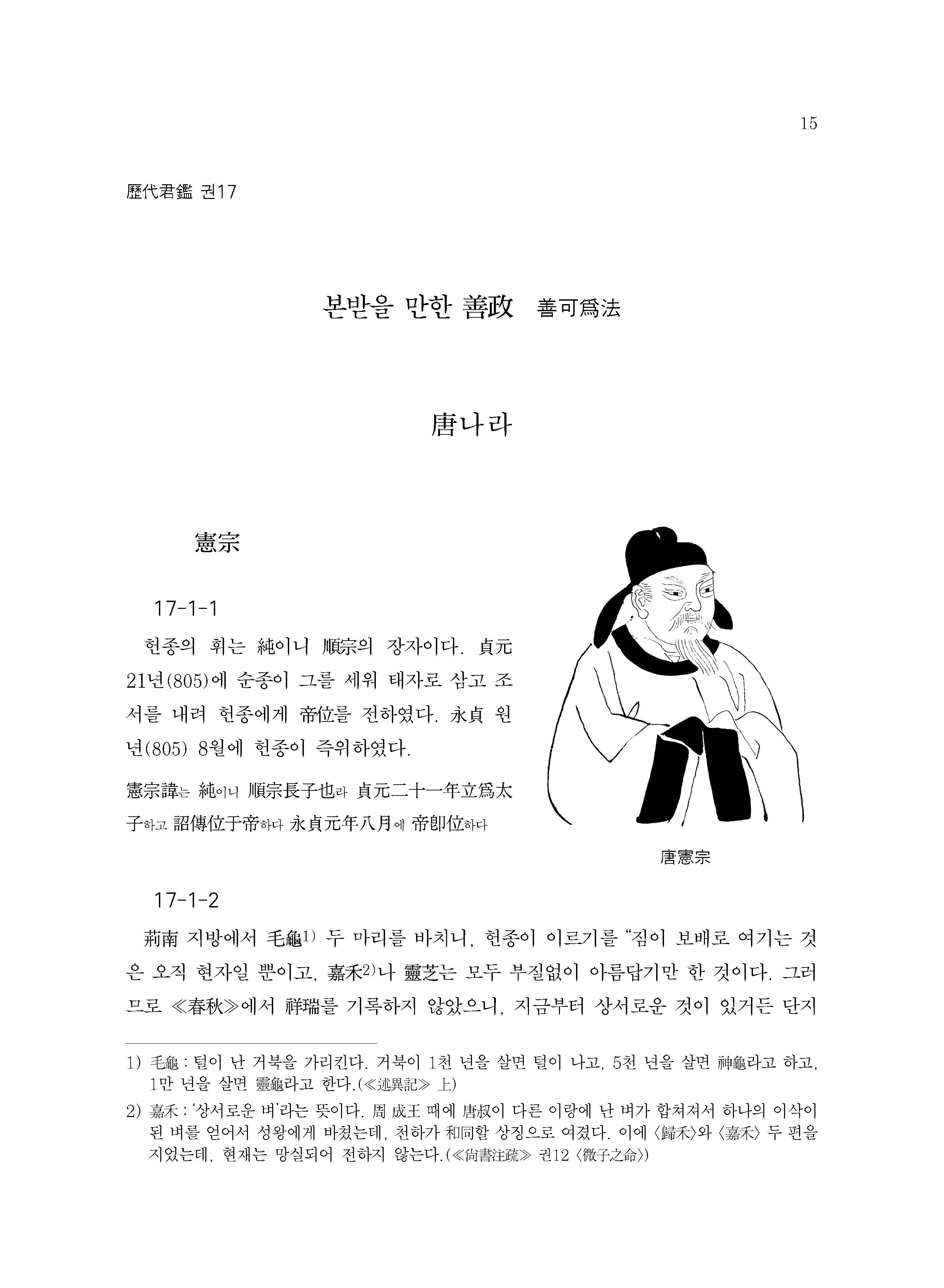 당나라 시기에서는 헌종憲宗과 선종宣宗의 치적을 이야기하고 있는데, 헌종은 안녹산安祿山의 난 이후 번진藩鎭의 발호로 어지러웠던 당나라를 중흥시킨 군주이며, 선종은 우이당쟁牛李黨爭을 종식시키고 환관 세력을 억제하고 하였던 군주이다.