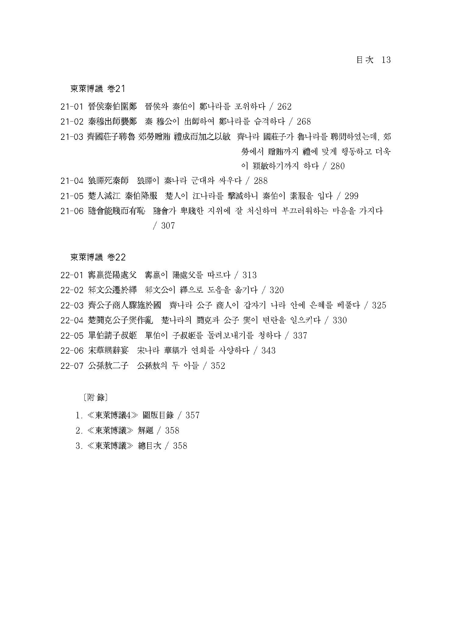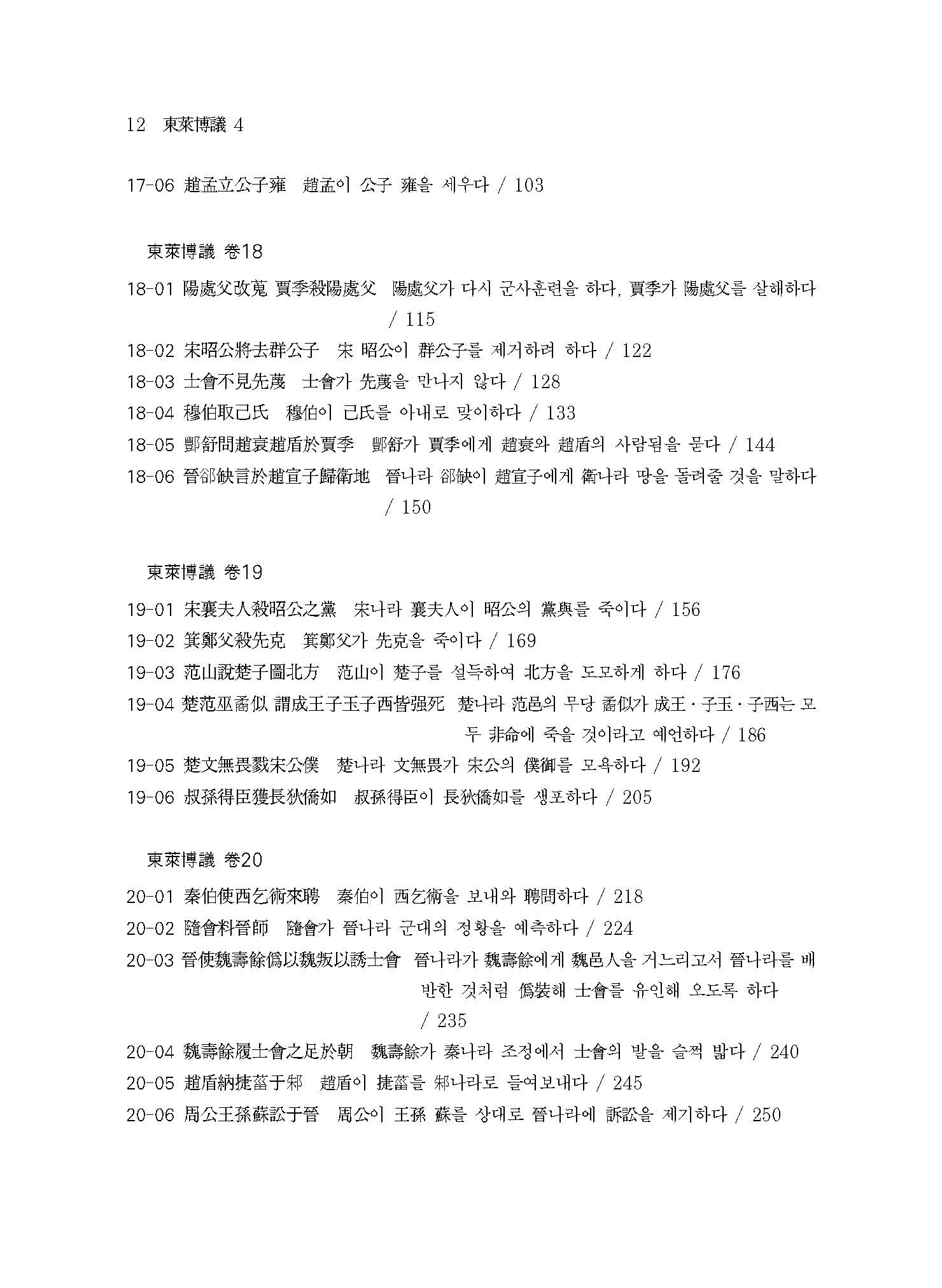 ≪역주 동래박의 4≫은 저본 16~22권까지의 내용을 담았다. 원문에는 전통 방식의 현토懸吐를 하여 단락별로 번역문과 함께 실어놓음으로써, 문장구조를 이해하기 쉽도록 하였다. 또한 역주譯註에는 관련 고사故事와 인물人物뿐만 아니라, 내용 이해에 필요한 역사적 사실이나 제도적인 면까지 심도 있게 밝힘으로써 일반 독자들도 쉽게 이해할 수 있도록 하였다.