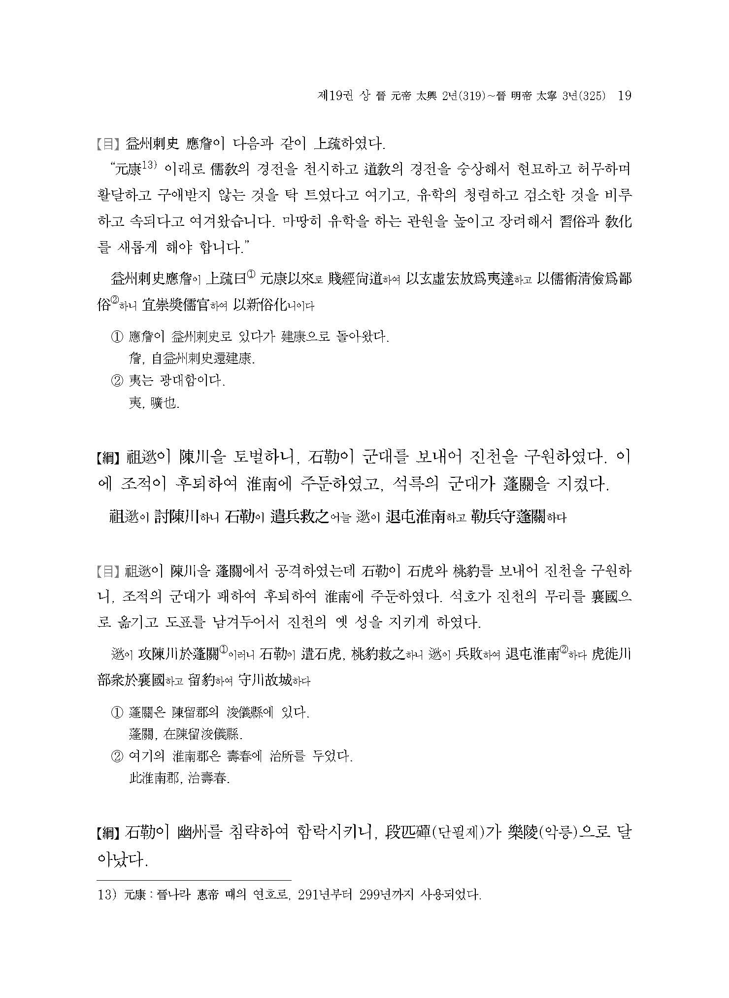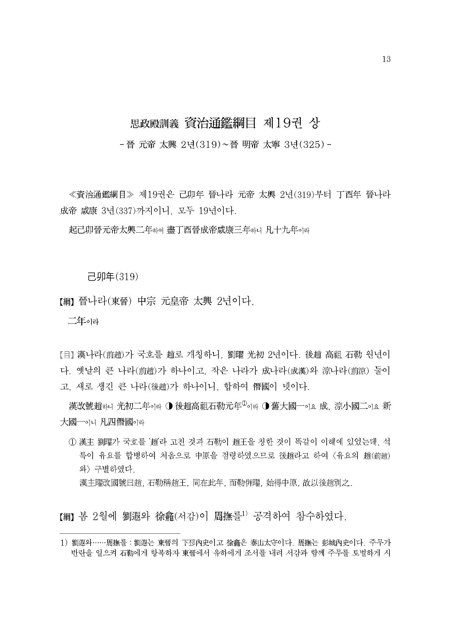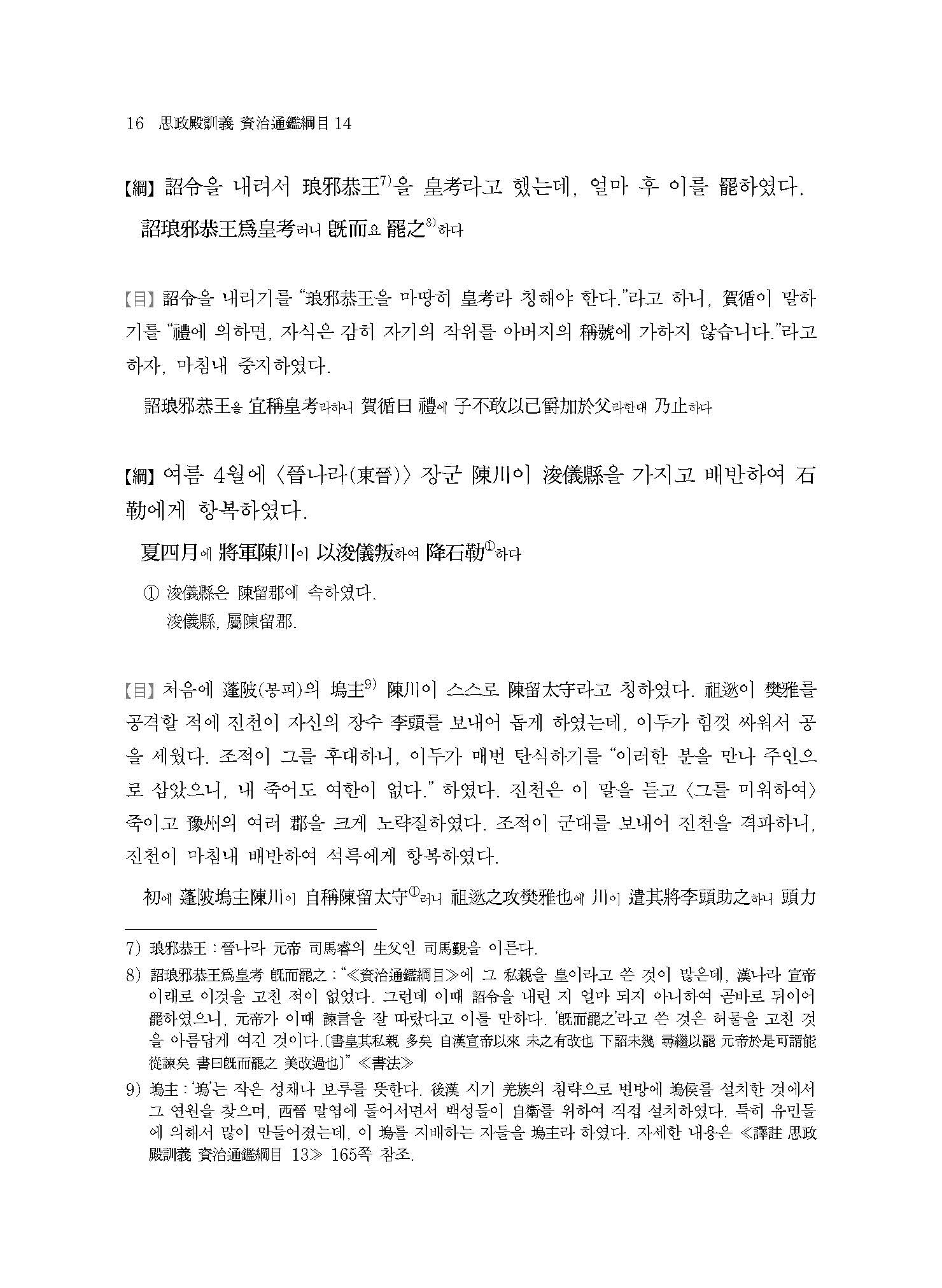 ≪사정전훈의 자치통감강목14≫는 오호십육국五胡十六國의 시대이다. 당시 한족漢族이 이민족으로 차별하던 종족들이 화북 지역을 차지하고 각자 나라를 세우게 되는데, 여기서는 흉노匈奴의 전조前趙, 갈족?族 영웅 석륵石勒이 세운 후조後趙, 선비족鮮卑族인 모용씨慕容氏의 전연前燕이 등장하여 서로 간에 혈투를 벌이게 된다.