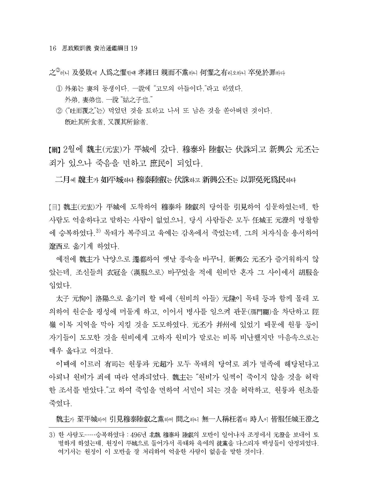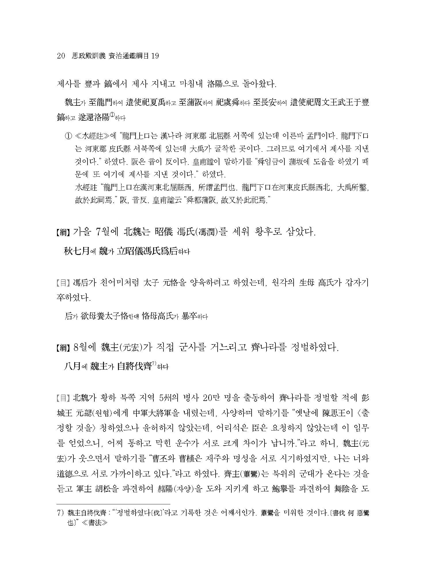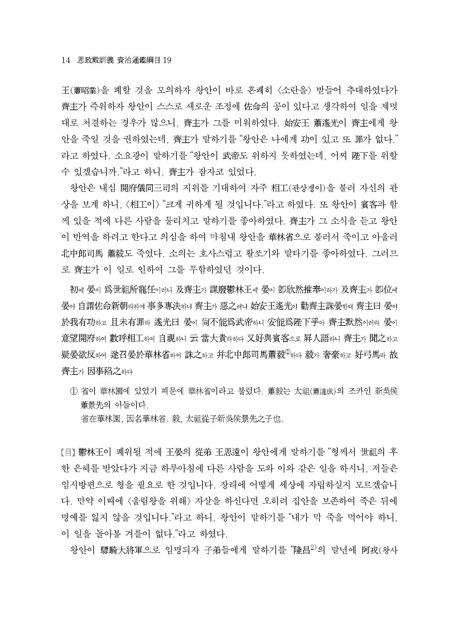 ≪사정전훈의 자치통감강목19≫는 남북조시대南北朝時代를 다루고 있다. 남조南朝는 왕조가 바뀌어 제齊나라에서 양梁나라로 바뀌게 된다. 왕조가 바뀌게 된 결정적 원인 중 하나는 황실의 골육상잔에 있다. 친족 간의 다툼은 국력의 분열을 초래하였고 결국 내란으로 이어졌다. 내란을 종식시킨 장군이 다시 왕조를 세우는 현상이 반복되면서 송宋나라에서 제나라, 다시 양나라로 바뀌게 가게 된다.