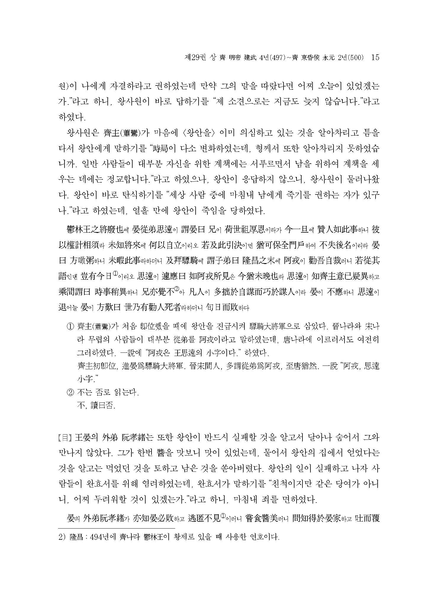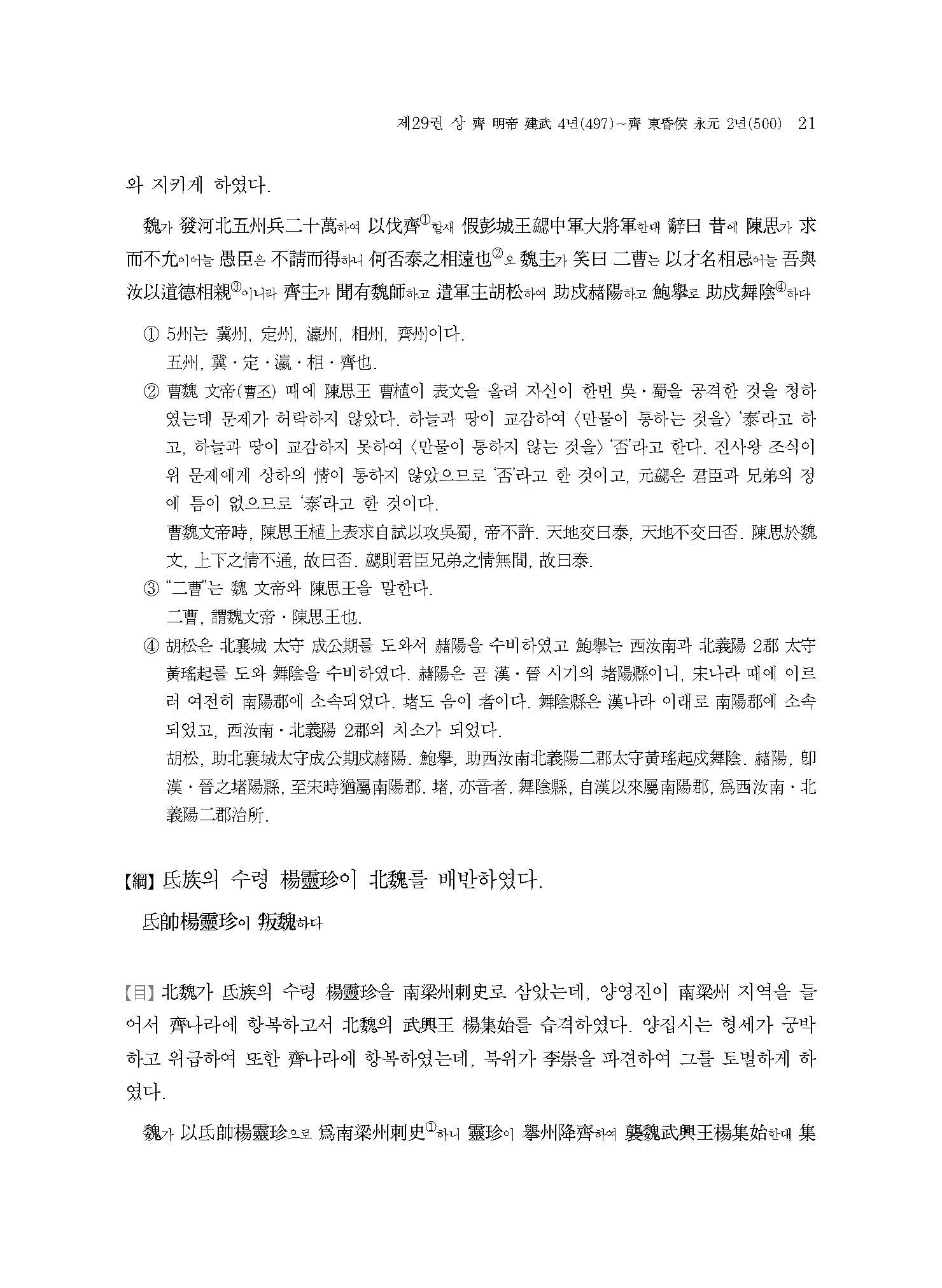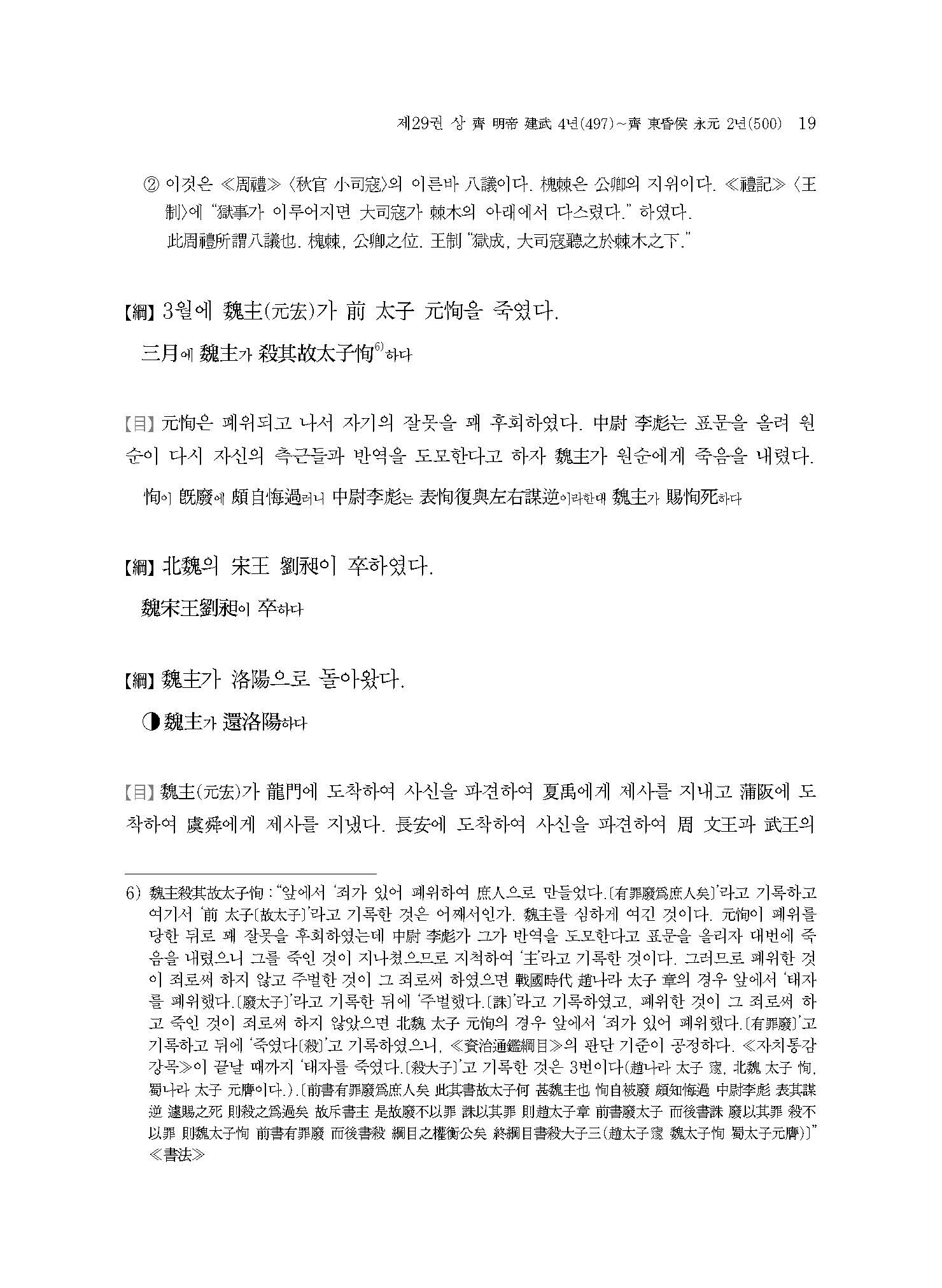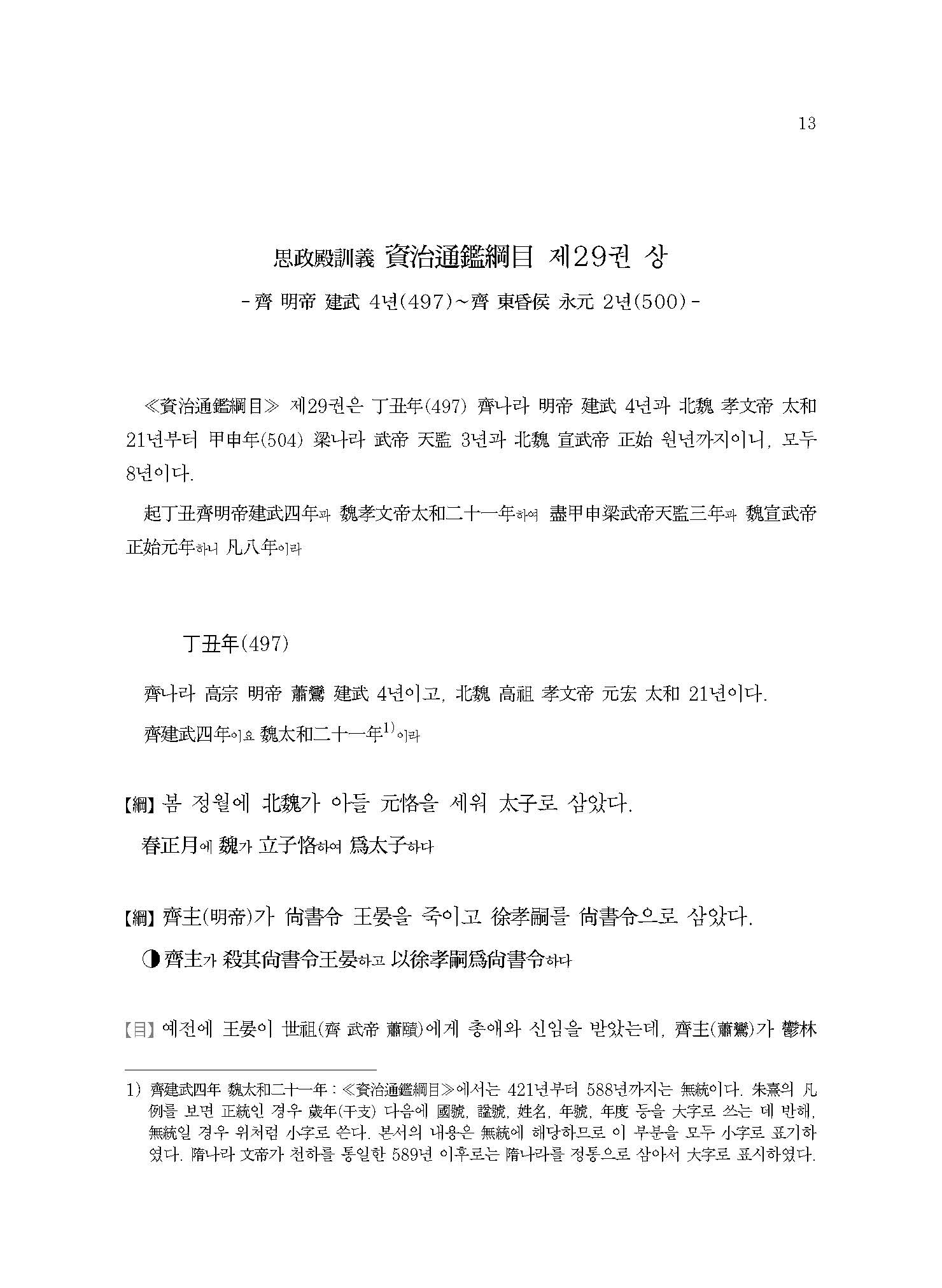 ≪사정전훈의 자치통감강목19≫는 남북조시대南北朝時代를 다루고 있다. 남조南朝는 왕조가 바뀌어 제齊나라에서 양梁나라로 바뀌게 된다. 왕조가 바뀌게 된 결정적 원인 중 하나는 황실의 골육상잔에 있다. 친족 간의 다툼은 국력의 분열을 초래하였고 결국 내란으로 이어졌다. 내란을 종식시킨 장군이 다시 왕조를 세우는 현상이 반복되면서 송宋나라에서 제나라, 다시 양나라로 바뀌게 가게 된다.