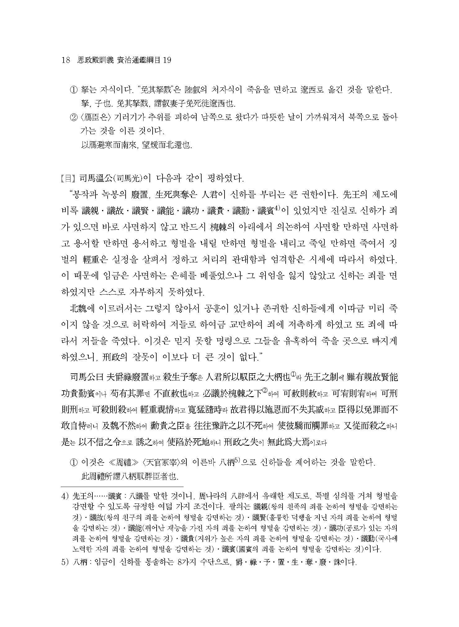 ≪역주 사정전훈의 자치통감강목≫는 모두 39책으로 간행될 예정이다. 본서는 원본의 편집 체제의 특징을 그대로 구현하고자 하였으며, 번역문은 현대적으로 표현하여 일반 독자들이 번역문만 읽어도 그 내용을 쉽게 이해할 수 있게 하였다. 또한 번역문 아래 원문을 함께 실어놓았으며 원문에는 원문의 문장구조를 한국적인 방식으로 이해하는 데 도움이 되도록 우리나라 전통적 방식의 현토懸吐를 하였을 뿐만 아니라 교감을 하여 학술적 연구에 도움을 주고자 하였다.