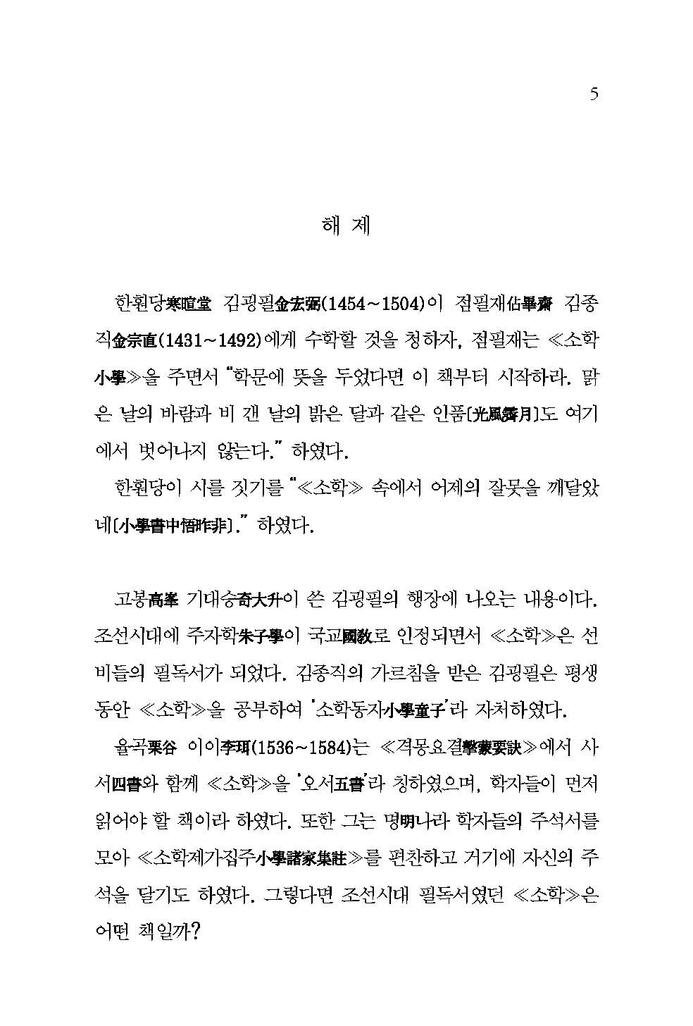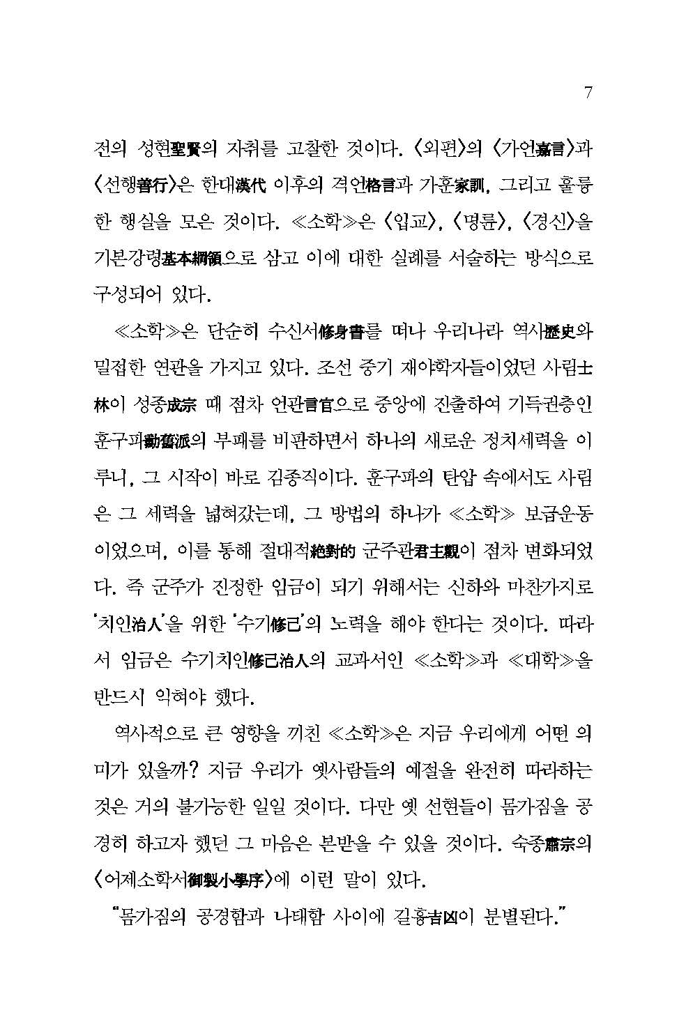 지금 우리가 ≪소학≫ 속 옛사람들의 행실을 완전히 본받는 것은 거의 불가능한 일일 것이다. 다만 옛 선현들이 몸가짐을 공경히 하고자 했던 바를 통해 자신을 성찰하고 그들의 마음가짐만은 본받을 수 있을 것이다.