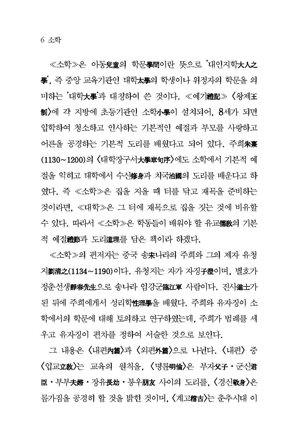 ≪소학≫의 구성은 <입교>, <명륜>, <경신>을 기본강령基本綱領으로 삼고 이에 대한 실례를 <계고>, <가언>, <선행>에서 서술하였다.