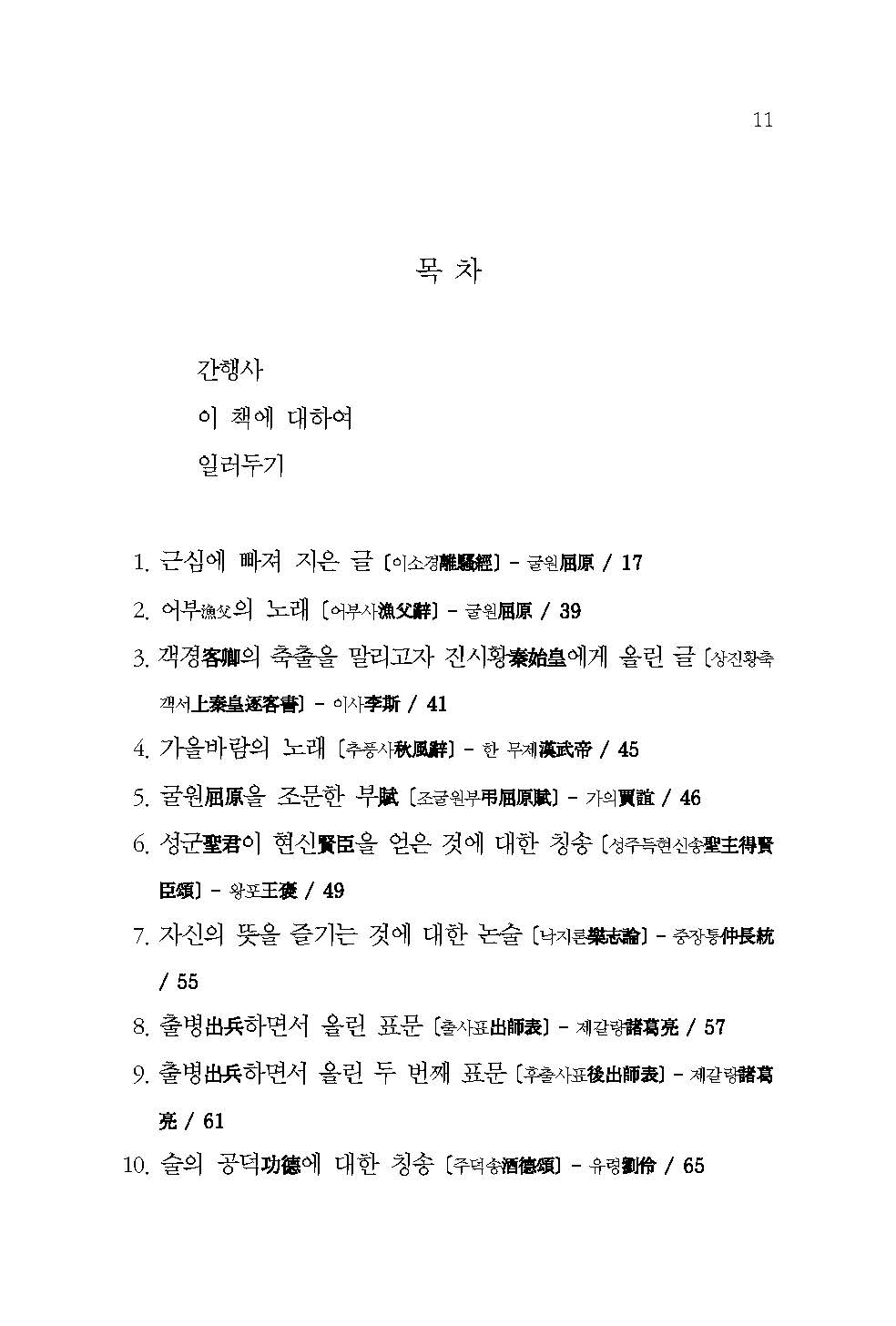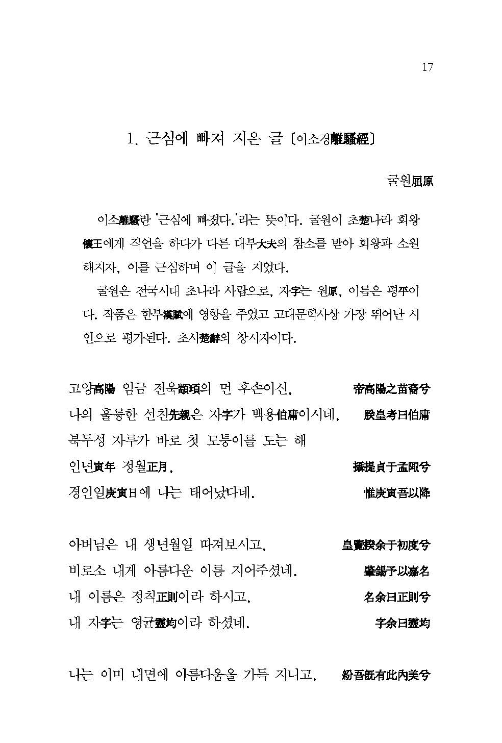 “임금님은 내 마음 살피지 않으시고, 도리어 참소를 믿어 진노하시네. 내 실로 직간直諫이 화禍가 될 줄 알지만,차마 그만둘 수 없도다.”(<이소경離騷經>) 속에서 근심에 빠진 굴원屈原의 비분강개를 느껴보기도 하고, <어부사漁父辭> 속 어부의 노래에서 그 시름을 잊게 된다.