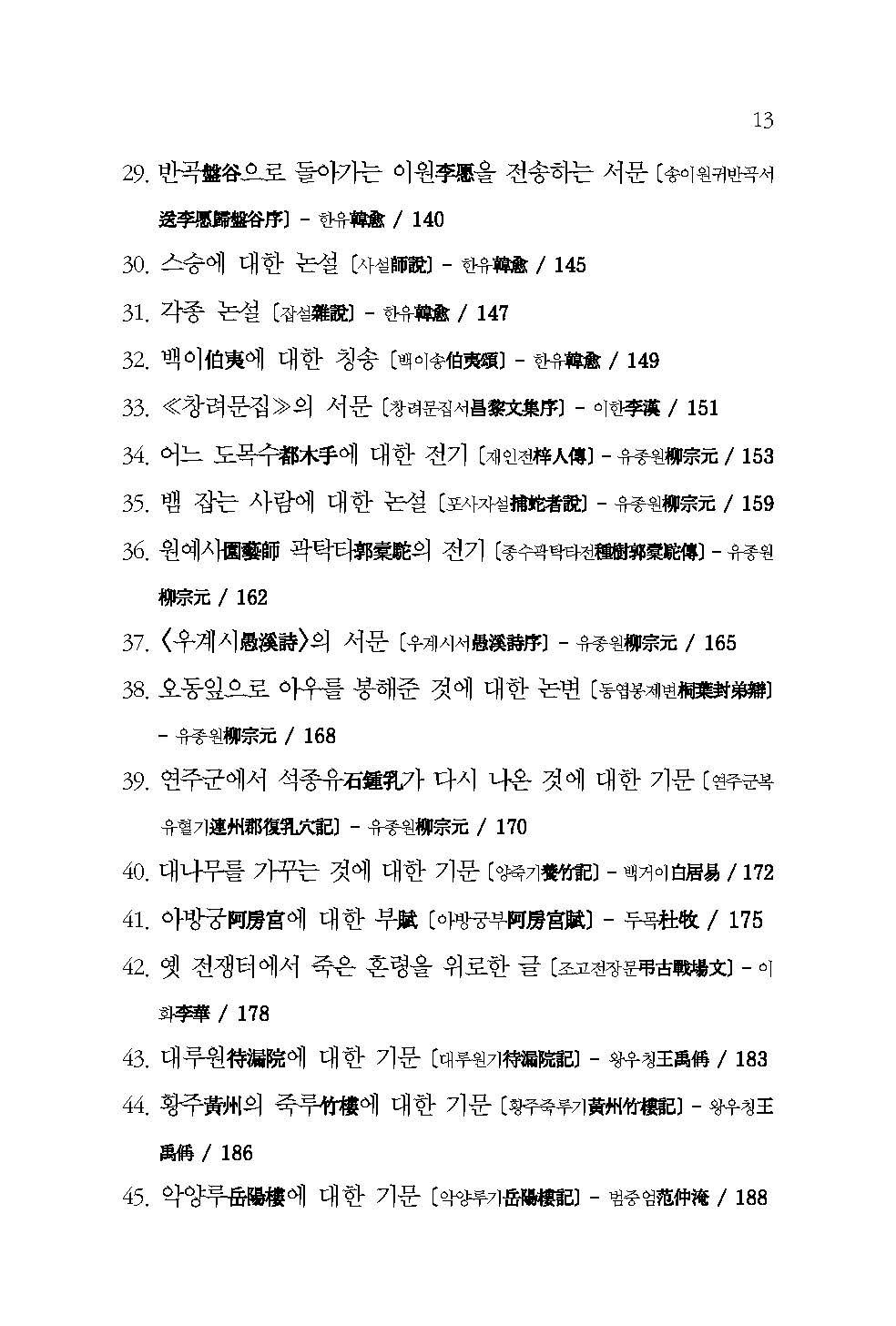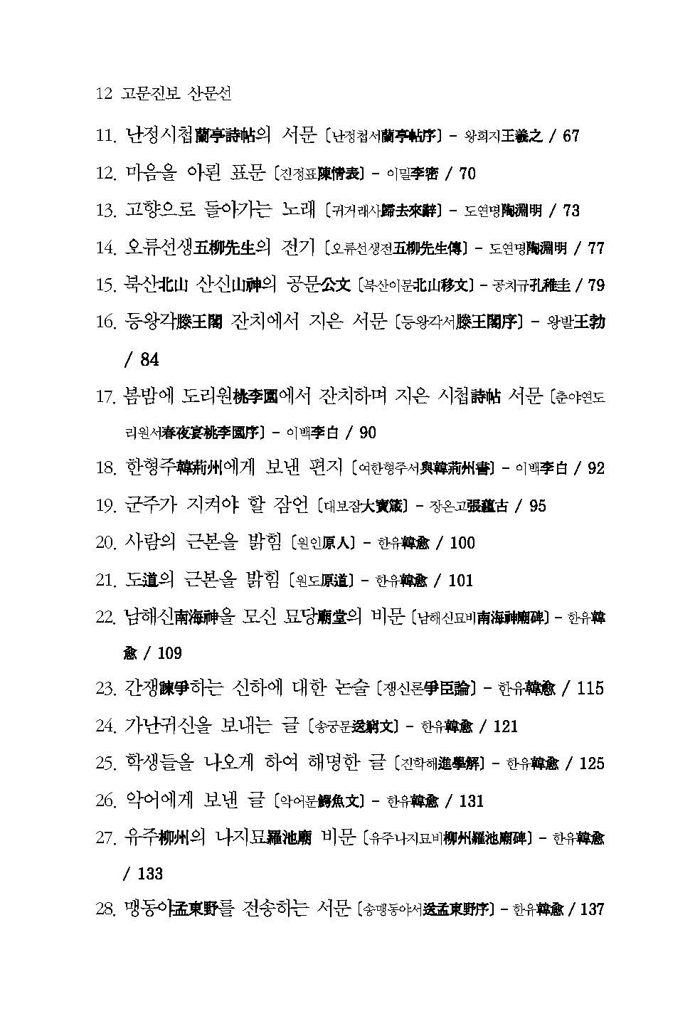 <주덕송酒德頌>을 읽으며 술 한 잔으로 잠시 인생의 시름을 잊기를 바라며, <귀거래사歸去來辭>를 통해 전원생활의 즐거움을 꿈꿔본다. <원인原人>과 <원도原道>를 보며 사람이란 무엇이며 도道란 무엇인지 철학적 사색에 빠져보다가, <적벽부前赤壁賦>를 읽으면 달빛 아래 뱃놀이를 즐기며 인생의 무상함을 느끼는 나 자신의 모습을 발견하지 않을까?