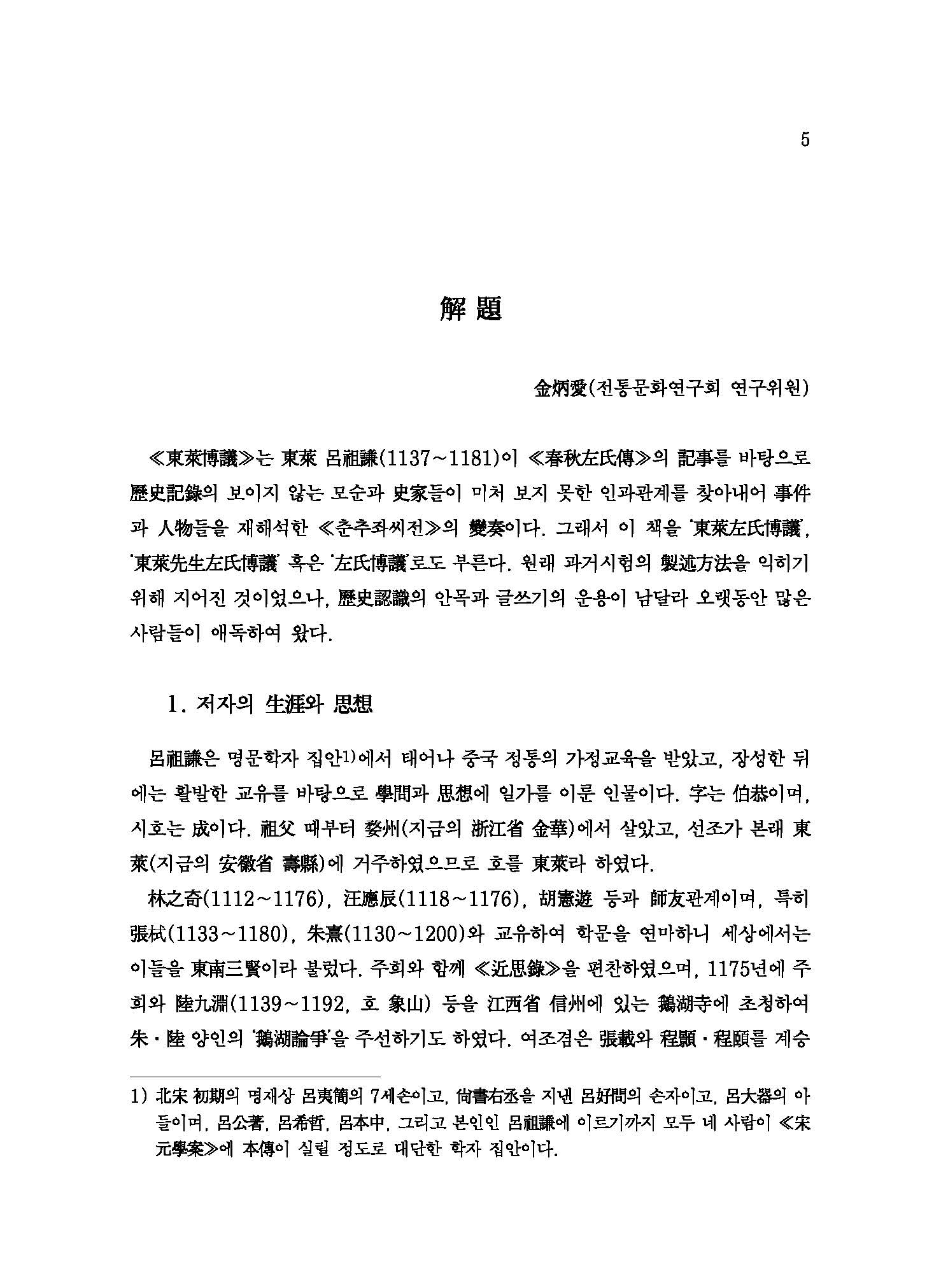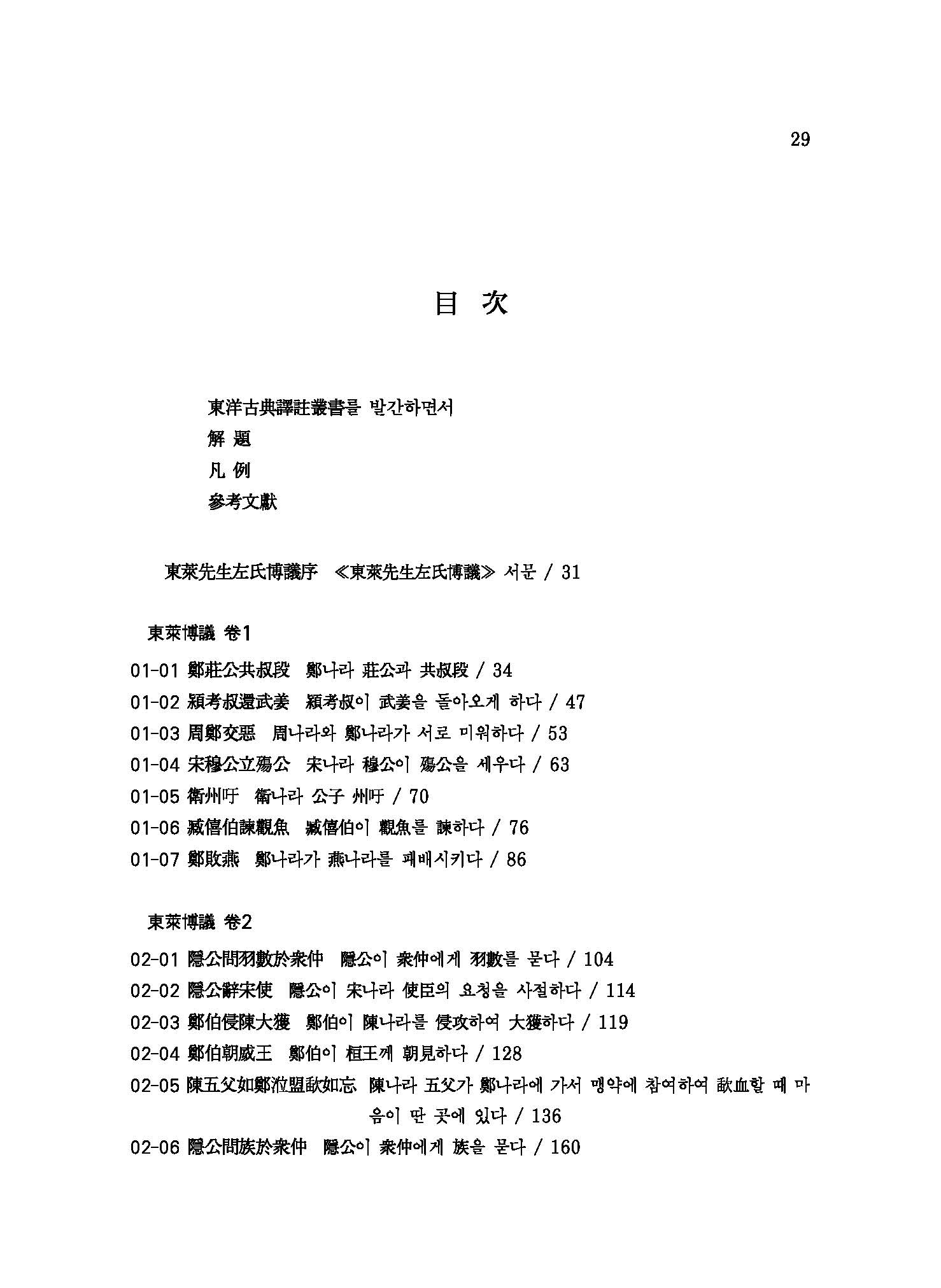 ≪역주 동래박의≫의 저본底本은 중종中宗 때 간행된 을해자본乙亥字本 ≪신간상증보주동래선생좌씨박의新刊詳增補註東萊先生左氏博義≫(전25권)로 국내에는 완본完本이 없고 일본 궁내청宮內廳 서릉부書陵部에 소장되어 있다. 본 역주서는 궁내청 서릉부본을 저본으로 삼아 그 본문과 주석註釋을 국내 처음으로 완역한 것으로, 5책으로 간행될 예정이다. 이 책은 또한 본회에서 완역完譯한 ≪춘추좌씨전≫의 대표적 평론서로서 노魯나라 은공隱公에서 선공宣公까지 중요 기사記事를 뽑아 그 역사적 득실得失을 논하였다는 점에서 의미가 크다.