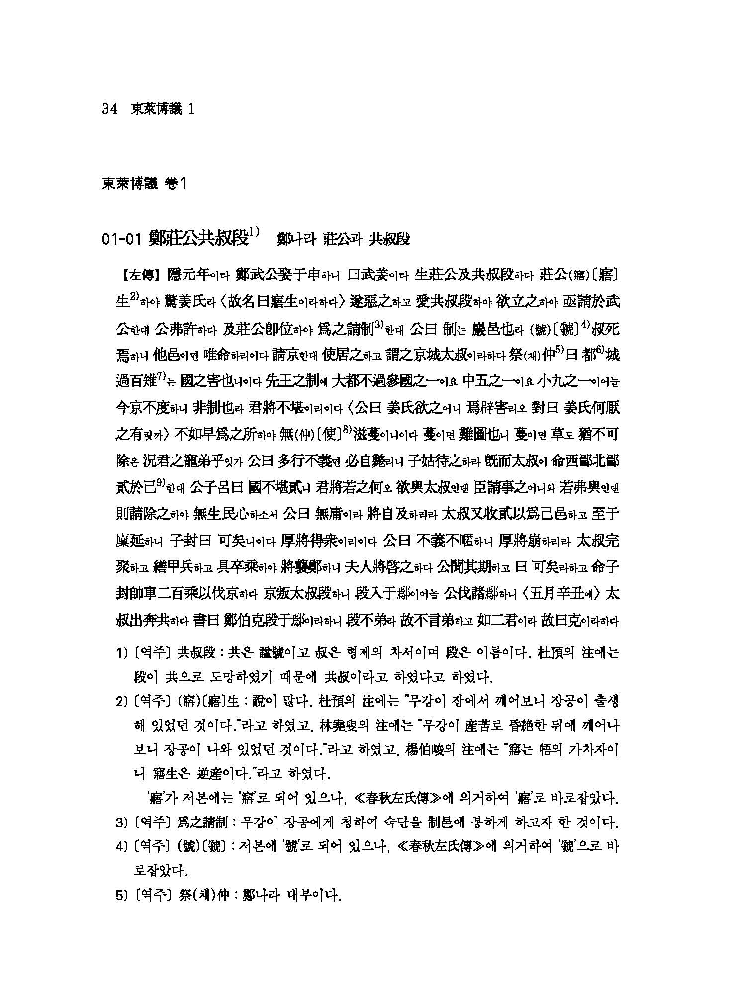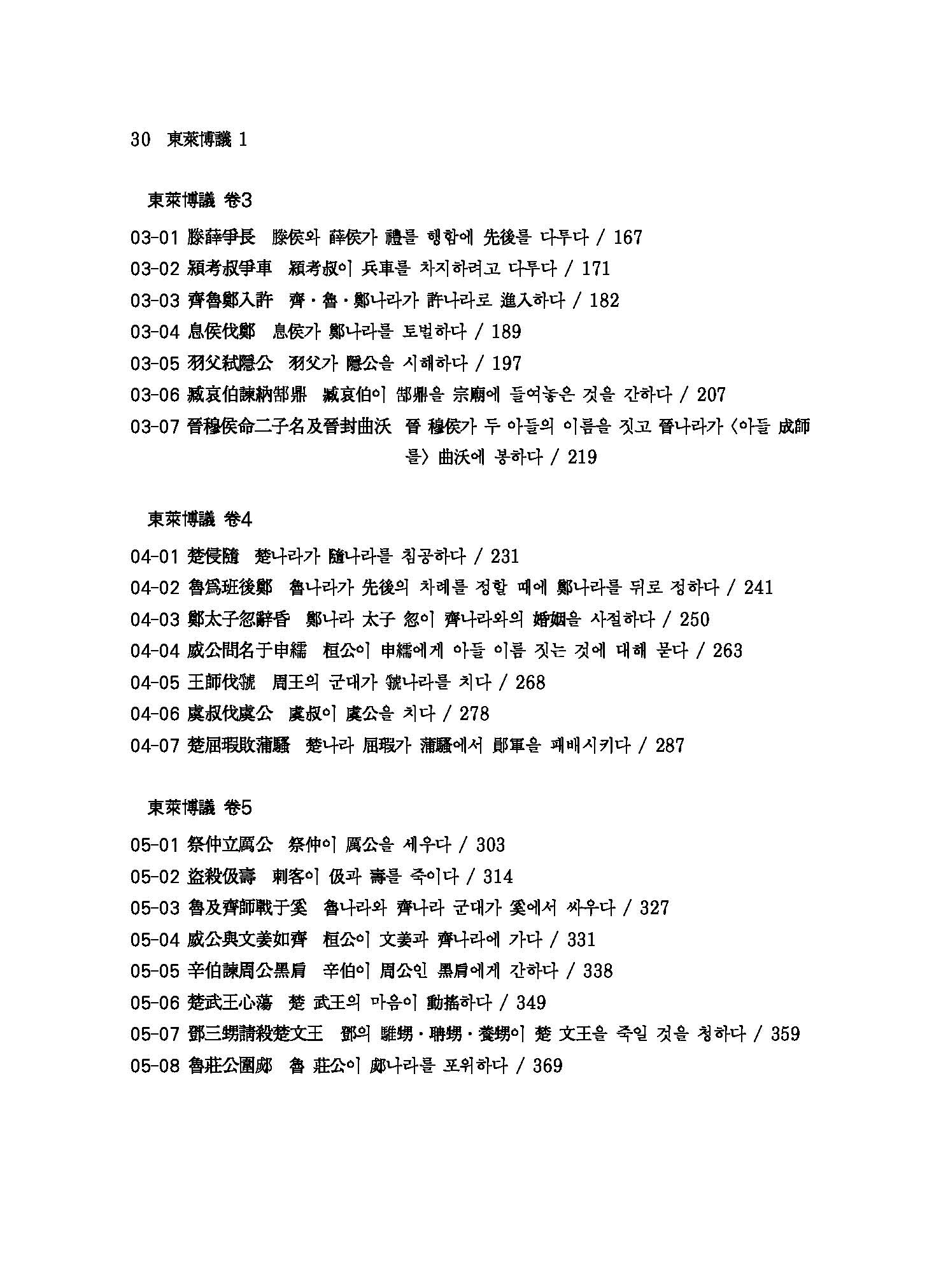 ≪역주 동래박의 1≫은 저본의 1~5권까지 내용을 담았다. 이는 ≪춘추좌씨전≫ 중 은공隱公에서 장공莊公 8년까지 해당되는 35개의 기사 뽑아서 평론을 달은 것이다. 원문에는 전통적인 방식의 현토懸吐를 하여 단락별로 번역문과 함께 실어놓음으로써, 원문의 문장구조를 이해하기 쉽도록 하였다.