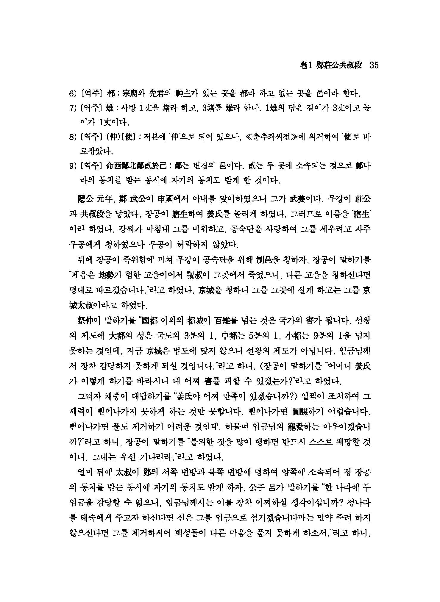정 무공鄭武公의 아내는 무강武姜으로, 그녀는 장공莊公과 공숙단共叔段을 낳았다. 장공이 태어날 때 그녀를 크게 놀라게 해서 평생 그를 싫어하였다. 장공이 무공의 지위를 계승하자 그녀는 사랑하는 아들 공숙단과 짜고 장공을 해치려고 하였다. 장공은 이를 눈치 챘으나 신하들이 간언諫言에도 불구하고 그대로 두었다. ≪춘추좌씨전≫의 기록만 보면 장공은 관대하고 의로운 군주君主처럼 보인다.