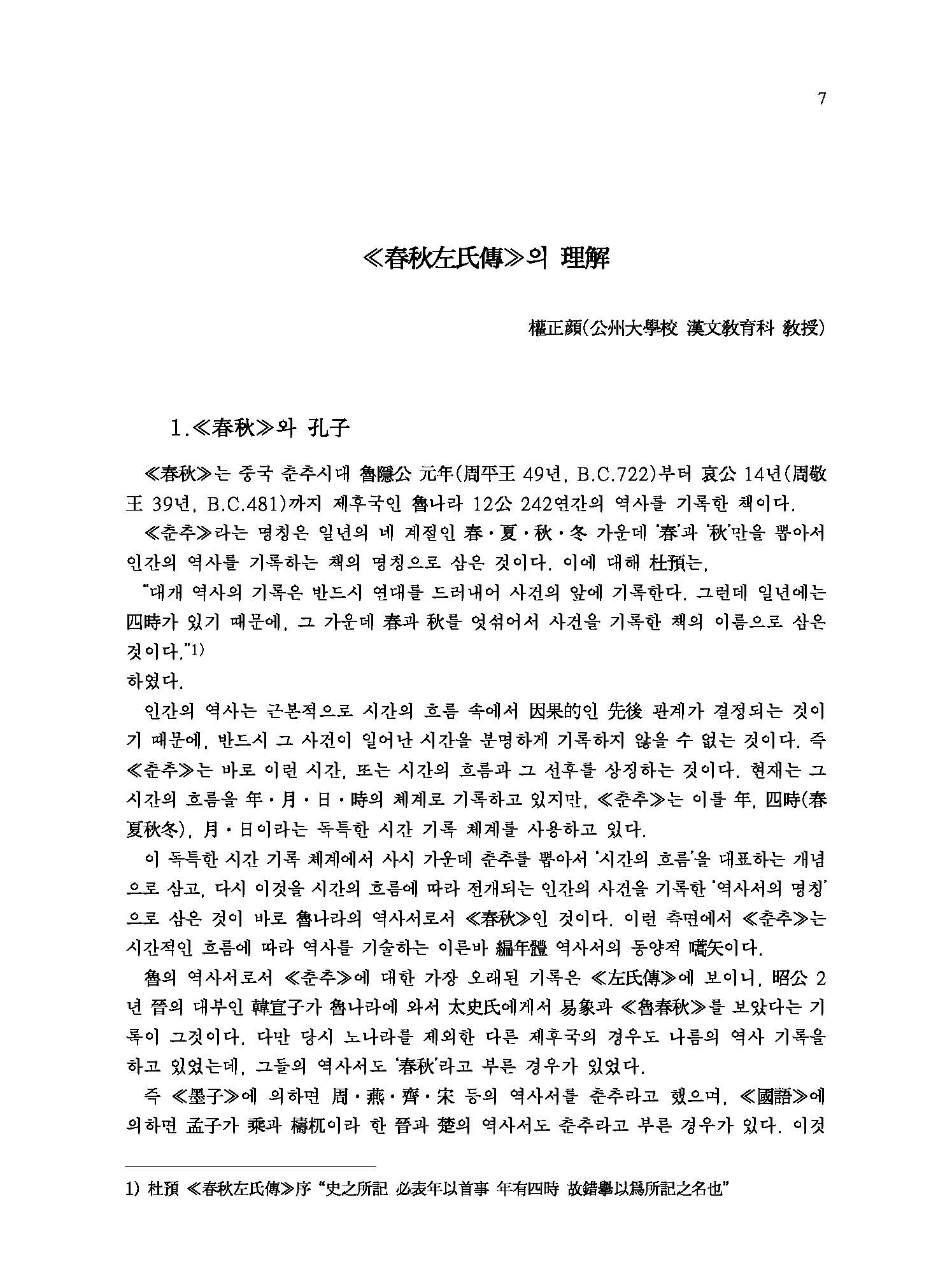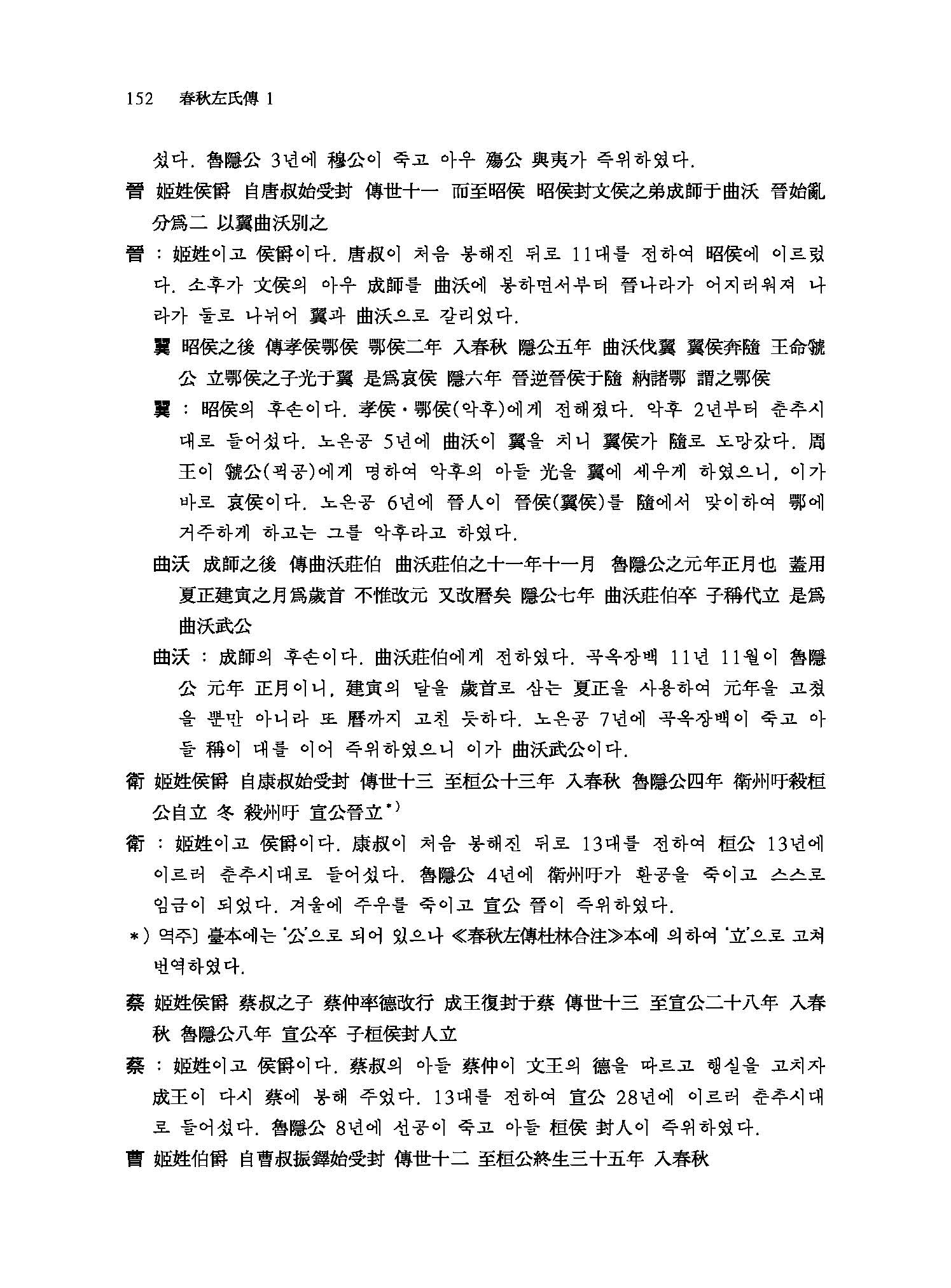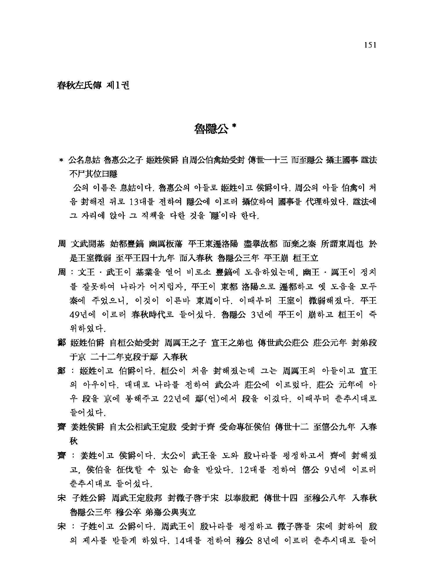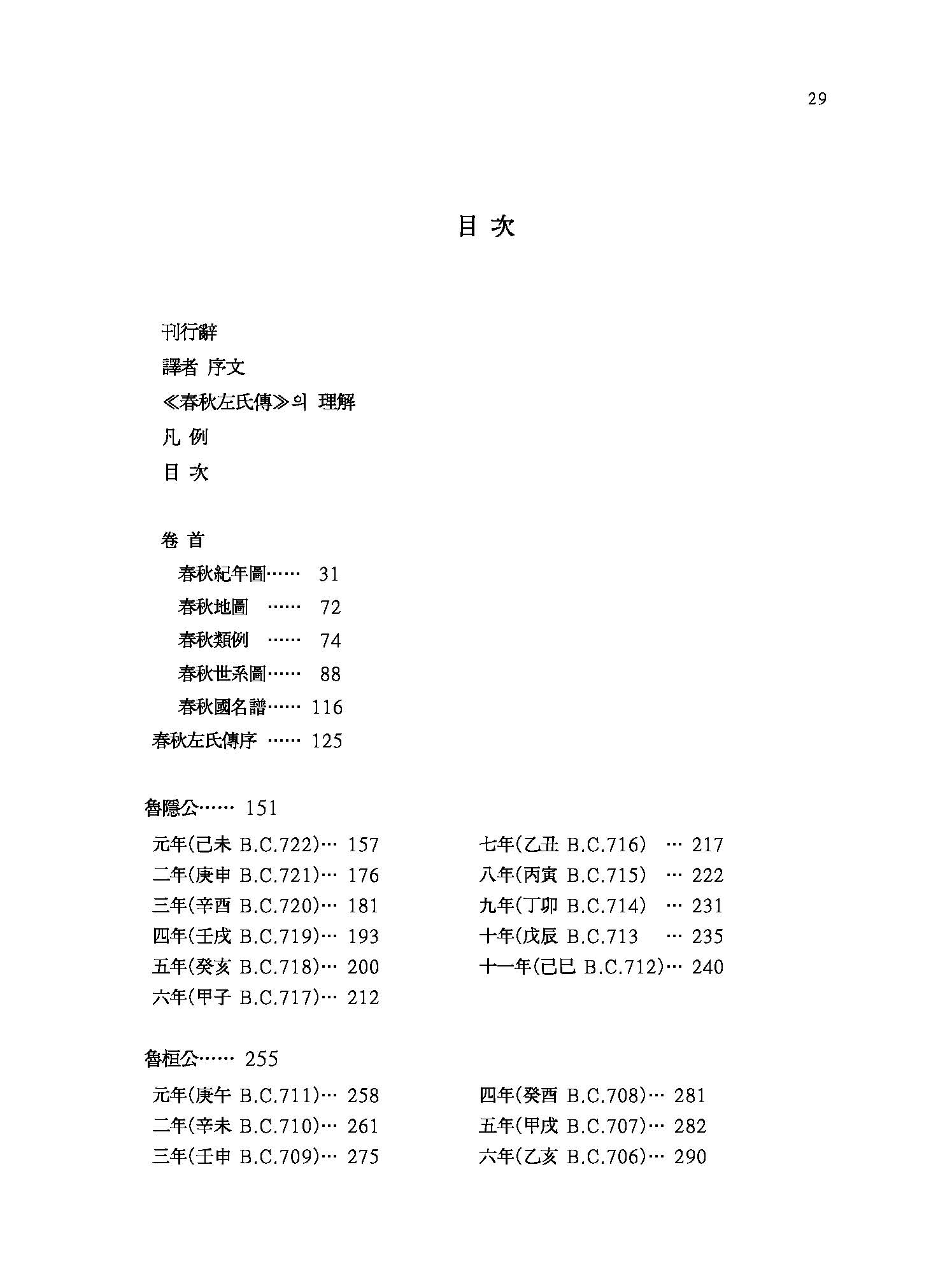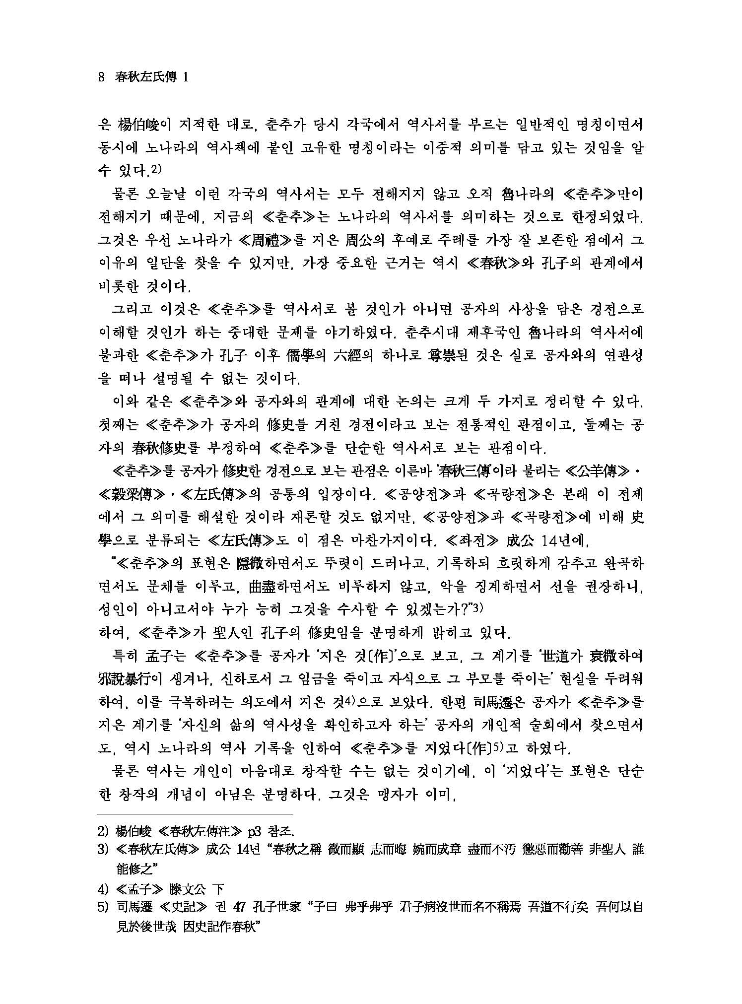 본래 ≪春秋≫는 魯나라 隱公 원년(元年 B.C. 722년)에서 哀公 14년(B.C.481년)까지 2백 42년 동안의 노나라의 歷史書를 孔子가 다시 수정하여 편찬한 책으로, 춘추란 이름은 春夏秋冬 사계절 가운데서 ‘春’과 ‘秋’만 따서 1년간의 年代記라는 뜻으로 사용되었다. 역사를 기록하면서 숨기거나 거리낌 없이 嚴正한 입장에서 直筆하는 것을 ‘春秋筆法’이라는 말이 ≪春秋≫에서 유래된 것이다. ≪춘추≫의 經文은 글이 매우 간략하고 표현이 추상적이어서 그 뜻을 해설한 傳이 없이는 도저히 본의를 해득할 수 없기 때문에 ≪春秋左氏傳≫,≪春秋公羊傳≫,≪春秋穀梁傳≫등 이른바 ‘春秋三傳’이 나오게 된 것이다. 이 三傳 가운데 ≪공양전≫과 ≪곡량전≫은 문답 형식으로 經文의 서법을 설명한데 반해 ≪좌씨전≫은 사건의 전말을 구체적으로 서술하고 아울러 서법까지 설명하고 있다. 그래서 後漢 학자 桓譚의 말처럼 ≪춘추≫ 경문과 ≪좌씨전≫은 마치 옷의 안감과 겉감처럼 表裏를 이루어 경문만 있고 이 傳이 없으면 아무리 聖人이라도 십 년 동안 문을 닫고 연구해도 알 수 없을 것이라는 평가를 받아오고 있다. 이 ≪좌씨전≫에 대한 註釋書는 수없이 많으나, 그 중에서도 晉나라 두예(杜預)의 注, 唐나라 공영달(孔穎達)의 소(疏)와 근대 중국 학자 양백준(楊伯峻)의 주석이 대표적이라 할 수 있다. 번역의 臺本은 조선 世宗 때 集賢殿 學士들이 王命을 받아 두예주(杜預注)를 위주로 삼고 임요수(林堯叟)와 주신(朱申)의 설을 附注하여 편찬해 출간한 內閣本을 底本으로 삼았다. 이 번역을 위하여 韓國文集叢刊(한국고전번역원 간행)과 ≪韓國經學資料集成≫(성균관대 대동문화연구원 간행)을 참고하여 우리 나라 先學들의 註說이나 辨證을 譯註로 소개하였고, ≪春秋左傳正義≫(十三經注疏本)를 참고해 誤脫字를 訂補하였으며, 서울대학교 奎章閣 소장본인 ≪春秋經傳集解≫의 懸吐를 참고하여 經과 傳에 懸吐함으로써 原典의 이해를 도왔다.