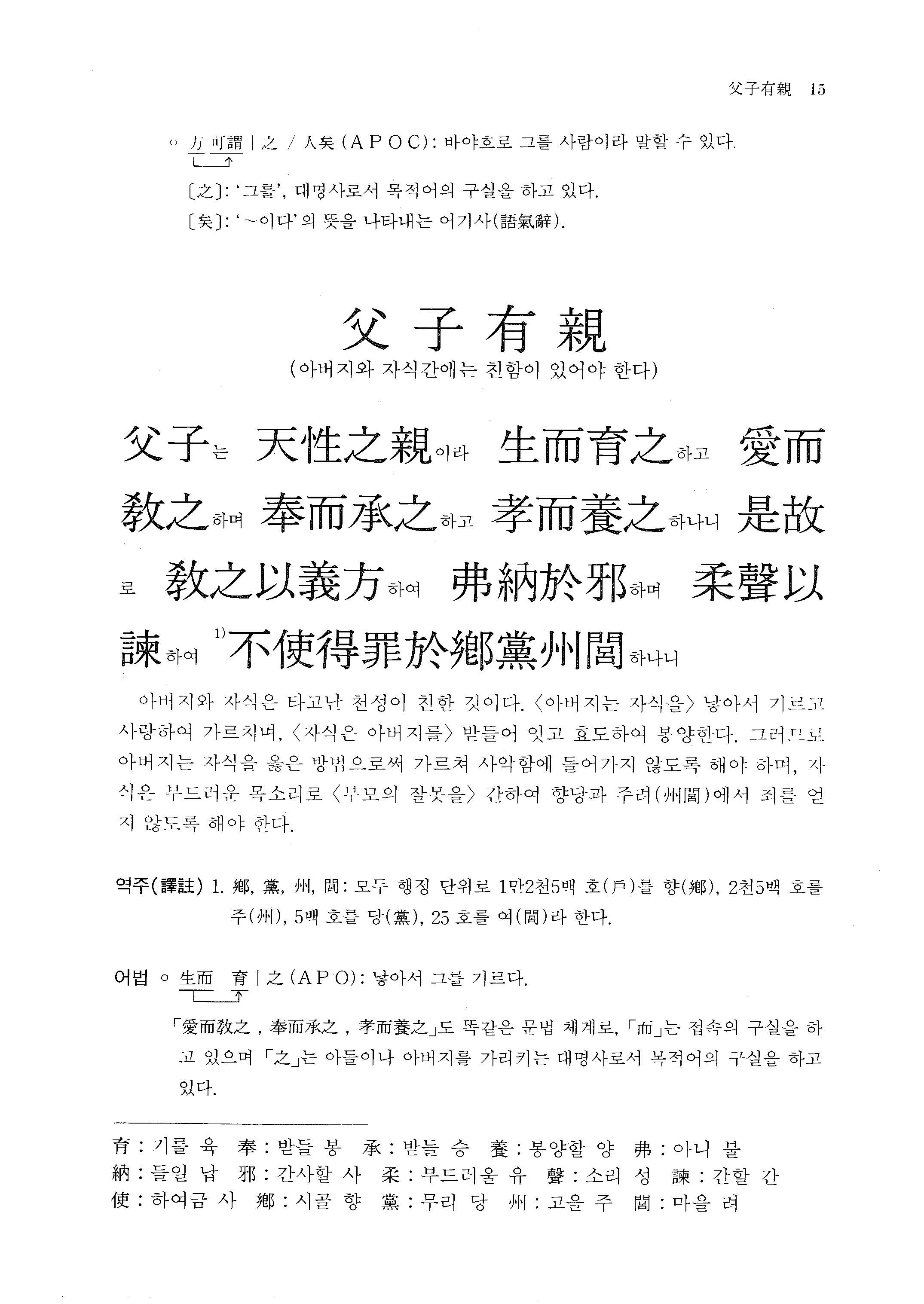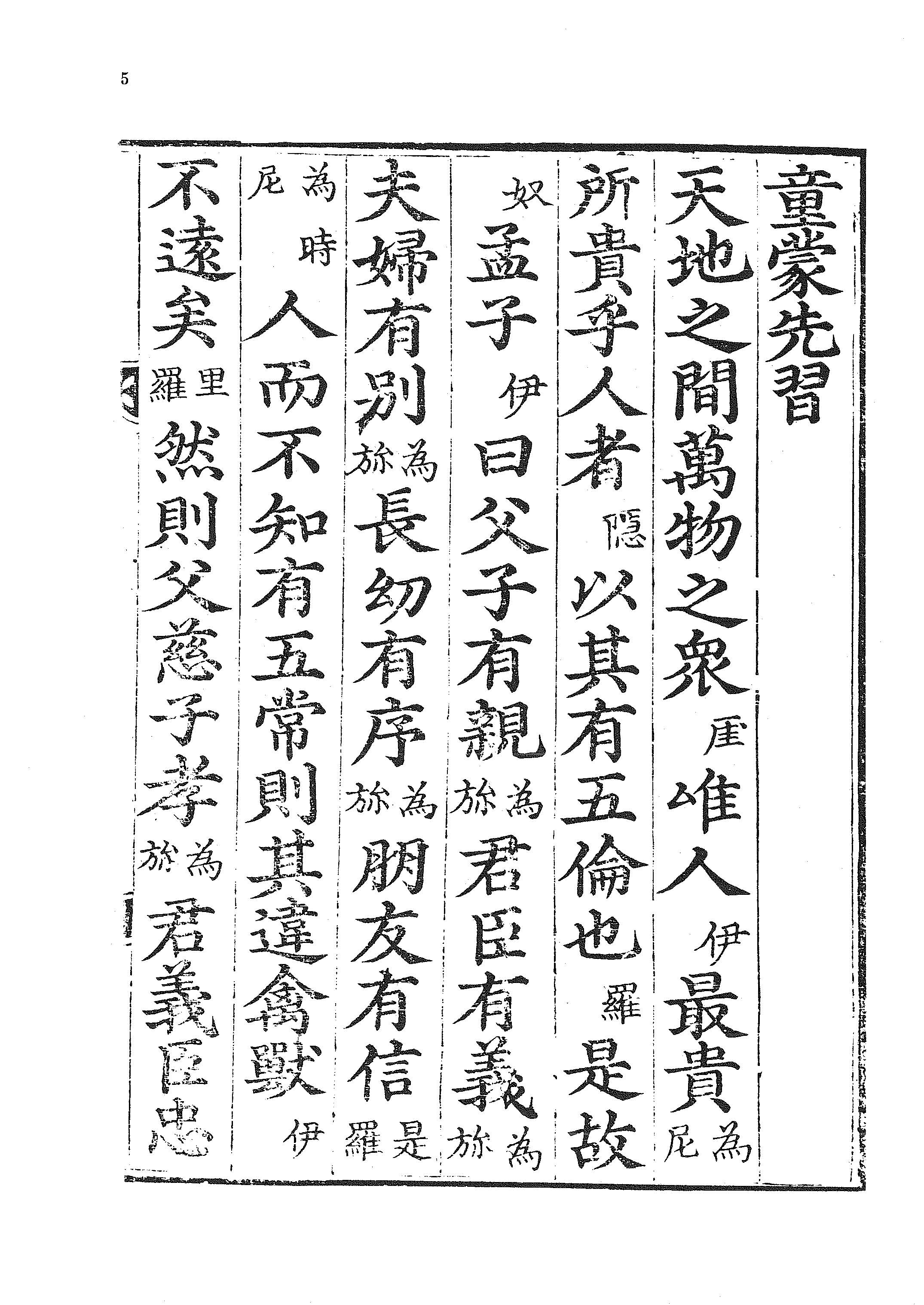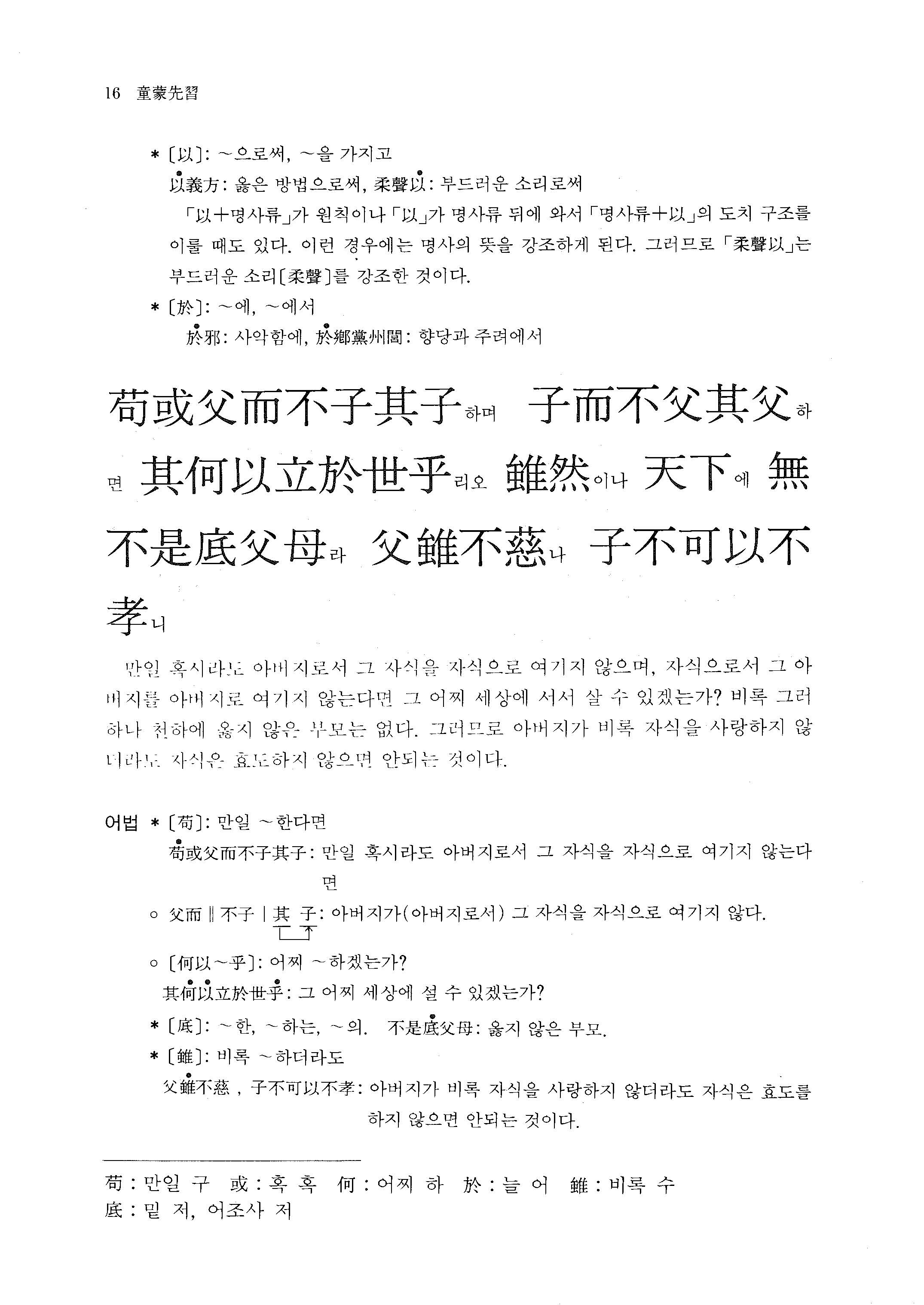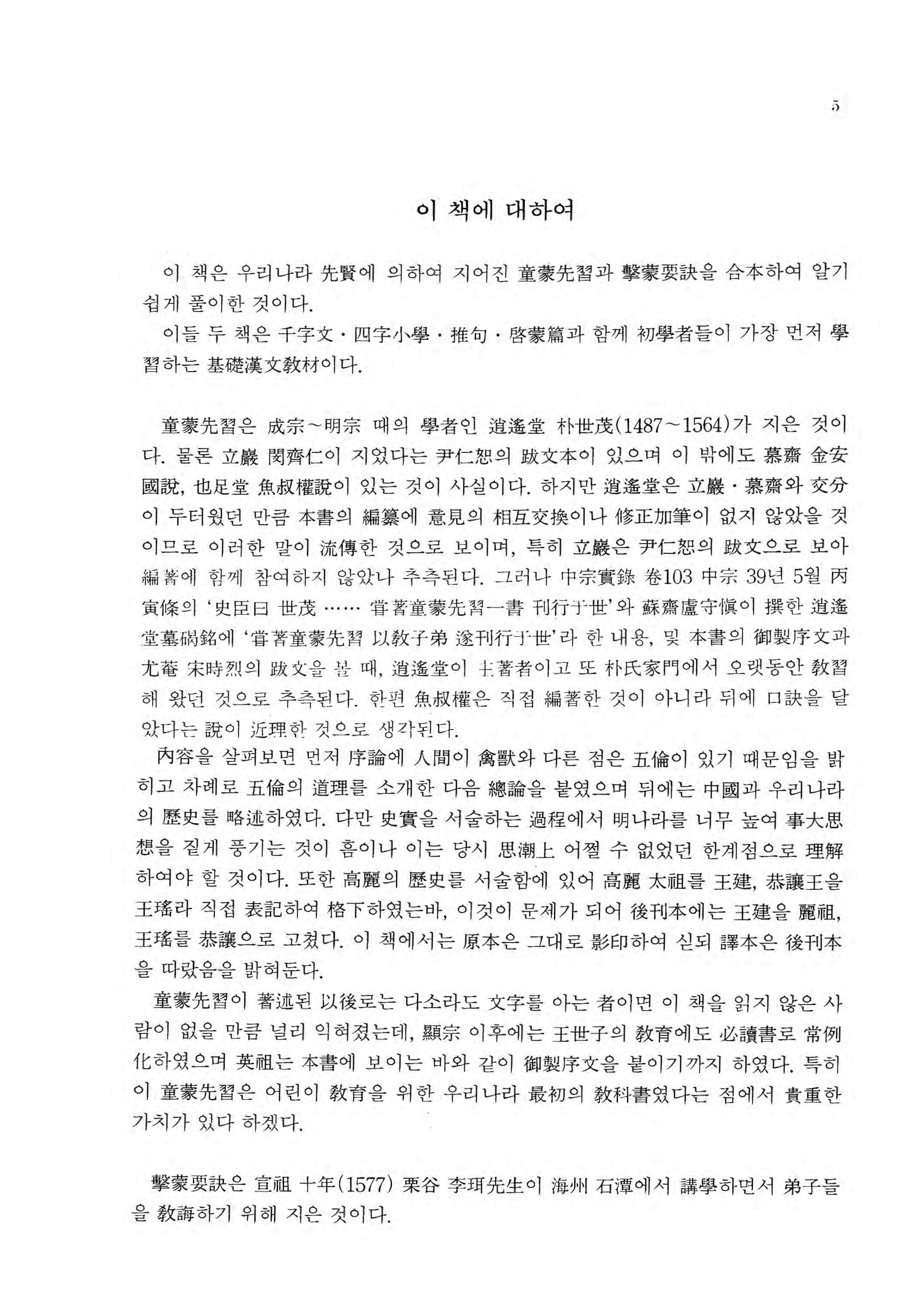 동몽선습은 어린이들에게 가장 기초적인 윤리와 역사적 정통을 가르치기 위하여 만들어진 책이다. 추구나 천자문을 통해서 글자를 조금 익히고 나면 대부분 이 동몽선습을 배우곤 하였다. 따라서 문법적으로 아주 단순하고 초보적인 문장에 토까지 달아서 기초적인 문법을 익히기에는 더 할 나위 없이 좋은 교재이다.