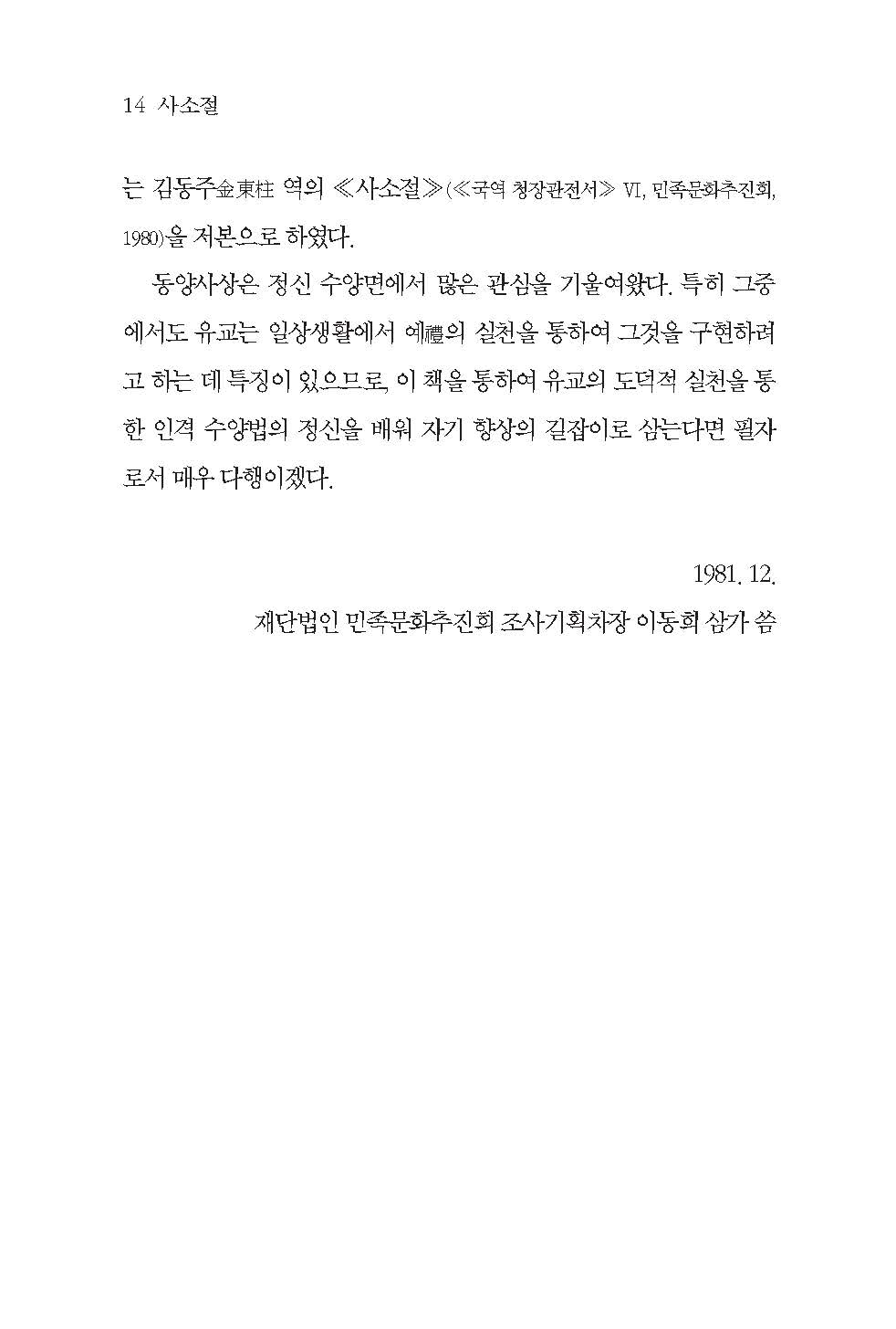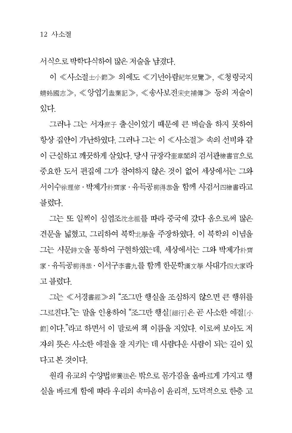 사람들은 ‘예절’이라 하면 일방적이고 딱딱하며 고리타분하다는 생각을 먼저 하게 된다. 조선시대의 선비가 이야기하는 예절이라면 더욱 그러할 것이다. 그러나 이덕무李德懋의 ≪사소절士小節≫은 조선시대의 복잡하고 학술적인 예서禮書들과는 완전히 다른 책이다. ≪사소절≫은 시대와 장소에 제약받지 않고 공감할 수 있는 직관성의 바탕 위에서 합리적으로 예절을 설명하고 있다. ≪사소절≫은 ‘그러면 안 된다’라고 누구나 생각하지만 잘 실천이 되지 않았던 행동들이나, ‘그것이 무슨 문제가 있지?’ 하고 대수롭지 않게 여겼던 행동들을 자상하고 이해하기 쉽게 설명함으로써 ‘아! 꼭 그렇게 해야겠구나.’ 하고 의식의 전환과 실천을 이끌어내는 일상예절 안내서이다.