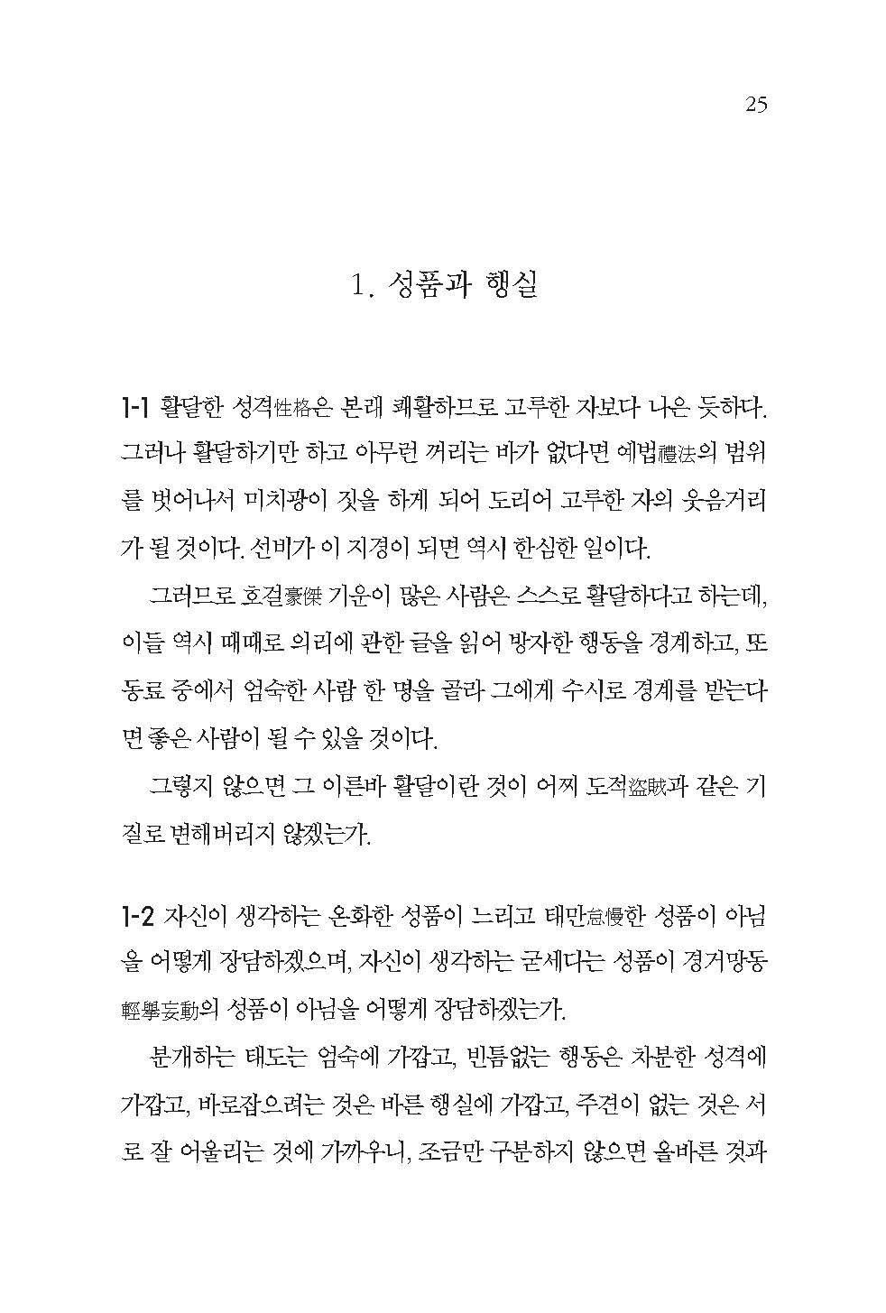 5-25 남의 송사訟事, 나라에 상소上疏, 남에게 청탁하는 일, 납세를 대신해 주고 이윤을 챙기는 일 등에 참견하지 말라. 작게는 비방을 받고 크게는 화를 당한다. 옛사람이나 지금 사람이나 이것으로 낭패한 자가 그 얼마나 많은가.