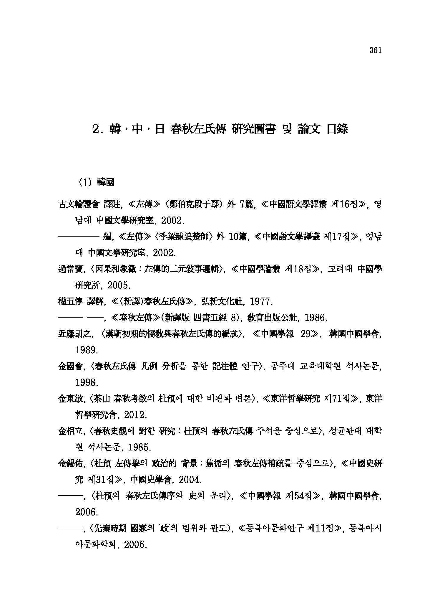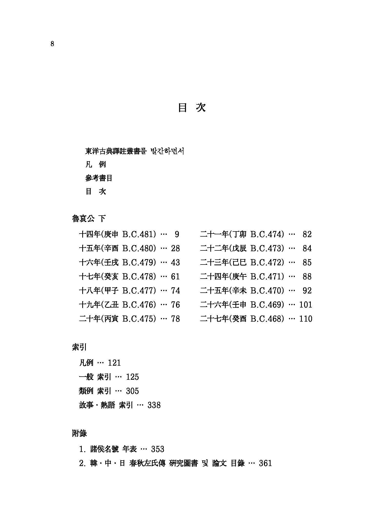? 일반색인, 유례색인, 고사?숙어 색인과 연표, 연구논문 목록 등 관련 참고자료를 부록하여 춘추 거질巨帙의 내용 검색과 활용을 용이하도록 하였다.