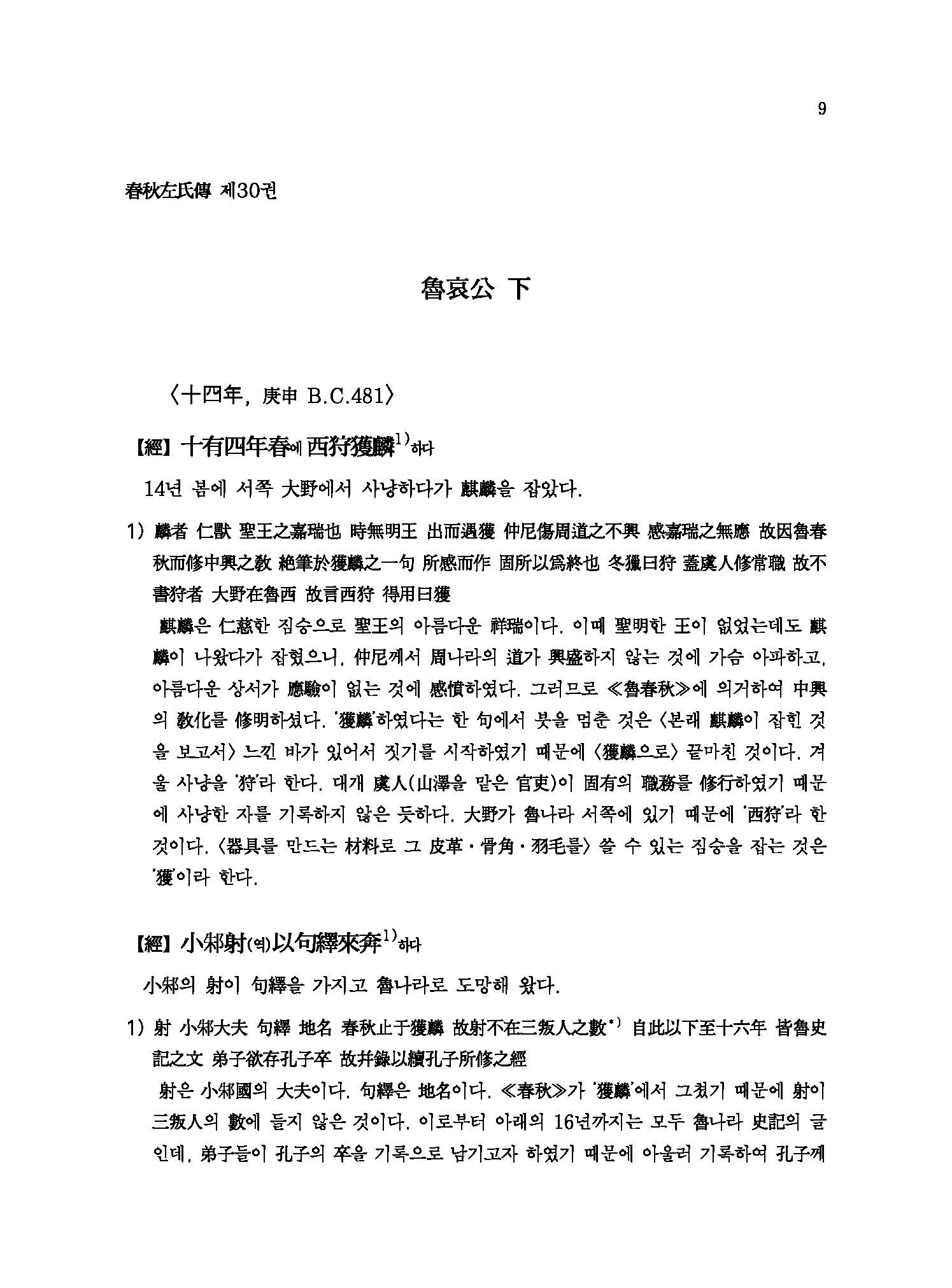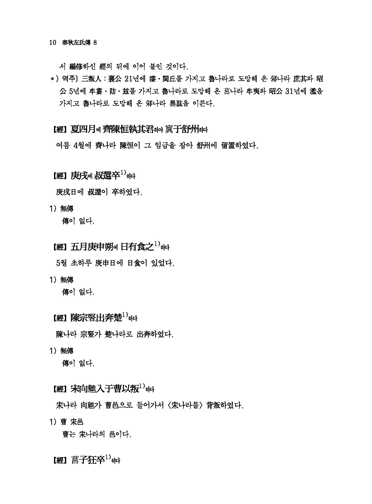 제1책 : 魯 은공隱公 원년 ~ 민공閔公 2년 제2책 : 희공僖公 원년 ~ 문공文公 18년 제3책 : 선공宣公 원년 ~ 성공成公 18년 제4책 : 양공襄公 원년 ~ 양공 25년 | 제5책 : 양공 26년 ~ 소공昭公 7년 제6책 : 소공 8년 ~ 소공 26년 제7책 : 소공 27년 ~ 애공哀公 13년 제8책 : 애공 14년 ~ 애공 27년 |