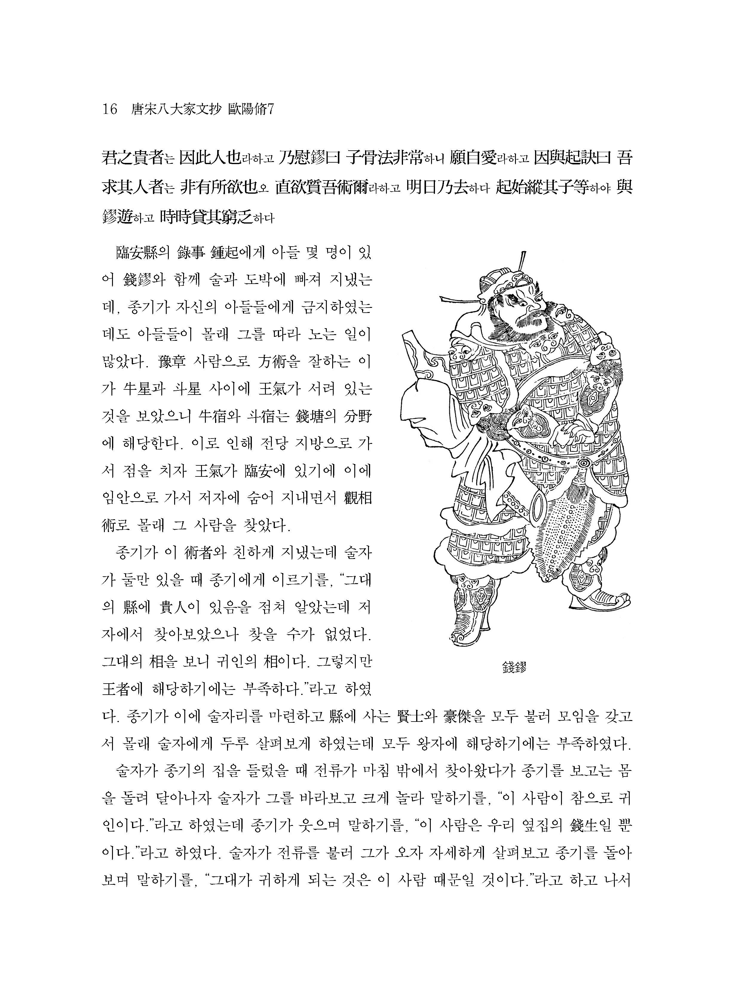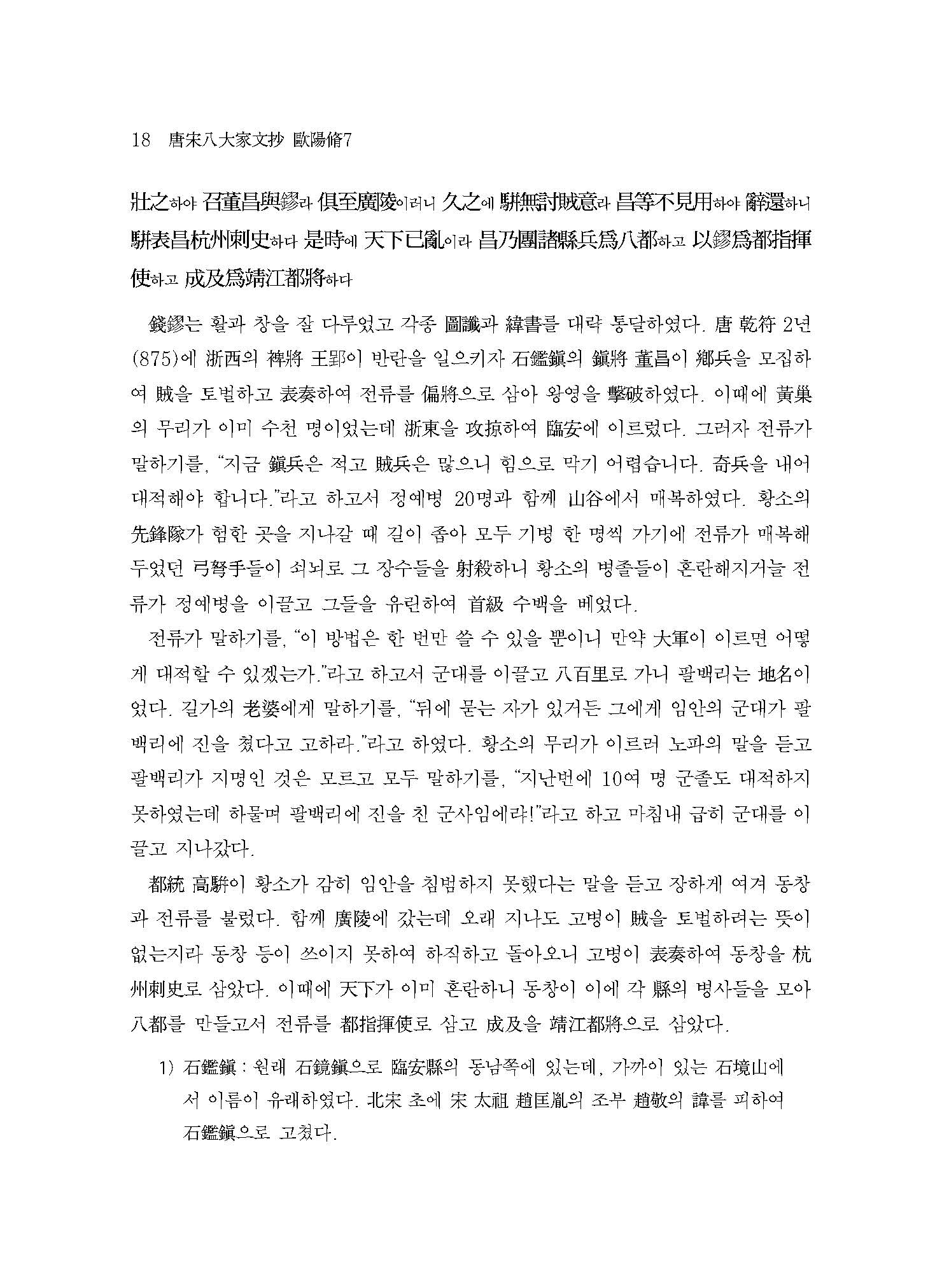 ≪역주 당송팔대가문초 ? 구양수 7≫은 ≪신오대사新五代史≫의 <세가世家>·<사이부록四夷附錄>과 ≪신당서新唐書≫의 <병지兵志>·<형법지刑法志>·<예악지禮樂志>·<역지曆志>·<오행지五行志>·<지리지地理志>·<백관지百官志>·<식화지食貨志>·<예문지藝文志> 등에서 가려 뽑은 글들로 구성되어 있다. 중국 역사상 가장 강성했던 왕조 중 하나인 당唐나라의 여러 문물제도와 그 뒤를 이은 혼란기인 오대五代 시대의 역사적 단면을 이 책을 통해 엿볼 수 있다. 뿐만 아니라 이를 기술하고 때로는 준엄한 사평史評을 남긴 구양수의 역사관과 정치관이 이 책 곳곳에서 생생하게 드러나 있다. 구양수에게 역사의 서술은 과거사에 대한 단순한 호고적好古的 관심에 그치는 것이 아니라 그가 추구했던 유교적 이상 정치의 실현과 이를 담당할 이상적 사대부士大夫 상像의 확립이라는 측면에서 일종의 반면교사로서의 함의를 지니고 있었다. 이를 염두에 두고 본서를 숙독한다면 당과 오대라는 특정한 시대에 대한 이해를 넘어서 역사와 정치, 인간을 바라보는 구양수의 관점을 입체적으로 이해하게 될 것이다. 나아가 인류 보편의 문제와 맞닿아있는 구양수의 이러한 문제의식을 깊이 있게 통찰할 수 있는 독자라면 오늘날 우리의 정치와 사회, 인간의 행태를 바라보는 데 귀중한 시사점을 얻을 수 있을 것이다.
