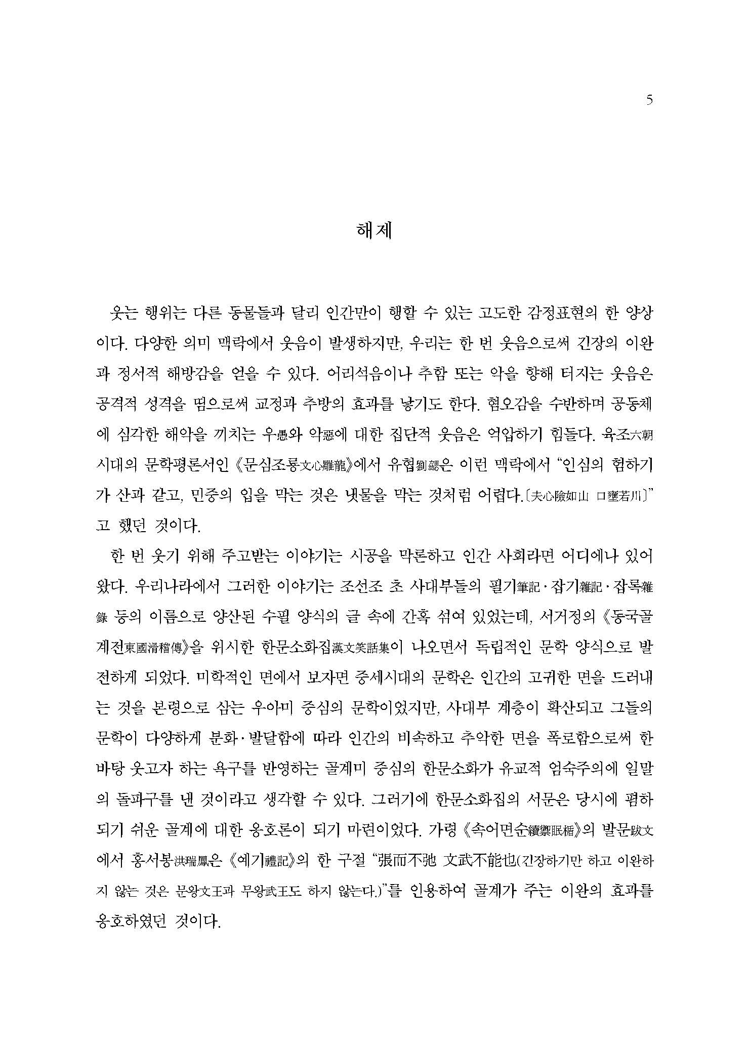 서거정의 말처럼 ≪고금소총≫에는 세상의 근심을 잊게 하는 웃음이 있다. 그리고 그 웃음에는 당시 세상에 대한 민중들의 해학諧謔과 풍자諷刺가 담겨 있다. 이는 바로 우리 정서의 한 바탕이 되었다. 이번에 출판한 ≪고금소총≫은 ≪동국골계전東國滑稽傳≫, ≪촌담해이村談解頤≫, ≪어면순禦眠楯≫, ≪속어면순續禦眠楯≫, ≪명엽지해蓂葉志諧≫, ≪파수록破睡錄≫ 중에서 과도한 음담패설은 빼고 현대인에게 해학과 풍자, 그리고 교훈을 줄 수 있는 작품을 선정하여 수록하였다.