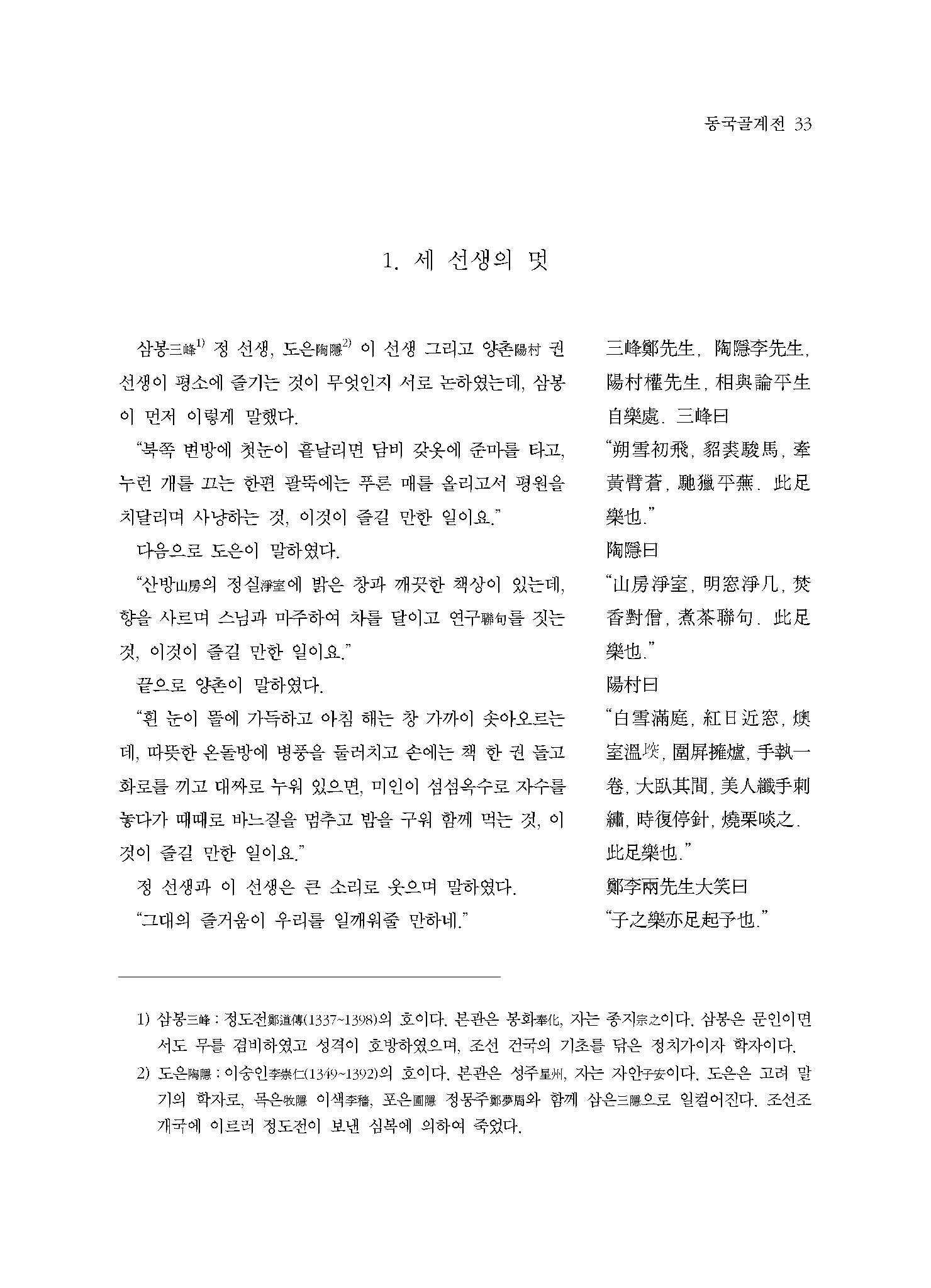 삼봉三峰1) 정 선생, 도은陶隱2) 이 선생 그리고 양촌陽村 권 선생이 평소에 즐기는 것이 무엇인지 서로 논하였는데, 삼봉이 먼저 이렇게 말했다.