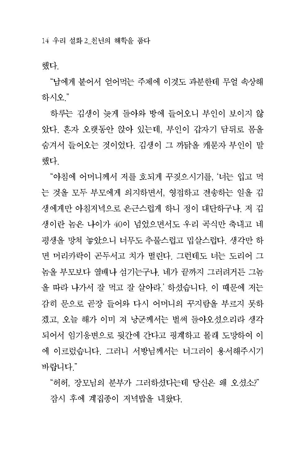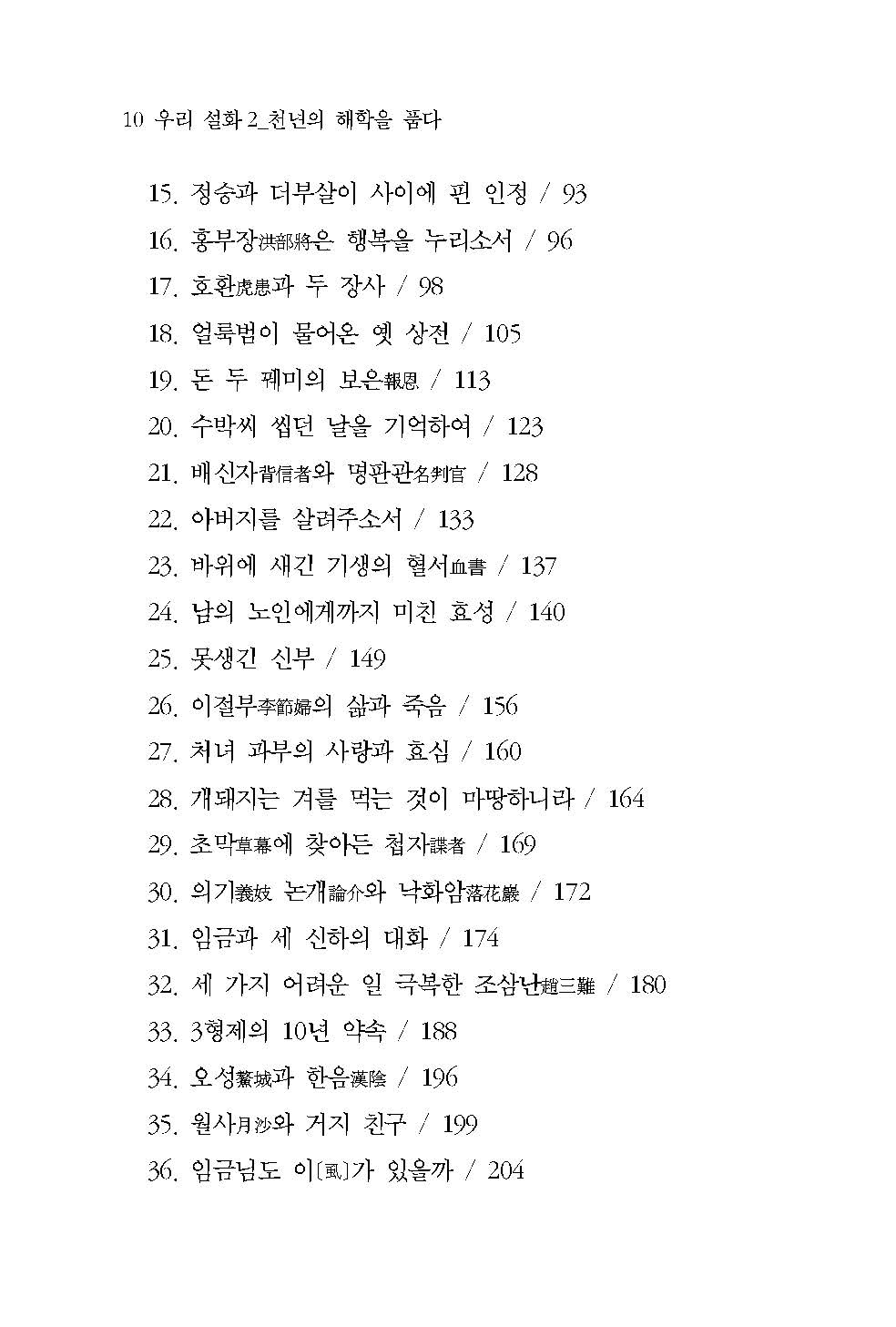 이 책 ≪우리설화≫에는 옛사람들의 모습이 선명하게 담겨 있다. 희노애락喜怒哀樂의 감정과 의식주衣食住에 고민하는 일상들까지 등장인물들이 모두 저마다의 목소리로 오늘 우리에게 자신들의 이야기를 들려주고 있다. 왕족부터 하층민에 이르는 다양한 인간 군상들의 생생한 이야기들을 통해 옛사람들에 대한 편향된 시선을 교정할 수 있게 해준다.