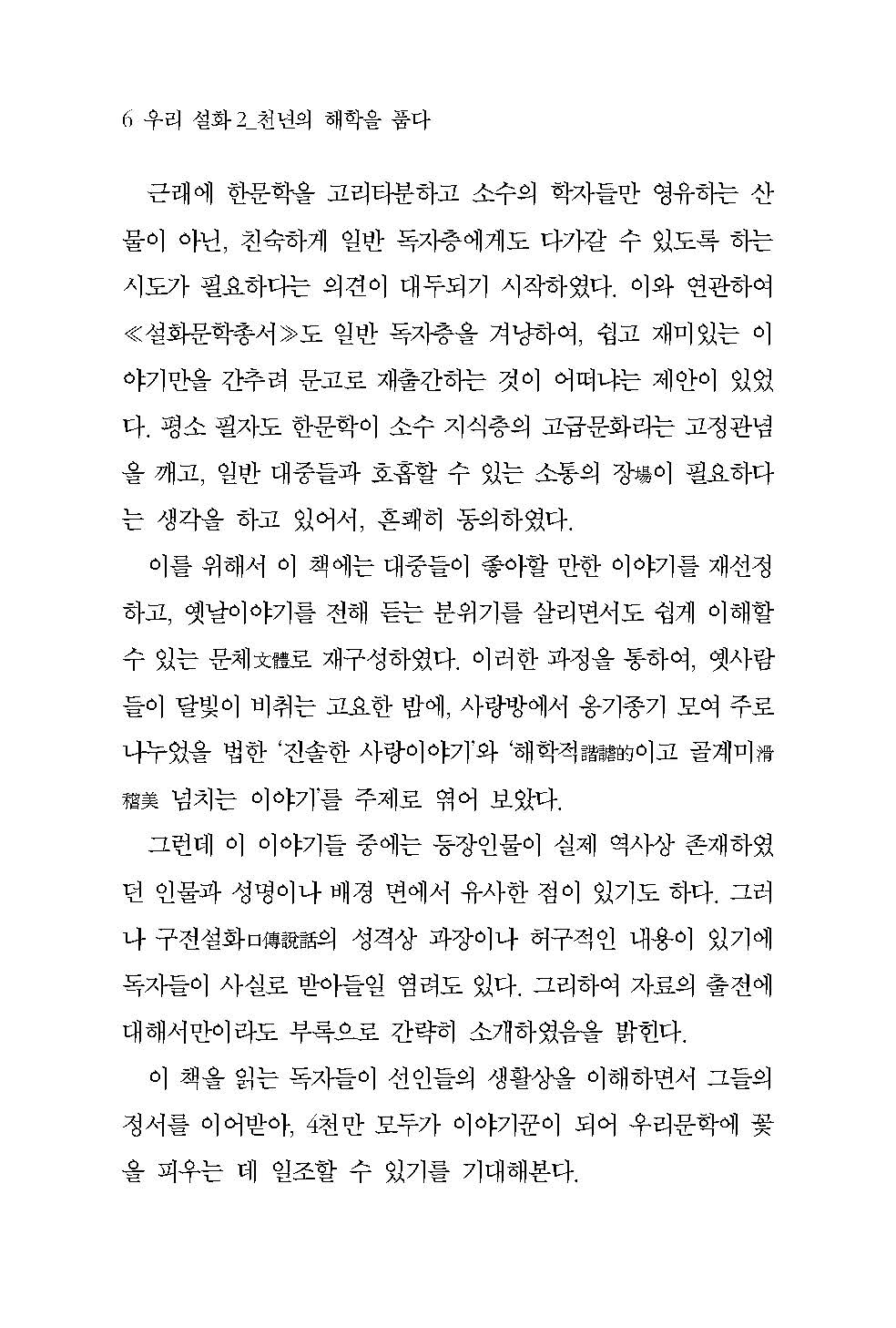 또한 이 책에는 정숙한 채 점잔을 빼고 있다가 봉변을 당하는 양반의 이야기, 임금의 물음에 재치 있게 대답하여 임금의 신뢰를 얻은 신하들의 이야기 등 해학적諧謔的이고 골계미滑稽美 넘치는 이야기들도 담겨있다. 이 책을 통해 4천만 모두가 이야기꾼이 되어 우리문학에 꽃을 피우는데 일조할 수 있기를 기대한다.