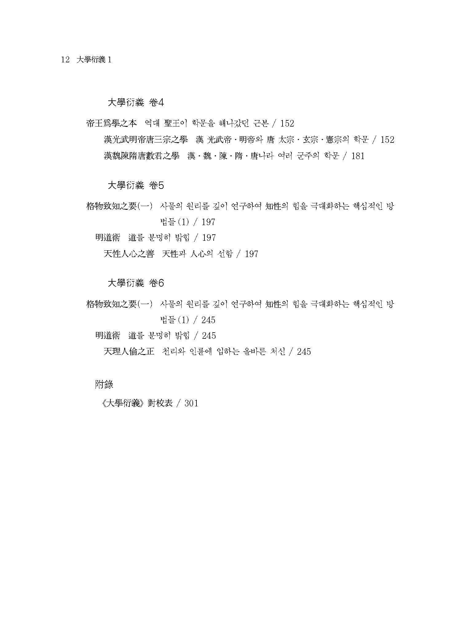 이 책은 크게 여섯 부분으로 구성되어 있다. 즉, 제왕위치지본帝王爲治之本(역대 성왕聖王이 치세를 이룩해갔던 단계), 제왕위학지본帝王爲學之本(역대 성왕聖王이 학문을 해나갔던 근본), 격물치지지요格物致知之要(격물과 치지의 요체), 성의정심지요誠意正心之要(성의와 정심의 요체), 수신지요修身之要(수신의 요체), 제가지요齊家之要(제가의 요체)로 나눌 수 있는데, 앞의 두 가지는 이 책의 대의大意를 밝힌 강綱에 해당하고, 뒤의 네 가지는 구체적인 조목을 밝힌 목目에 해당한다.