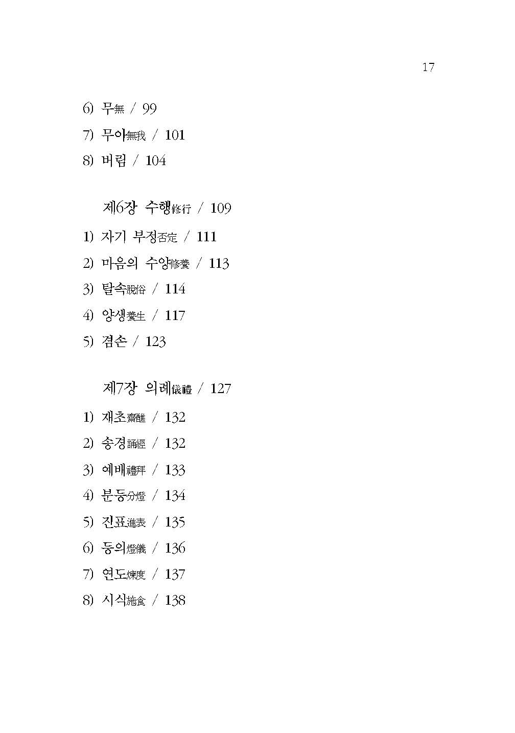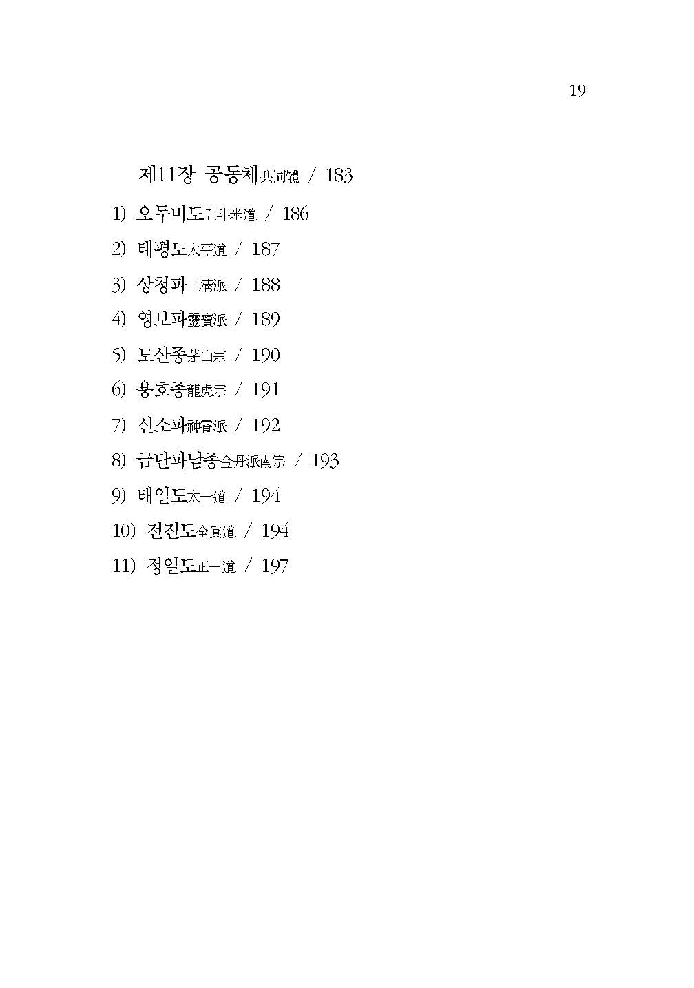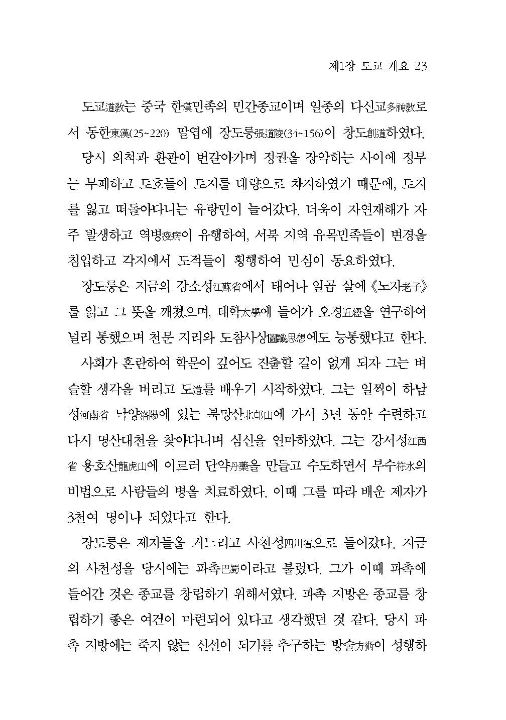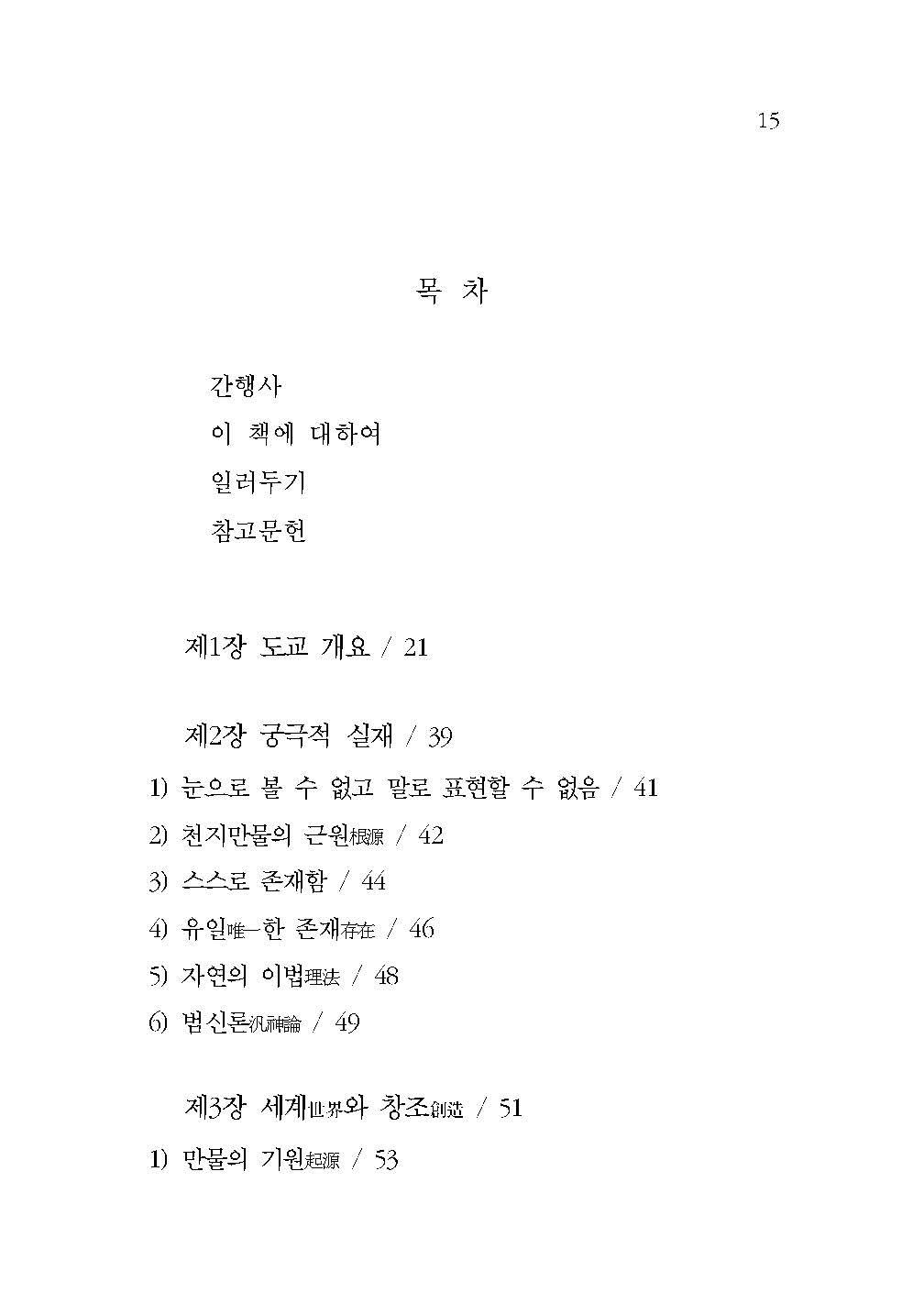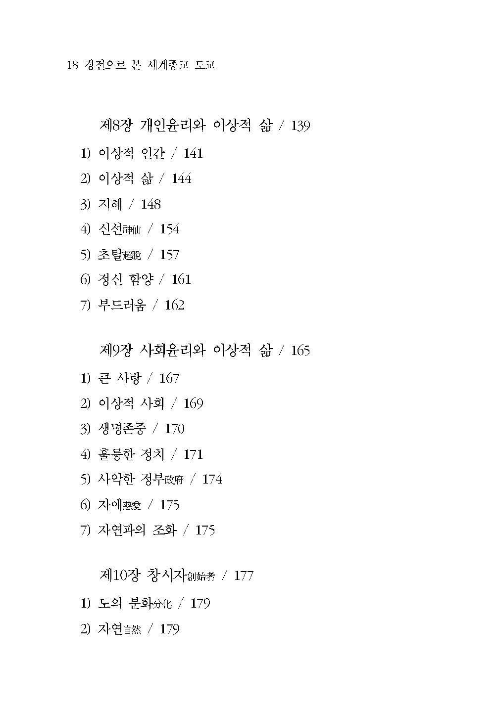 본서는 종교학적 범주를 통해 체계적으로 이해할 수 있도록 도교道敎의 개요, 궁극적 실재實在, 세계관世界觀, 인간 이해, 종교체험, 개인과 사회 윤리, 창시자創始者, 공동체共同體 등으로 분류하고 이에 해당하는 도교의 경전 내용을 읽을 수 있게 구성하였다. 이런 범주를 통해 도교 사상과 문화를 보다 체계적으로 접근하고 보다 쉽게 이해할 수 있을 것이다. 주제별 항목에 대한 설명과 해당 경전의 내용은 중등학생들 이상이면 누구나 쉽게 읽을 수 있게 서술하였으며, 경전을 통해 도교 본연의 모습을 구체적으로 파악할 수 있게 하였다.
