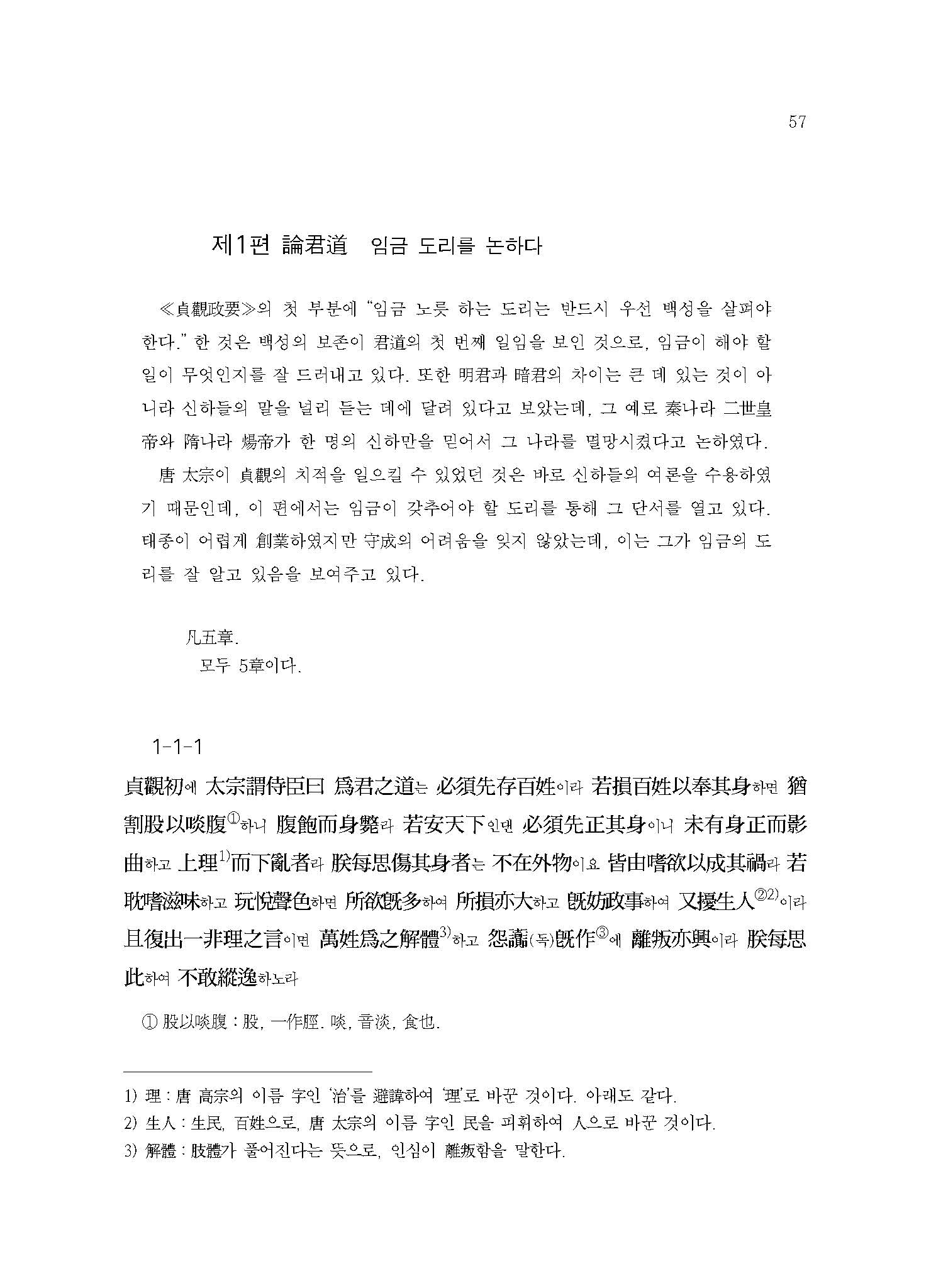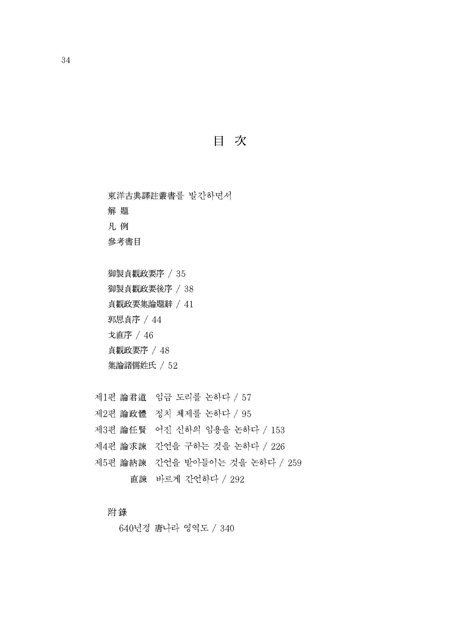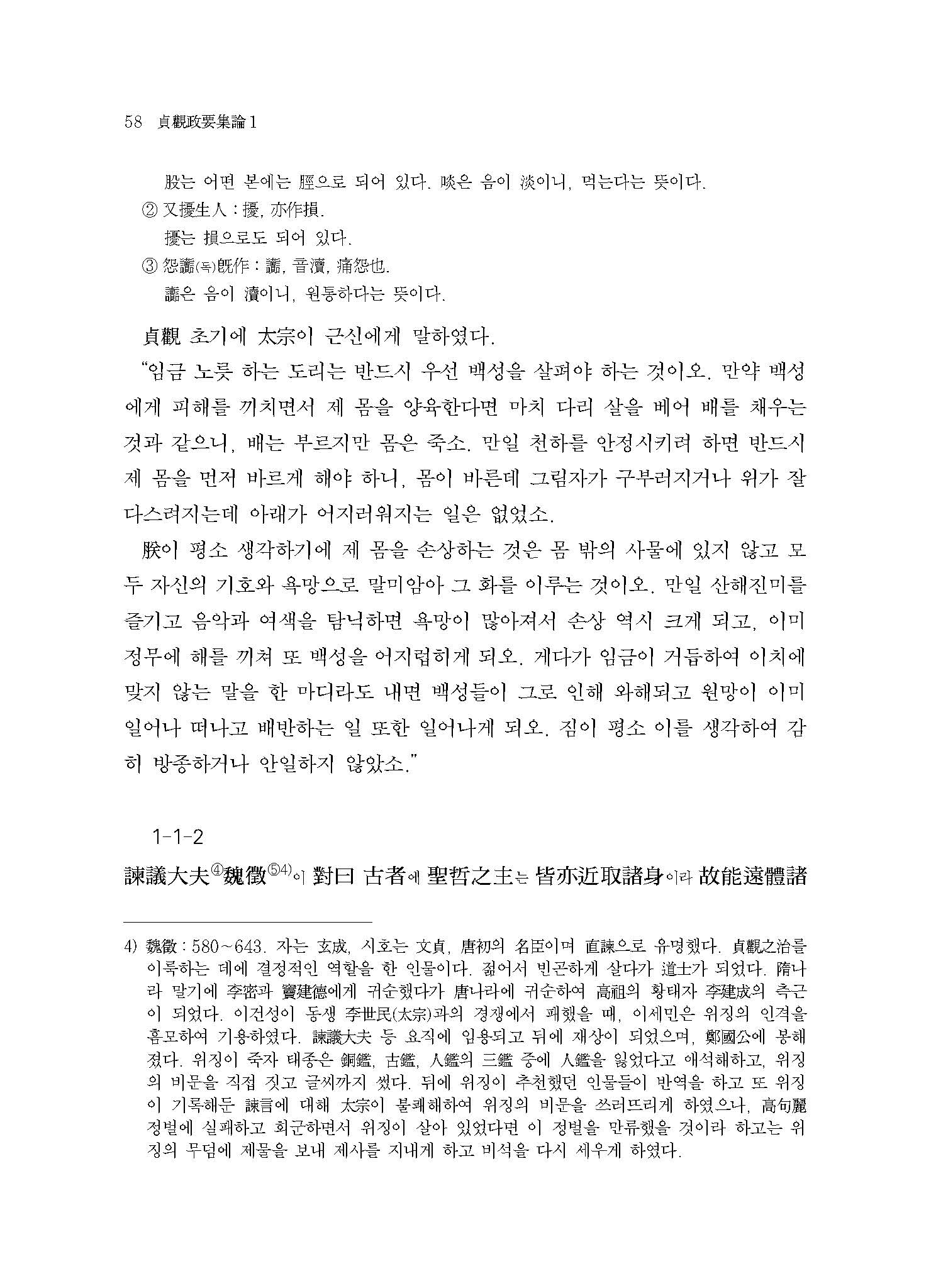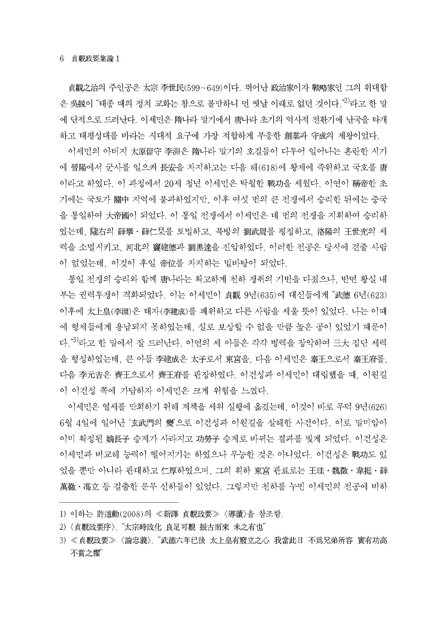 ≪역주 정관정요집론 1≫은 조선朝鮮시대 영조대英祖代 활자본(戊申字本)을 저본으로 하여 그 안에 수록된 과직戈直(元)의 집론集論까지 모두 완역한 것이다. ≪정관정요집론≫이란 오긍의 ≪정관정요≫가 전사轉寫하는 과정에서 오류가 많이 나타나게 되자, 원元나라 때 학자인 과직이 당시 여러 판본을 참고하여 오류를 바로잡고 당唐나라 이래의 여러 유학자들의 논평을 모아서 편찬한 책이다. 과직의 ≪정관정요집론≫은 후대 ≪정관정요≫의 대표적인 판본으로 인정되어 중국에서는 사고전서四庫全書에 수록되었으며, 우리나라에서도 숙종肅宗 때 활자화되어 숙종, 영조, 정조 때에 경연經筵에서 많이 읽혔다. 특히 집론集論에 수록된 많은 학자들의 논평을 통해 후대 ≪정관정요≫가 어떻게 이해되었는지를 한눈에 비교해볼 수 있다.