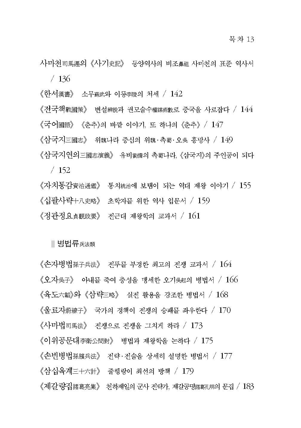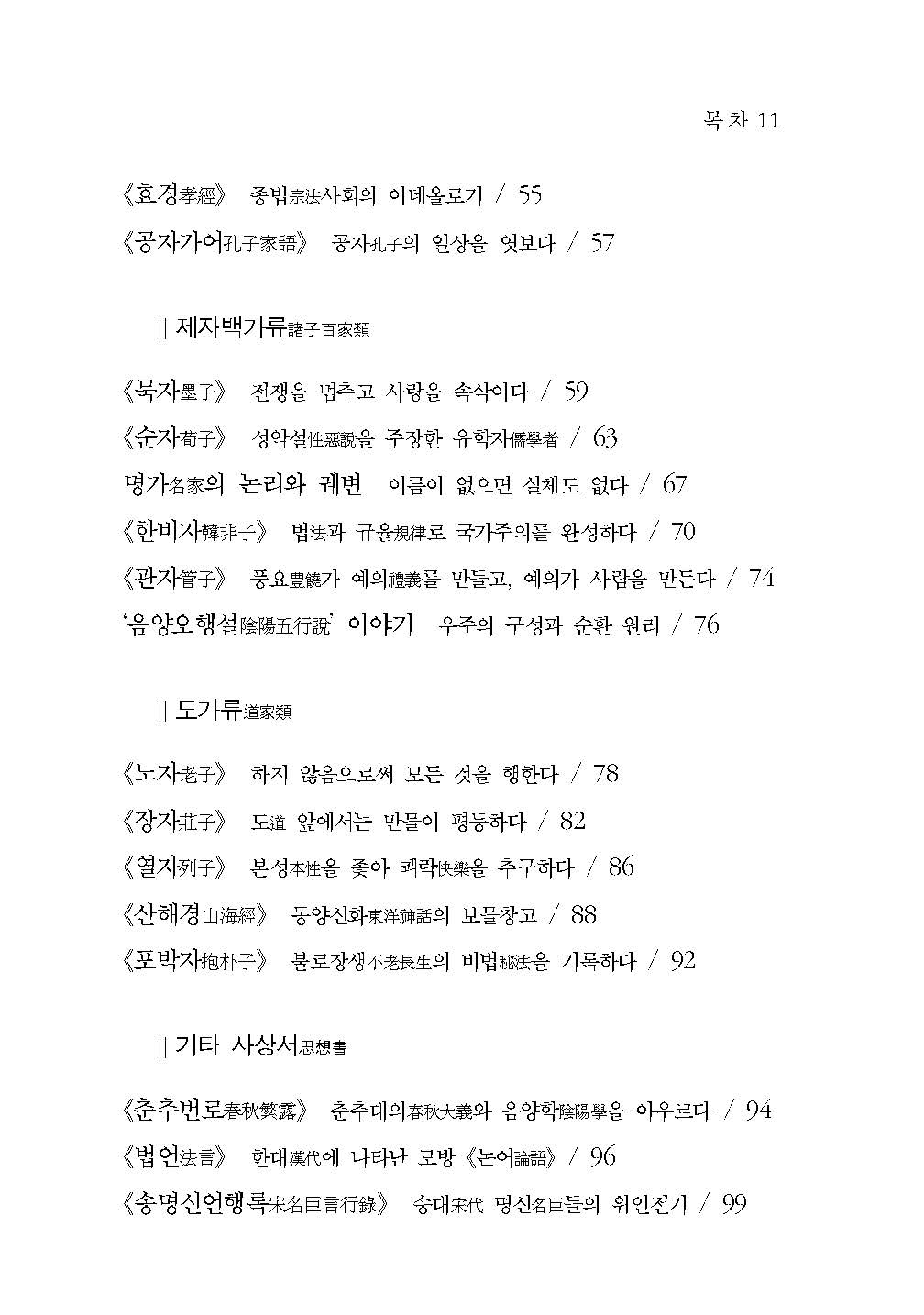 ▷ 유가류儒家類, 제자백가류諸子百家類, 도가류道家類, 기타 사상서思想書, 시선집詩選集, 역사류歷史類, 병법류兵法類, 잠언격언류箴言格言類, 근대명저近代名著로 분류를 세분화하여 분류만으로도 어떤 내용을 가진 책인지 알 수 있게 구성하였다.