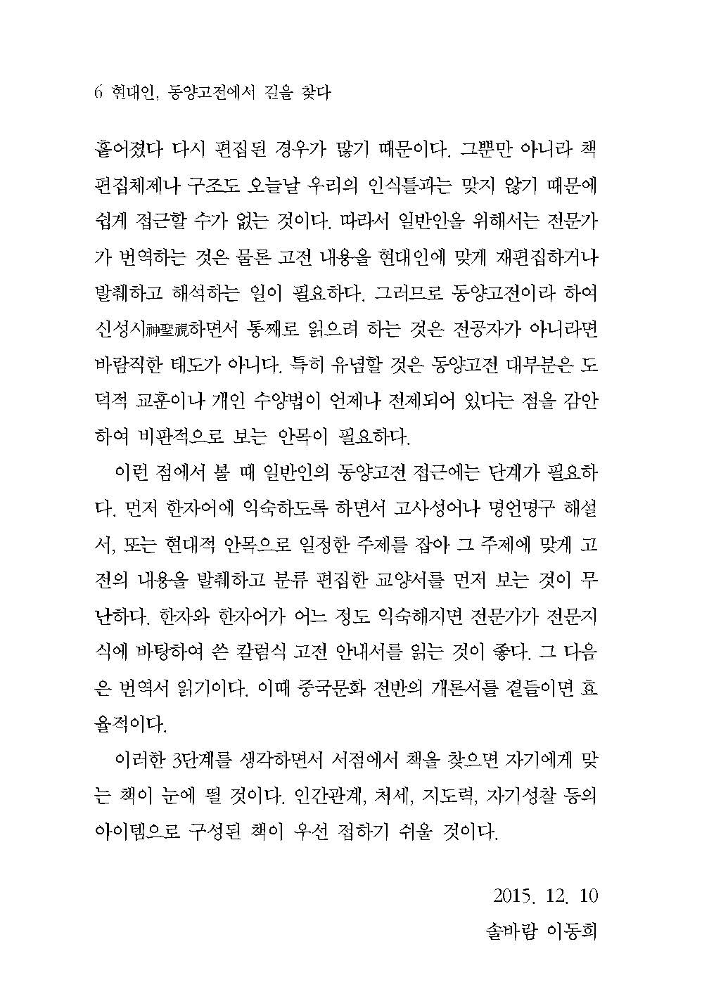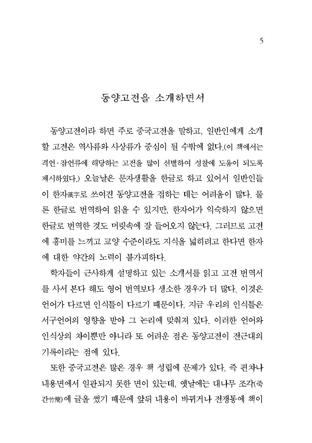 그런데 동양고전東洋古典은 독자 스스로의 노력이 있더라도 현대인이 일상에서 자주 사용하지 않는 한자漢字·한문漢文으로 기록되었기에 어느 정도 한자·한문에 대한 배경지식이 없다면 책의 내용은커녕 책의 제목을 읽는 것조차 수월하지 않다. 그렇기 때문에 일반인이 동양고전 속에서 펼쳐지는 명장면을 제대로 음미하기 위해서는 그에 대한 깊은 이해를 가진 자상한 해설가의 안내가 필요하다.