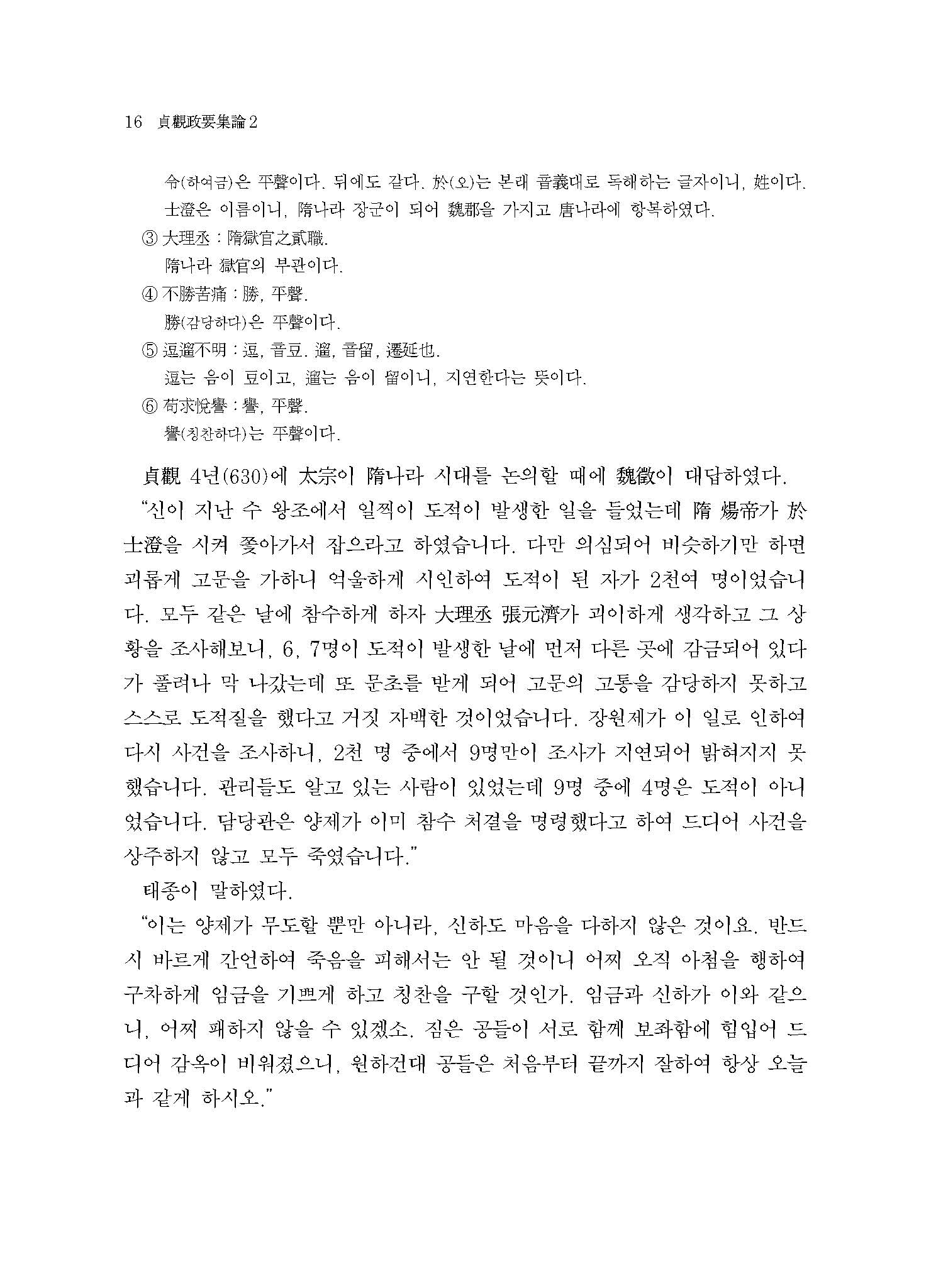 ≪역주 정관정요집론2≫는 조선朝鮮시대 영조대英祖代 활자본(戊申字本)을 저본으로 하여 그 안에 수록된 과직戈直(元)의 집론集論까지 모두 번역한 것이다. 기존에 번역된 ≪정관정요≫가 대부분 일본과 중국에서 나온 번역본을 바탕으로 중역重譯된 것이 많고, 또한 한중일韓中日 어느 나라도 주석과 논평까지 모두 번역하지는 못하였다.