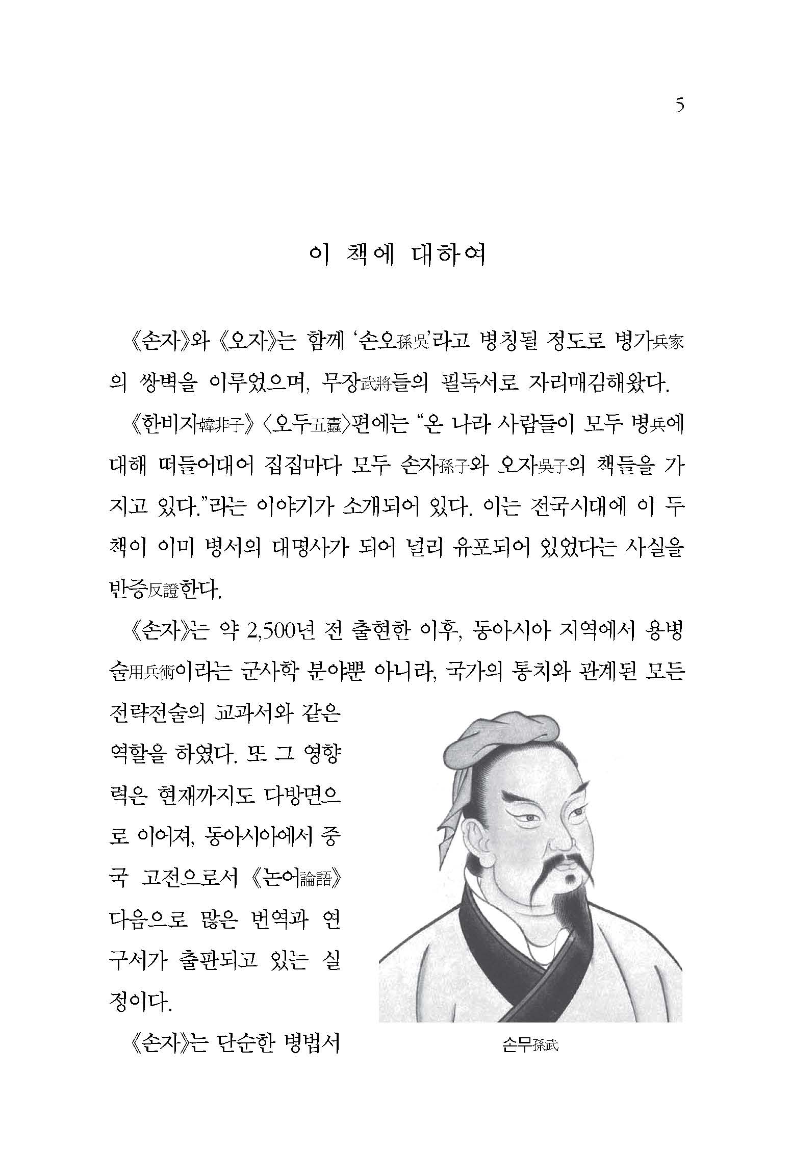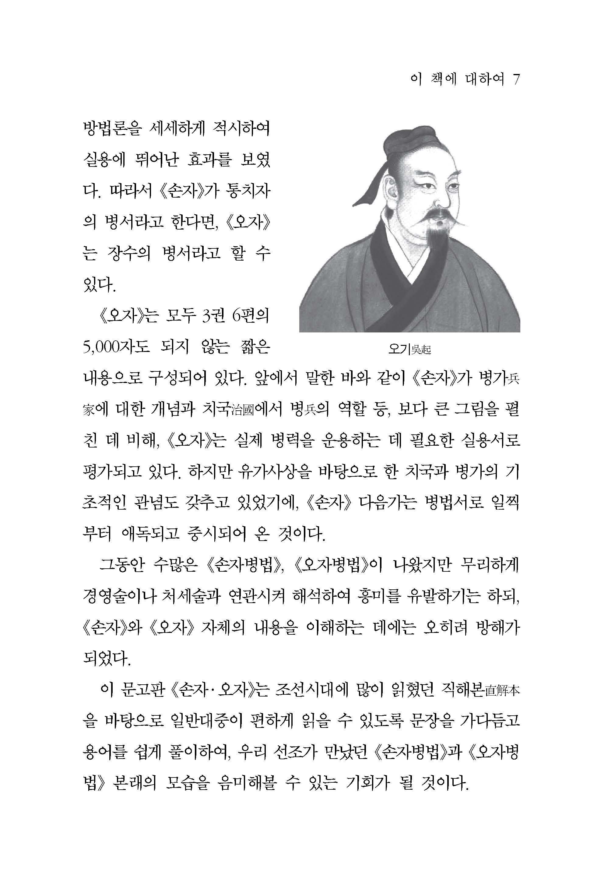 그동안 많은 ≪손자≫와 ≪오자≫ 관련 서적이 나왔지만 무리하게 경영술이나 처세술과 연관시켜 해석하여 흥미를 유발하기는 하되, 원전 자체의 내용을 이해하는 데에는 오히려 방해가 되었다. 문고판으로 현대인이 읽기 쉽게 구성한 본서를 음미해 읽어보면, ≪오자≫가 ≪손무자≫와 더불어 2,500여 년 동안 병가兵家의 경서로 중요시되었던 이유를 이해할 수 있을 것이다.