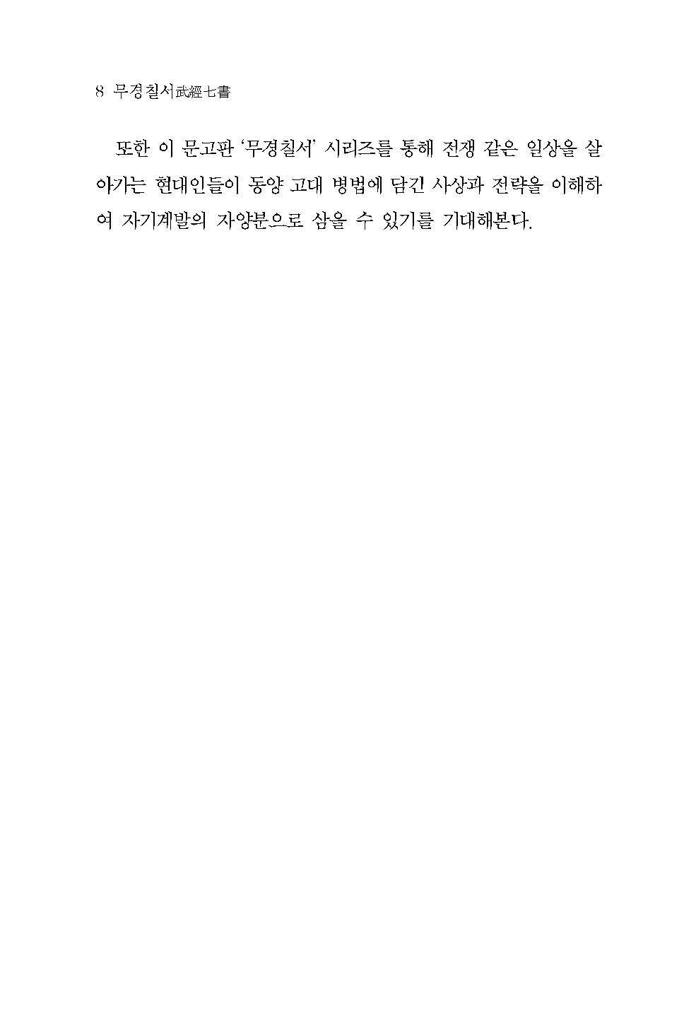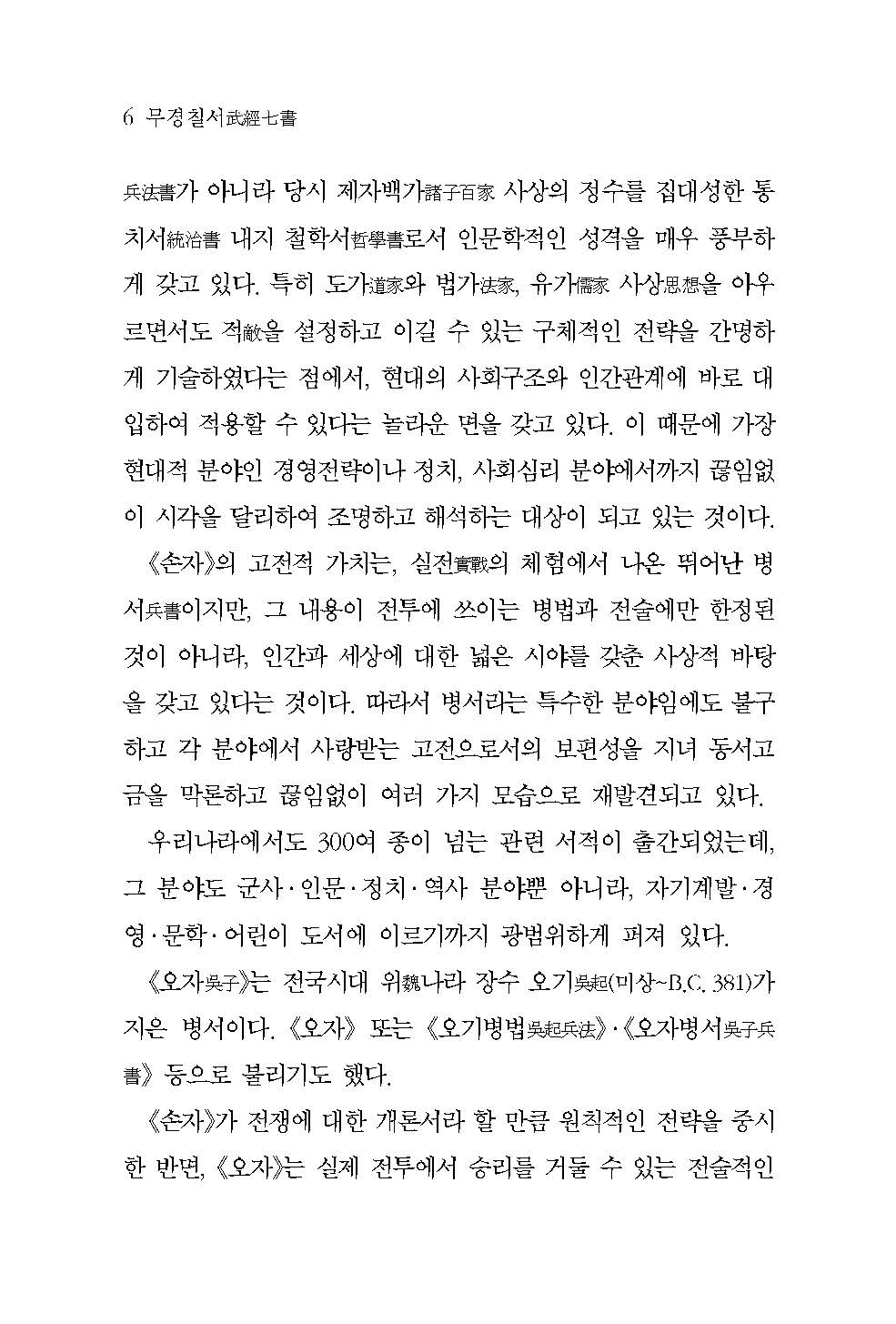 본회에서는 명明나라 유인劉寅의 ≪무경칠서직해武經七書直解≫를 완역하여 세 책으로 출간한 바 있다. 본 문고판 무경칠서는 역주 무경칠서를 문고판으로 그대로 옮겨 현대인들이 다소 어렵게 느낄 수 있는 내용을 쉽게 이해할 수 있도록 구성하였다. 이를 위해 고대 병장기와 등장인물 등 다양한 도판을 배치하여 이해를 도울 수 있도록 배치하였다.