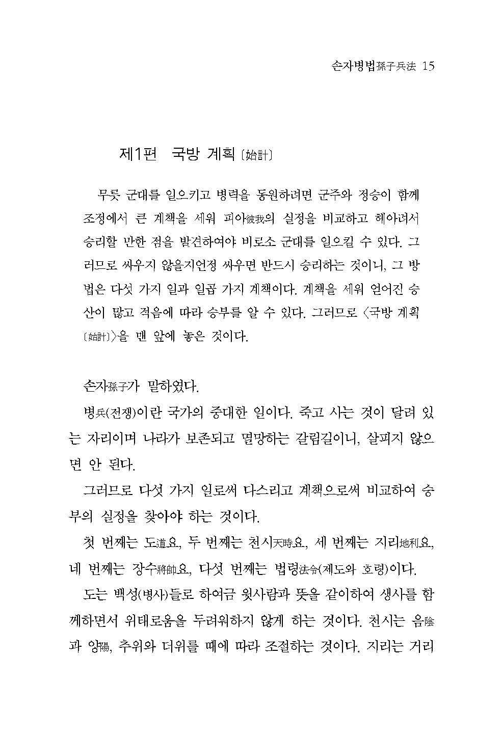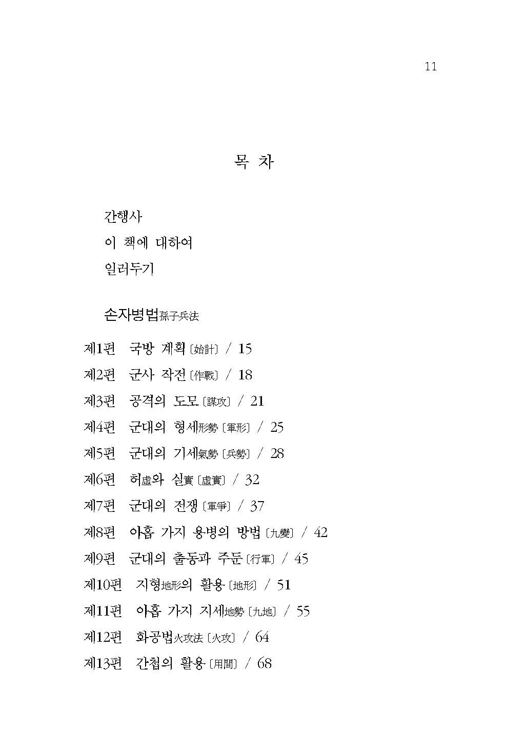 아울러 부록으로 손자병법에 등장하는 명언·명구를 선별하여 원문과 함께 배치하였다. 또한 이 책의 저자인 손자孫子와 오기吳起에 대한 이해를 돕기 위해 사마천司馬遷의 ≪사기史記≫ 중 ≪손자오기열전孫子吳起列傳≫의 번역문을 제시하였다.