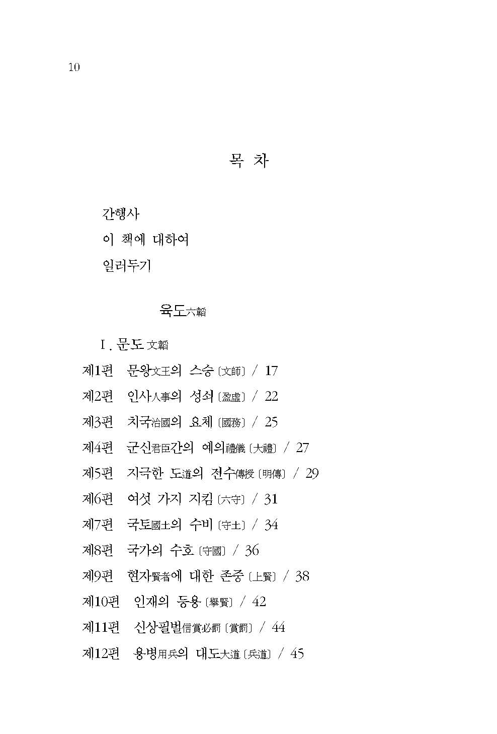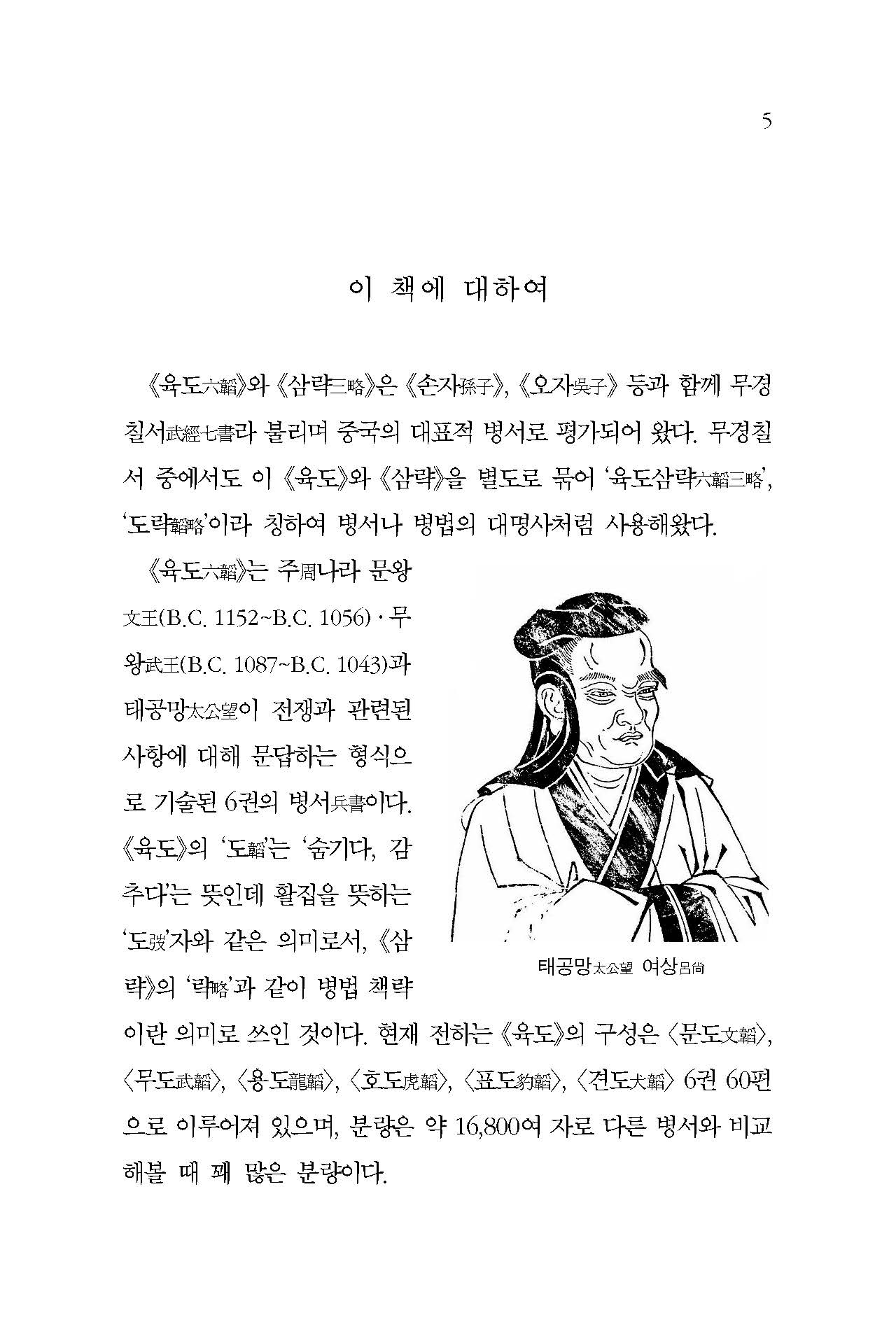 ≪육도≫는 주周나라 문왕文王;무왕武王과 태공망太公望이 병사兵事에 대해 문답하는 형식으로 기술된 병서兵書이다. 흔히 ‘육도삼략六韜三略’ 또는 ‘도략韜略’이라 하여 ≪삼략三略≫과 함께 병칭되어 병서나 병법의 대명사처럼 쓰이기도 했는데, ≪육도六韜≫의 도韜는 ‘숨기다, 감추다’의 뜻으로 ‘활집’을 뜻하는 도弢자와 같은 뜻이며, ≪삼략三略≫의 략略과 같이 ‘병법, 책략’이란 의미로 쓰인 것이다. 현재 전하는 ≪육도≫의 구성은 <문도文韜>, <무도武韜>, <용도龍韜>, <호도虎韜>, <표도豹韜>, <견도犬韜>의 6권 60편으로 되어 있으며, 분량은 약 16,800여 자로 다른 병서와 비교해볼 때 꽤 많은 분량이다.
