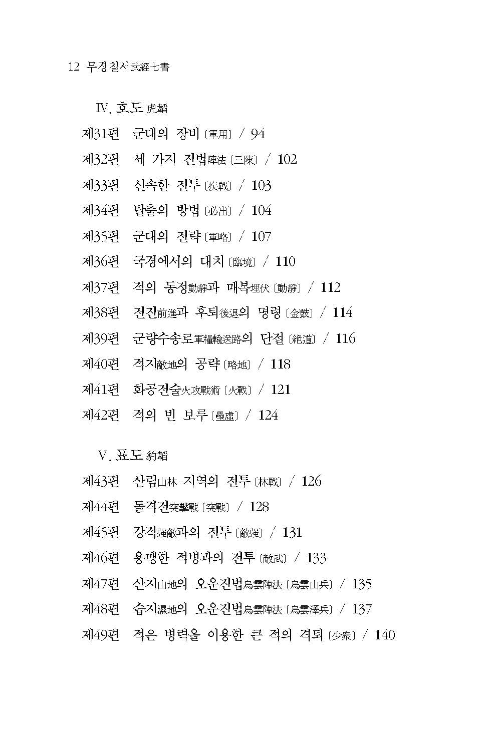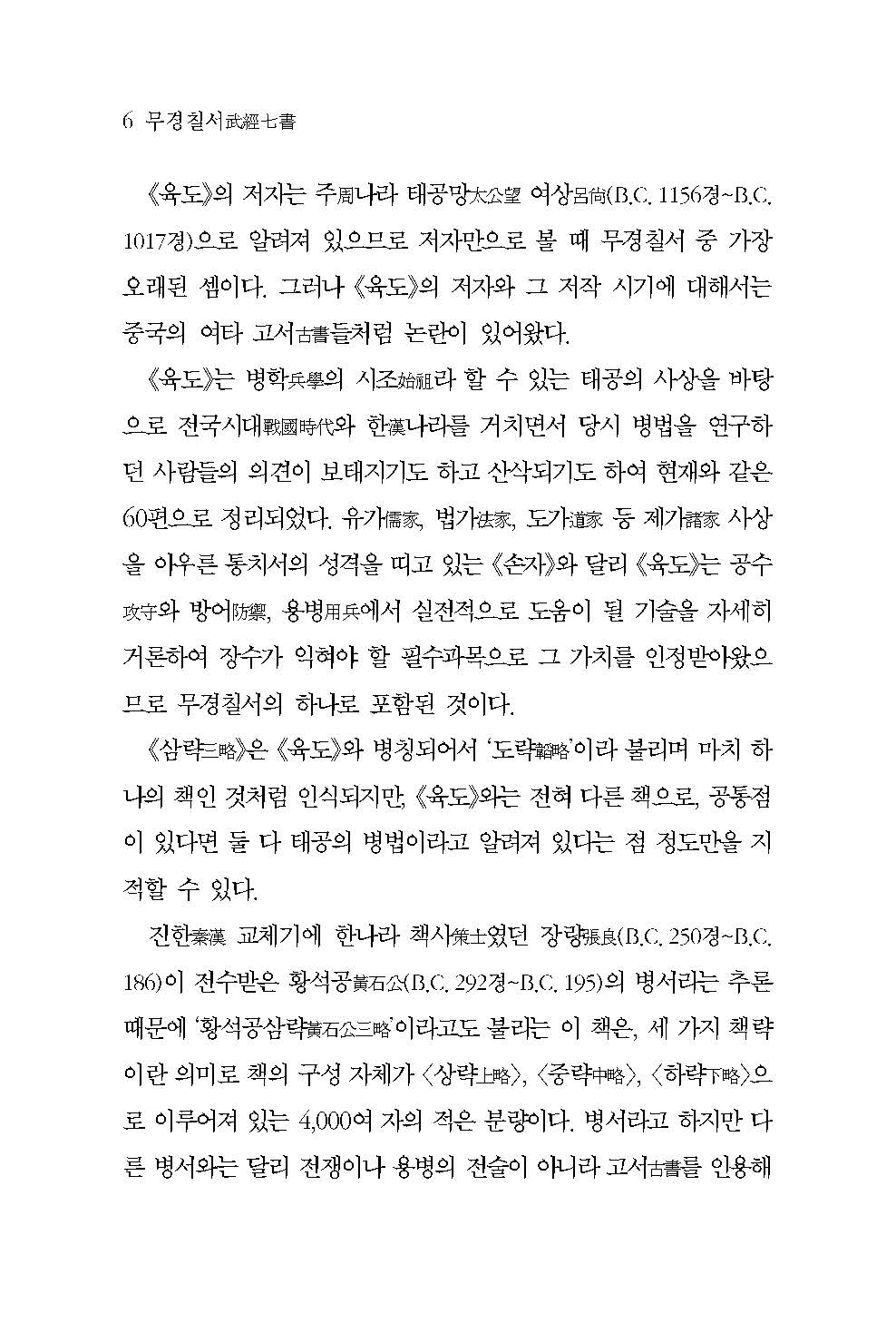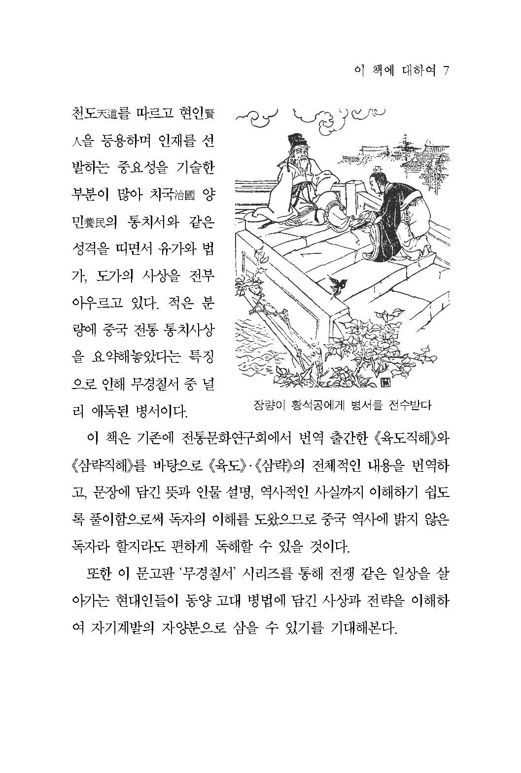 본회에서는 명明나라 유인劉寅의 ≪무경칠서직해武經七書直解≫를 완역하여 세 책으로 출간한 바 있다. 본 문고판 무경칠서는 역주 무경칠서를 문고판으로 그대로 옮겨 현대인들이 다소 어렵게 느낄 수 있는 내용을 쉽게 이해할 수 있도록 구성하였다. 이를 위해 고대 병장기와 등장인물 등 다양한 도판을 배치하여 이해를 도울 수 있도록 배치하였다.