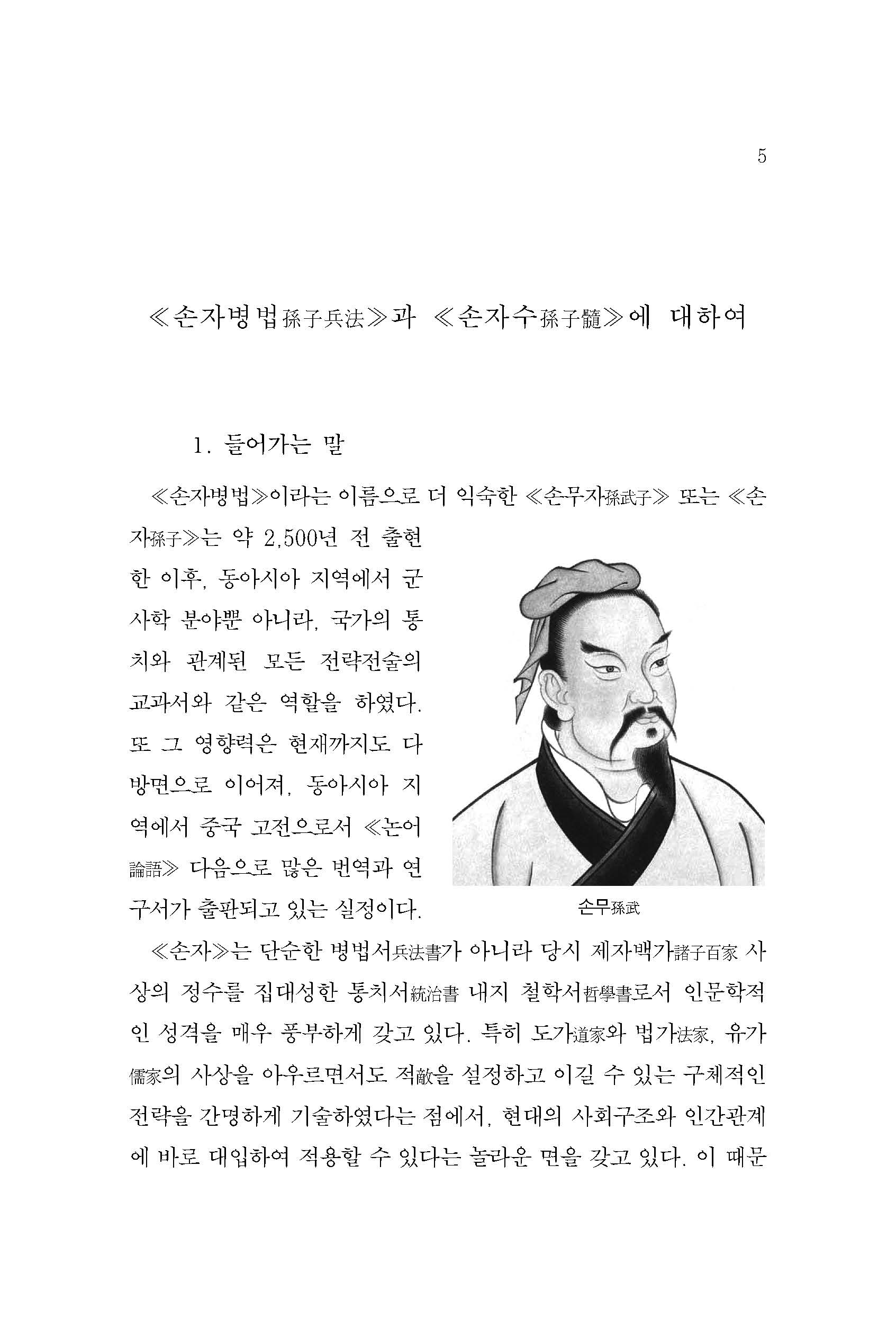 ≪손무자孫武子≫라는 원제목보다 ≪손자병법≫이라는 이름으로 더 유명한 이 책은 춘추시대春秋時代 제齊나라의 손무孫武(B.C. 544~496 추정)가 쓴 병서兵書로 동아시아 지역에서 군사학 분야뿐만 아니라, 국가의 통치와 관계된 모든 전략전술의 교과서와 같은 역할을 하였다. ≪손자병법≫은 단순한 병가류兵家類가 아니라 당시 제자백가諸子百家 사상의 정수를 집대성한 통치서統治書 내지는 철학서哲學書로서 인문학적인 성격을 매우 풍부하게 가지고 있다.
