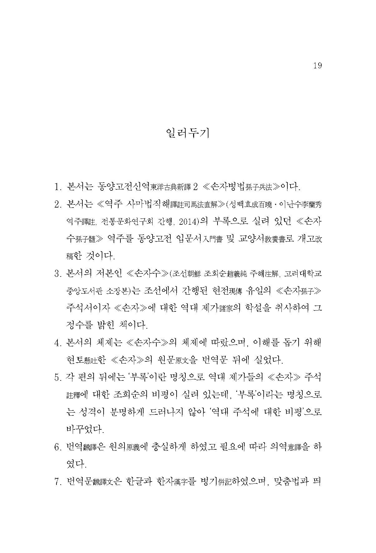 본회에서는 명明나라 유인劉寅의 ≪무경칠서직해武經七書直解≫ 중 ≪손무자직해孫武子直解≫를 완역하여 출간한 바 있다. 하지만 역주 ≪손무자직해≫는 다소 어려운 전문적이고 어려운 부분들이 섞여 있기 때문에 ≪신역 손자병법孫子兵法≫에서는 일반 대중들도 부담 없이 읽을 수 있도록 기존의 내용을 윤문·편집하고 주석을 간소화하였으며 고대 병장기와 등장인물 등 다양한 도판을 배치하여 이해를 도울 수 있도록 구성하였다.