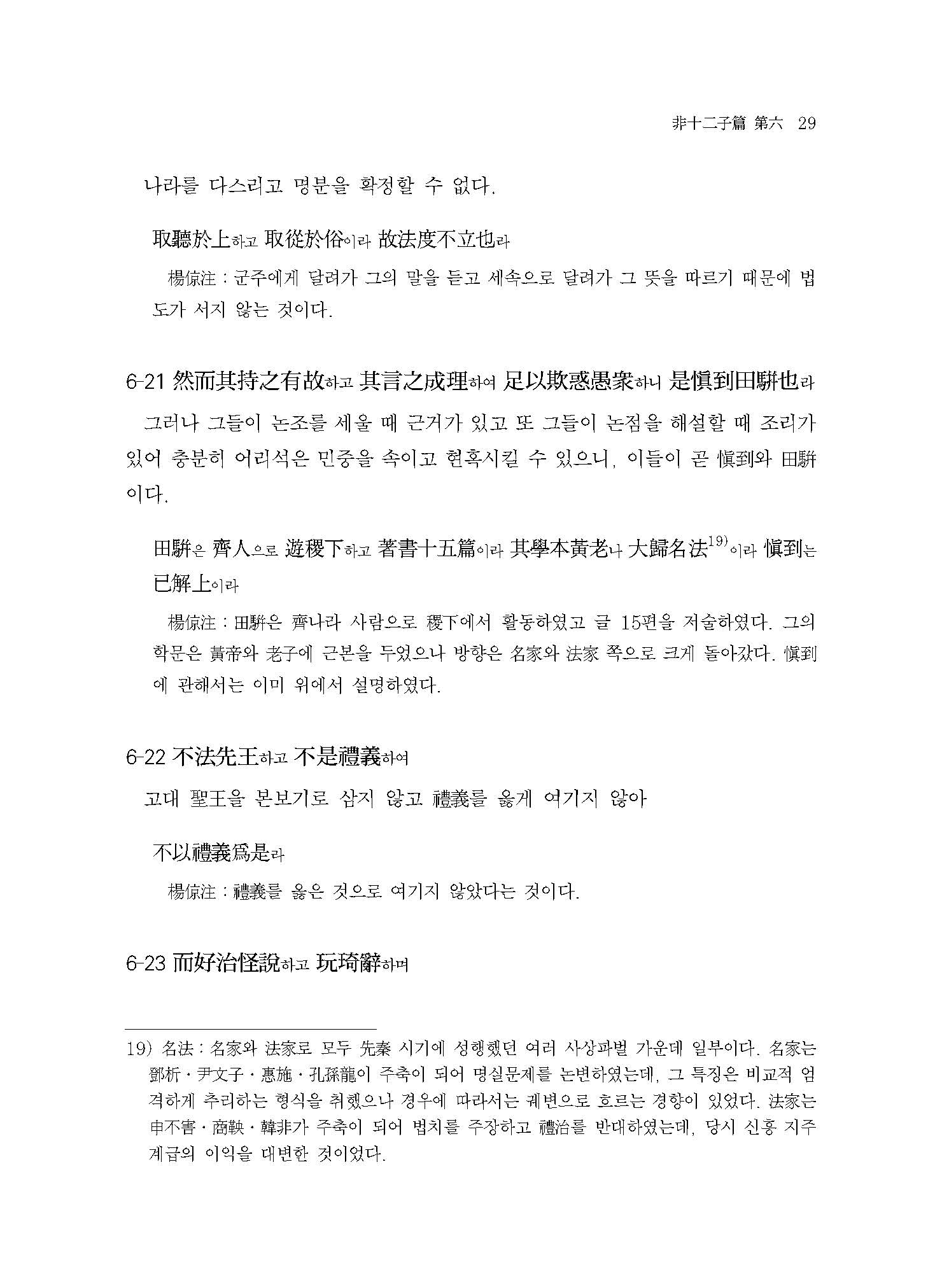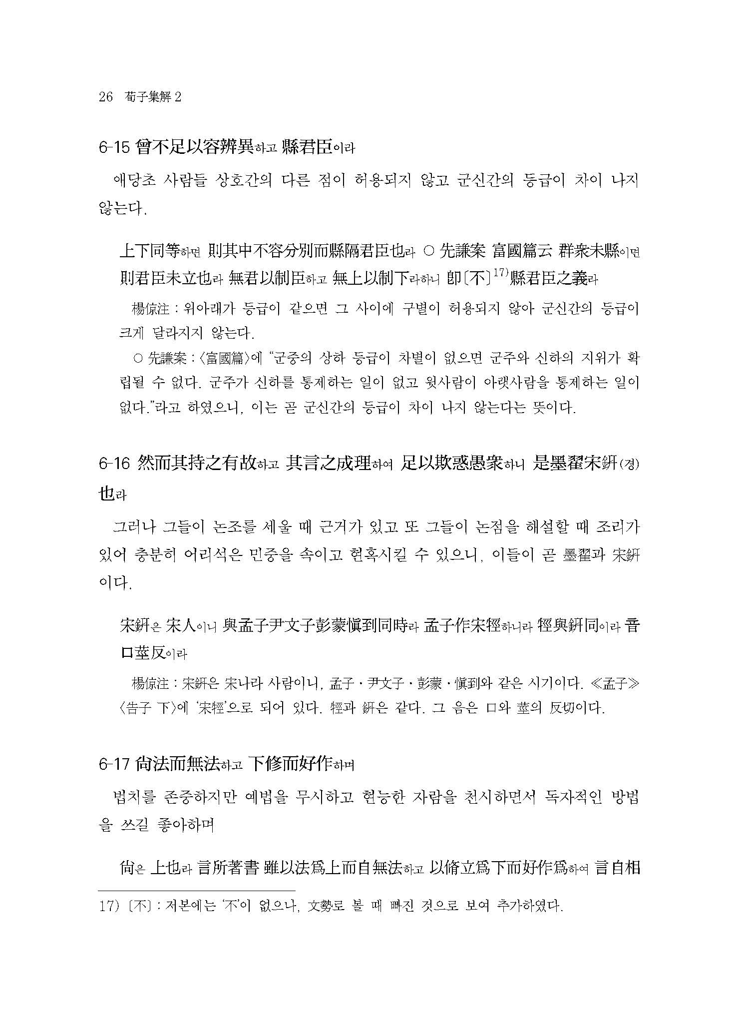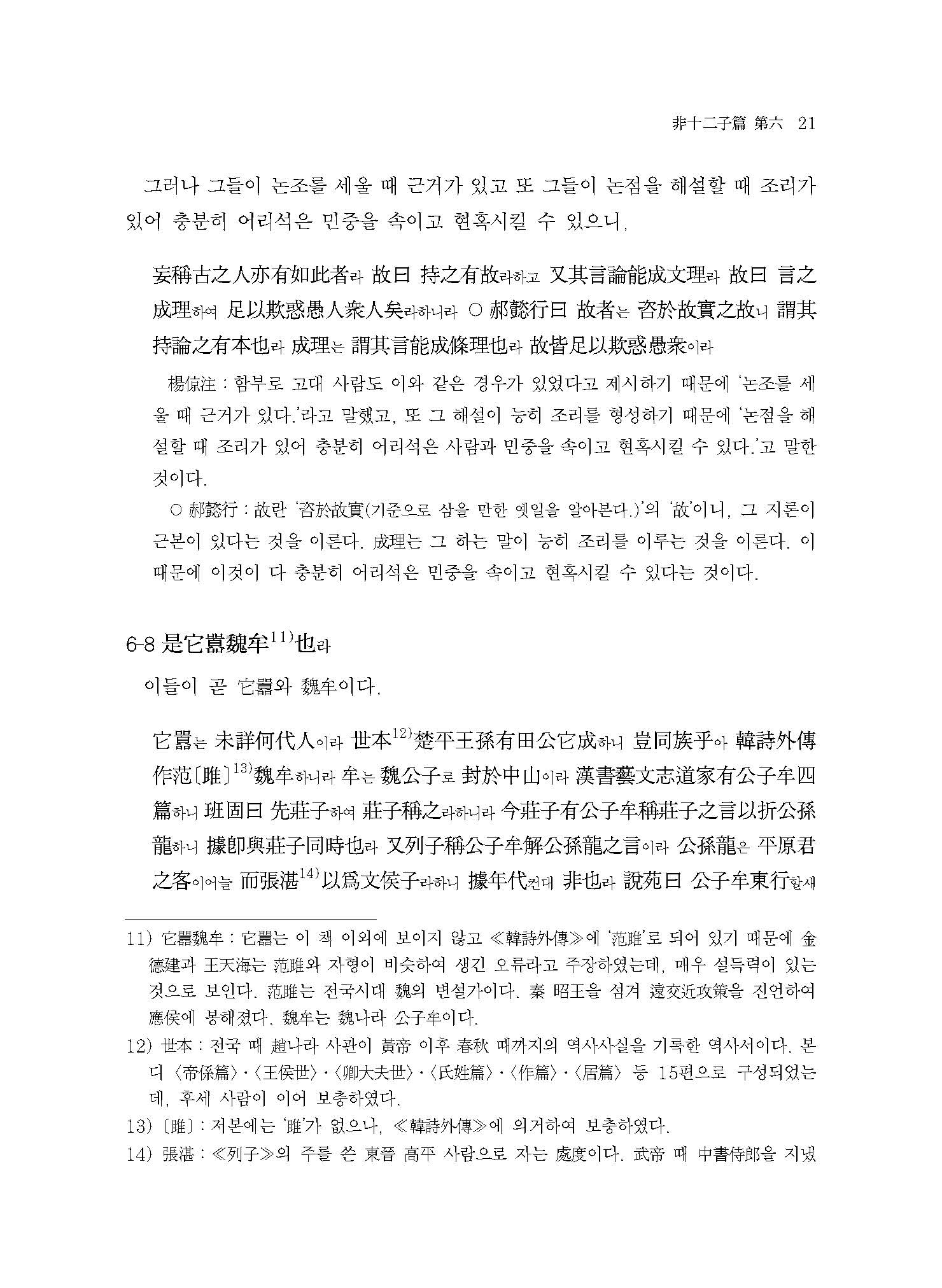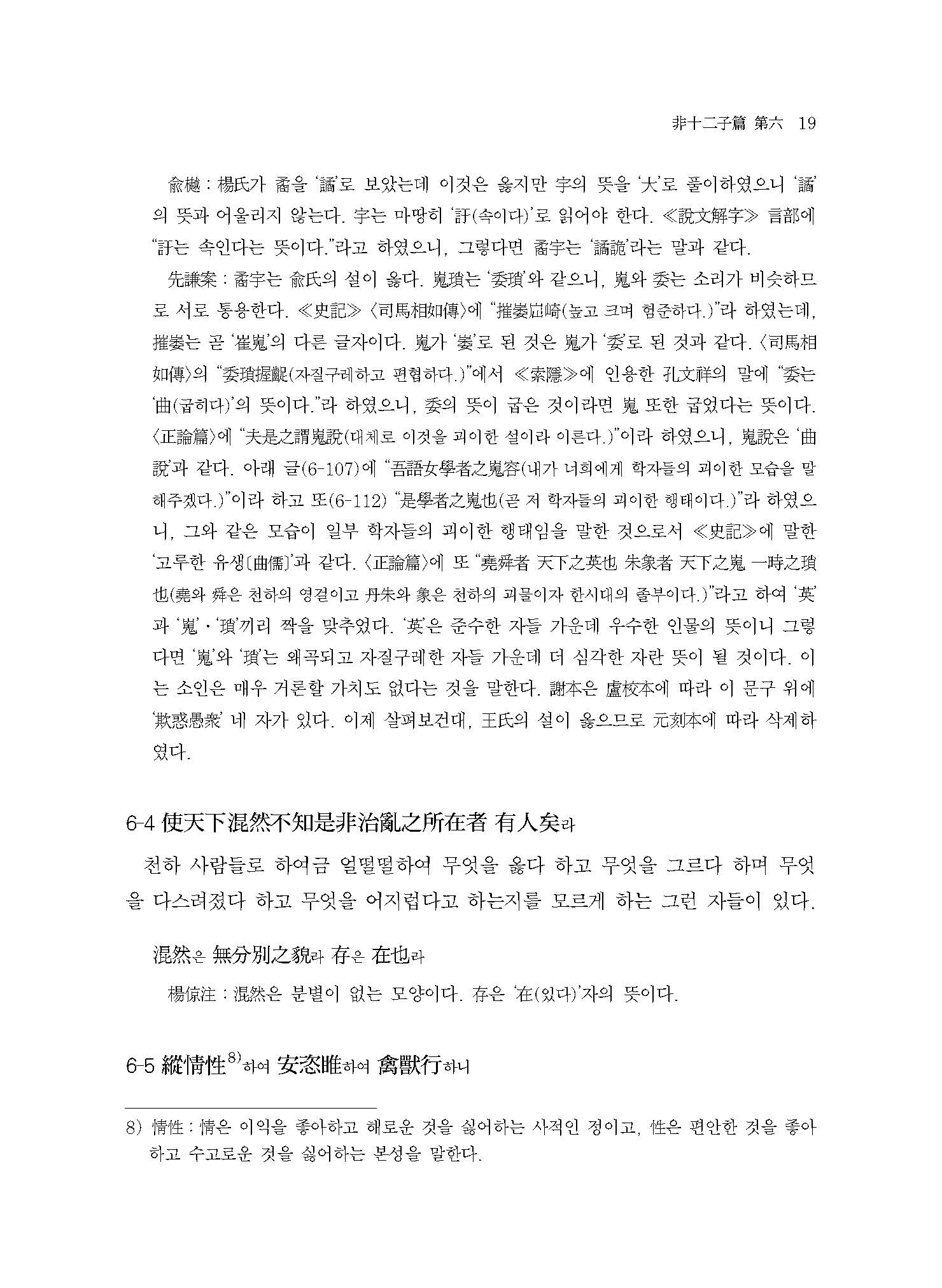 본 역주서譯註書는 동양고전 번역 전문가가, 국내외의 서적을 두루 참고하여 학술적으로 연구 번역한 책이다. 단락별로 원문과 번역문을 함께 실어놓고, 원문에는 원문의 문장구조를 한국적인 방식으로 이해하는 데 도움이 되도록 우리나라 전통적 방식의 현토懸吐를 하였다. 또한 주석은 관련 고사故事와 인물人物뿐만 아니라, 역사적 사실이나 제도적인 측면까지 심도 있게 밝혀 독자들의 내용 이해를 도왔다.