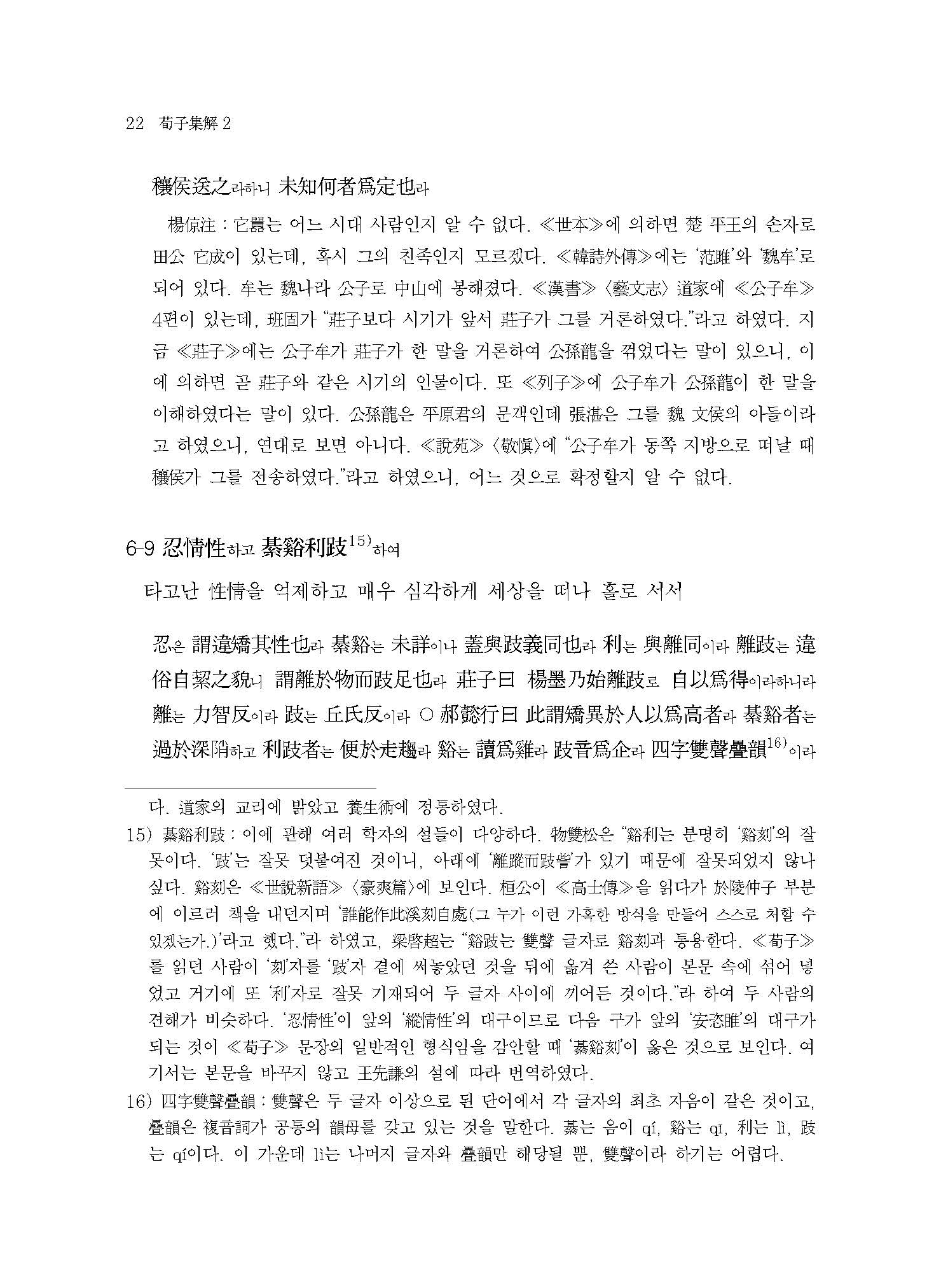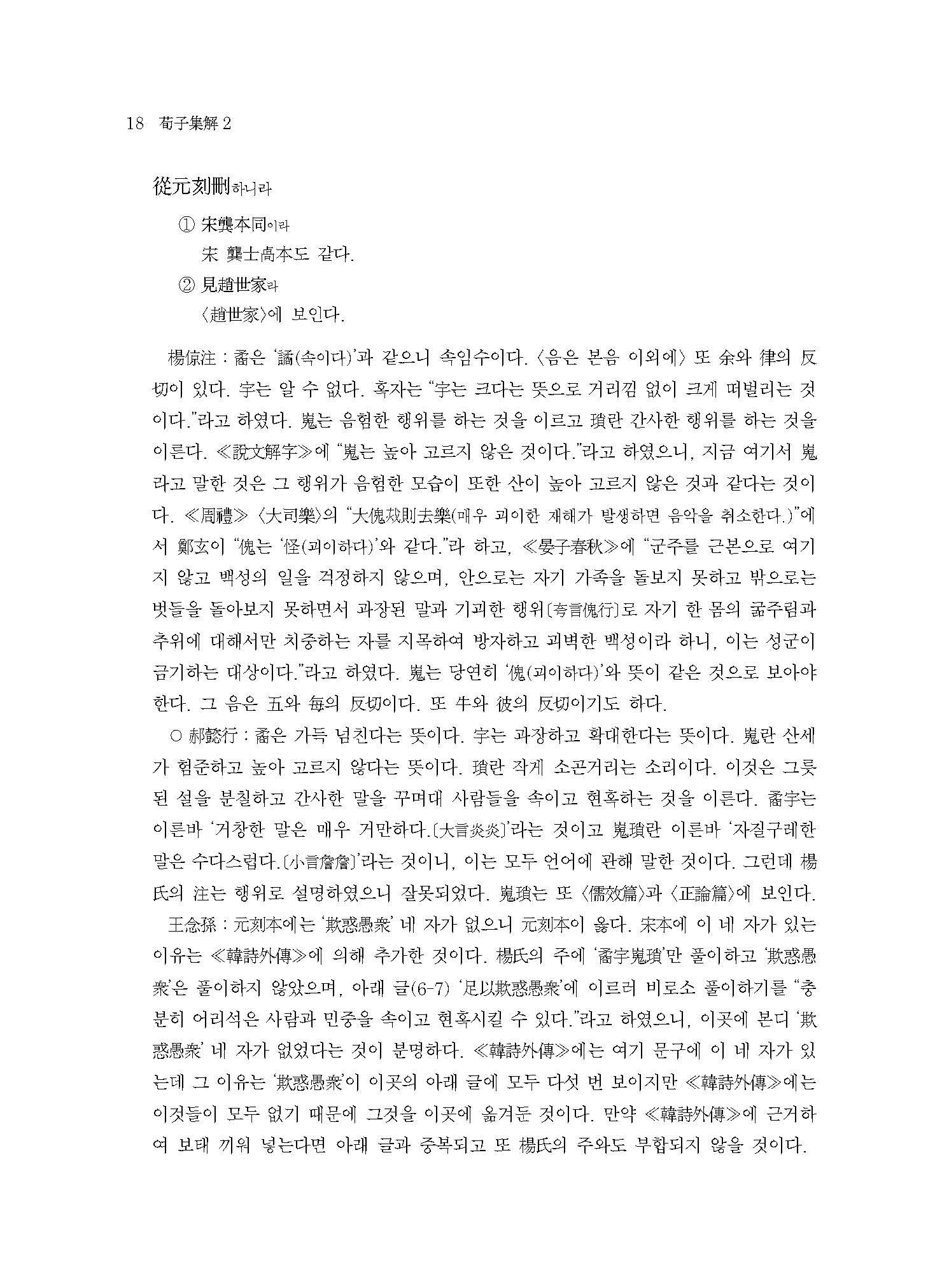 ≪순자≫는 순자 및 선진先秦 제자백가의 사상을 연구하는 데에 매우 중요한 자료이다. 당唐나라 때에 양경楊倞이 처음으로 ≪순자≫를 주석하였으며, 청淸나라 말기에 이르러 왕선겸王先謙(1842~1917)이 원문을 교감 정리하여 1891년 ≪순자집해≫를 완성하였다.