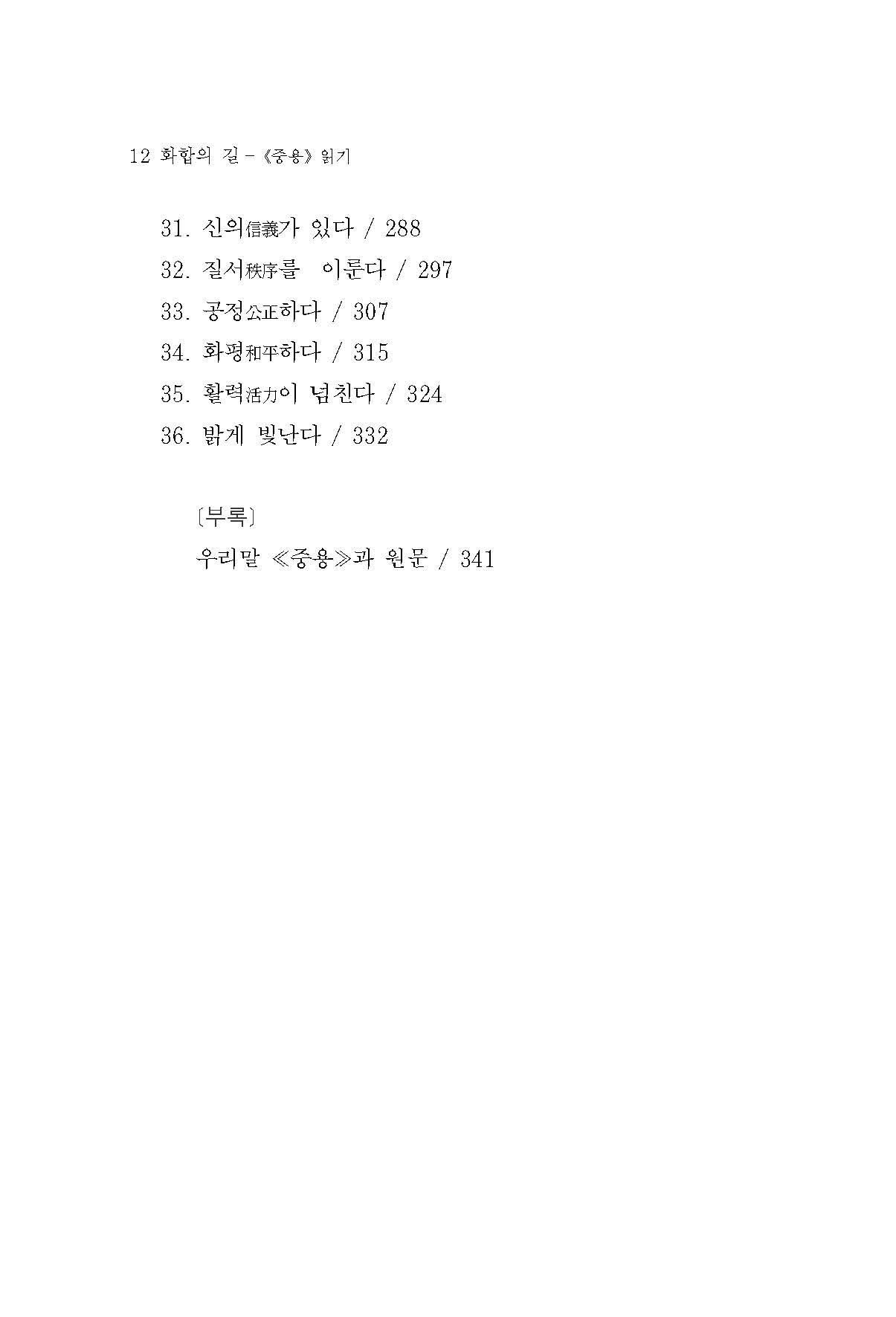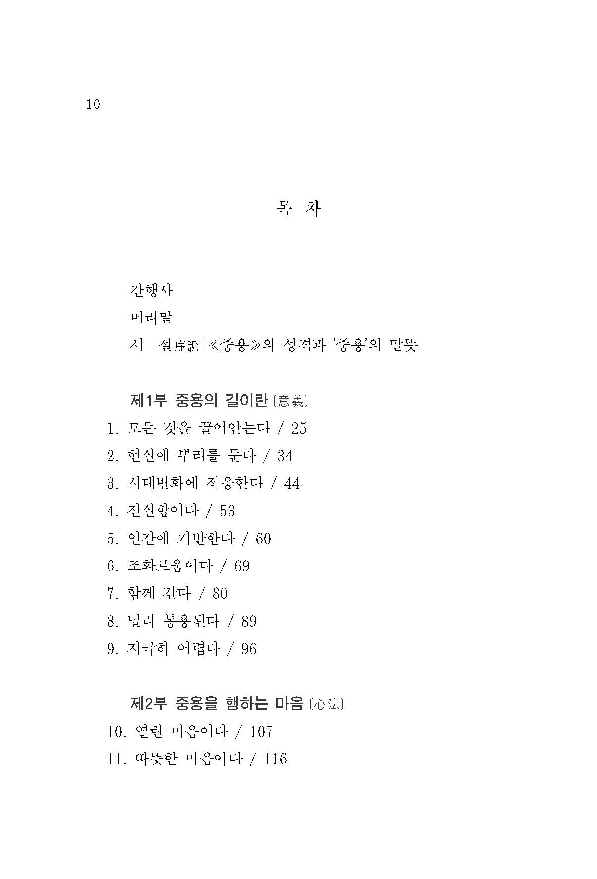 ‘중용’이라는 말 그 자체가 바로 분열과 갈등을 넘어서는 ‘화합和合의 길’을 의미한다. ‘중용의 도리’는 인간이 찾아가야할 ‘화합의 길’을 위한 방향을 제시하면서 동시에 ‘화합의 길’을 실지로 가는 실행의 방법을 제시하고 있다. 또한 인간 사이에 대립과 갈등을 벗어나 화합과 협력을 이루는 원리요 방법으로서 ‘중용의 도리’는 한 사회를 통치하는 지도자에게 가장 절실하게 필요한 ‘도리’이지만, 동시에 사람이 남들과 어울려 함께 살아가는 방법으로 누구에게나 소중한 ‘도리’이다. (7쪽)