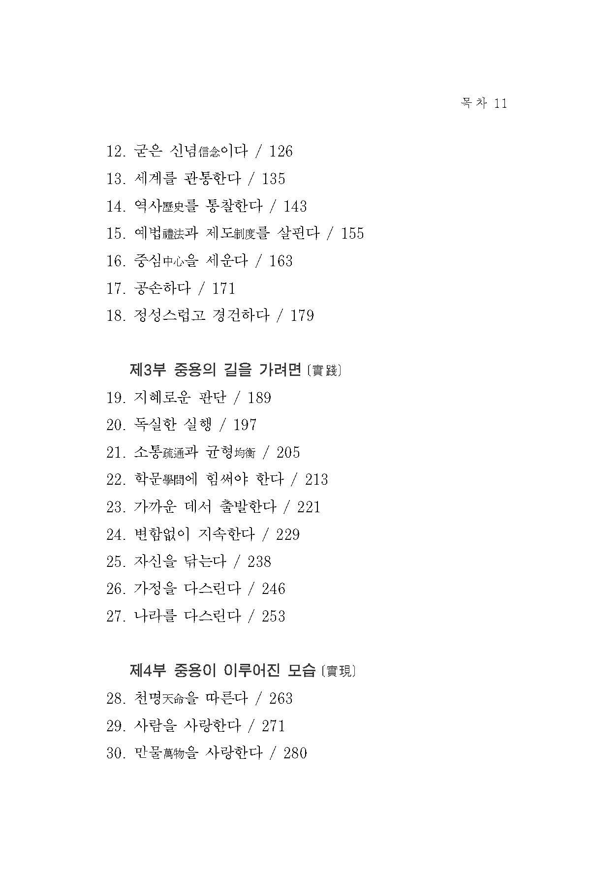 질서는 어느 사회나 어느 시대에나 같은 규범체계로 유지되는 것은 아니다. 사회가 달라지고 시대가 달라지면 질서를 이루는 규범체계 자체가 변하지 않을 수 없다. ‘중용의 도리’는 예법禮法으로 제시되고 예법은 질서를 이루는 기준이 되는데, ‘중용의 도리’가 시대에 따라 새롭게 해석되는 ‘시중時中’의 도리이니, 시대와 사회의 변화에 따라 ‘중용의 도리’가 달라지고, 이에 따라 예법도 달라지고, 또한 질서의 체계도 달라진다는 사실을 확인해둘 필요가 있다. (301쪽)