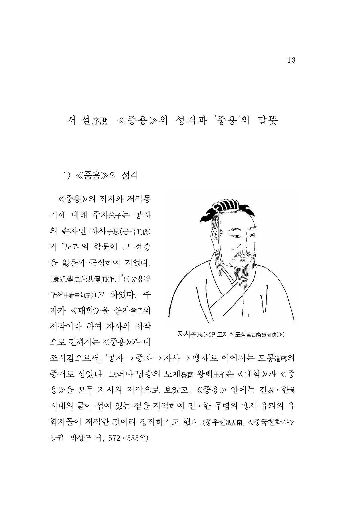공자孔子의 손자 자사子思 공급孔伋이 지었다고 전하는 ≪중용≫은 본래 ≪예기禮記≫의 한 편篇이었다. ≪중용≫은 일찍부터 학자들의 주목을 받아 단행본으로 유통되었으며, 송대宋代에는 주희朱熹가 ≪대학≫, ≪논어≫, ≪맹자≫와 함께 사서四書라고 이름을 붙이면서 유학儒學의 기본경전이 되었다.