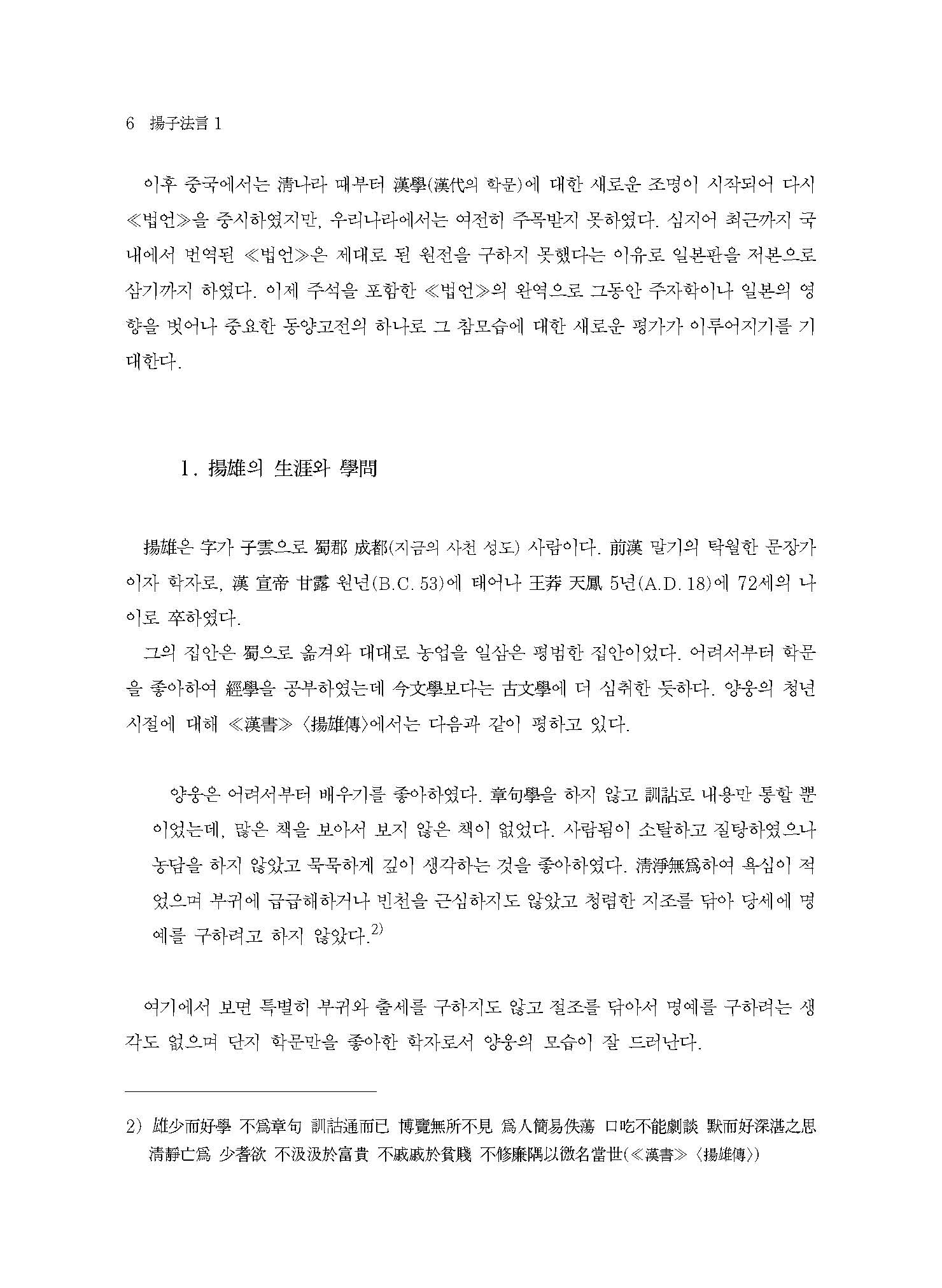동중서董仲舒와 함께 한나라를 대표하는 대유大儒 양웅은 맹자孟子와 순자荀子에 버금가는 학자로 평가받으며, 특히 ≪법언≫은 한漢⋅당唐⋅송宋나라를 거치며 많은 학자들이 주석하고 연구할 정도로 중시한 고전古典이다. 당시 양웅은 물음에 항상 법도法道대로 대답해주었기 때문에 책이름을 ‘법언’이라고 하였다. ≪법언≫은 양웅이 공자孔子의 ≪논어論語≫를 모방하여 지은 어록체語錄體 철학서로, ≪태현경太玄經≫과 함께 양웅을 대표하는 저서이다.