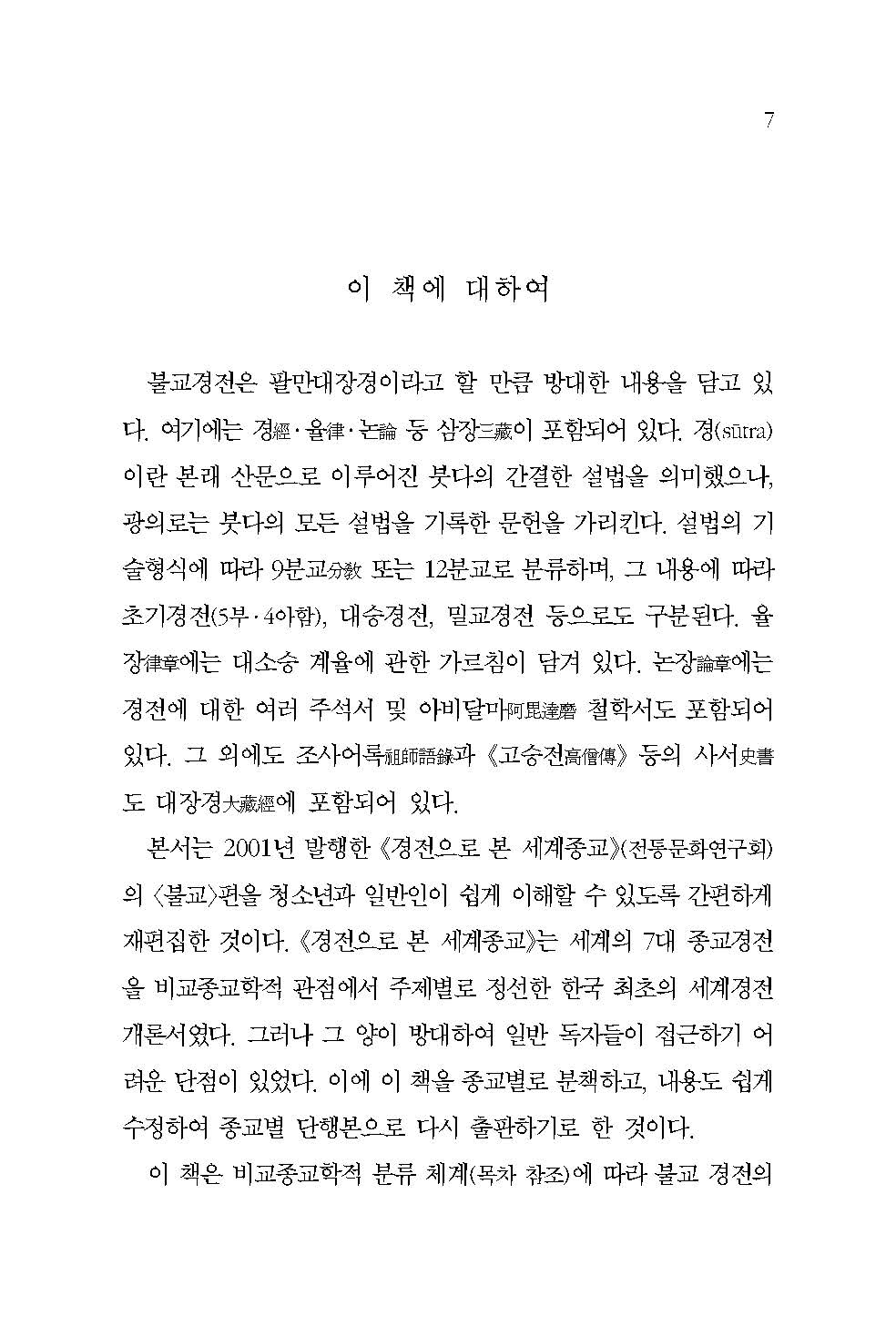 이 책은 ≪경전으로 본 세계종교≫에서 <불교>편의 핵심 내용을 추출하여 문고화한 것으로 개요와 주제별 항목에 대한 설명을 수정 보충하고, 다양한 도판圖版을 실어 내용의 이해를 도왔다. 저자인 김용표金容彪 교수는 종교다원주의에 입각하여 불교를 성찰해왔다. 특히 본서에서는 종교현상학적 유형론에 입각하여 경전의 내용을 선정하고 분류하여 보다 보편적인 관점에서 불교의 가르침을 제시하고 있다. 불교인뿐만 아니라 일반인과 청소년들에게도 불교의 보편적 가르침을 살펴볼 수 있는 기회가 될 것이다. 또한 부록에서 붓다의 생애를 그린 팔상탱八相幀, 세계의 불교 미술과 시각자료를 QR코드를 통해 스마트기기에서 볼 수 있도록 하였다.
