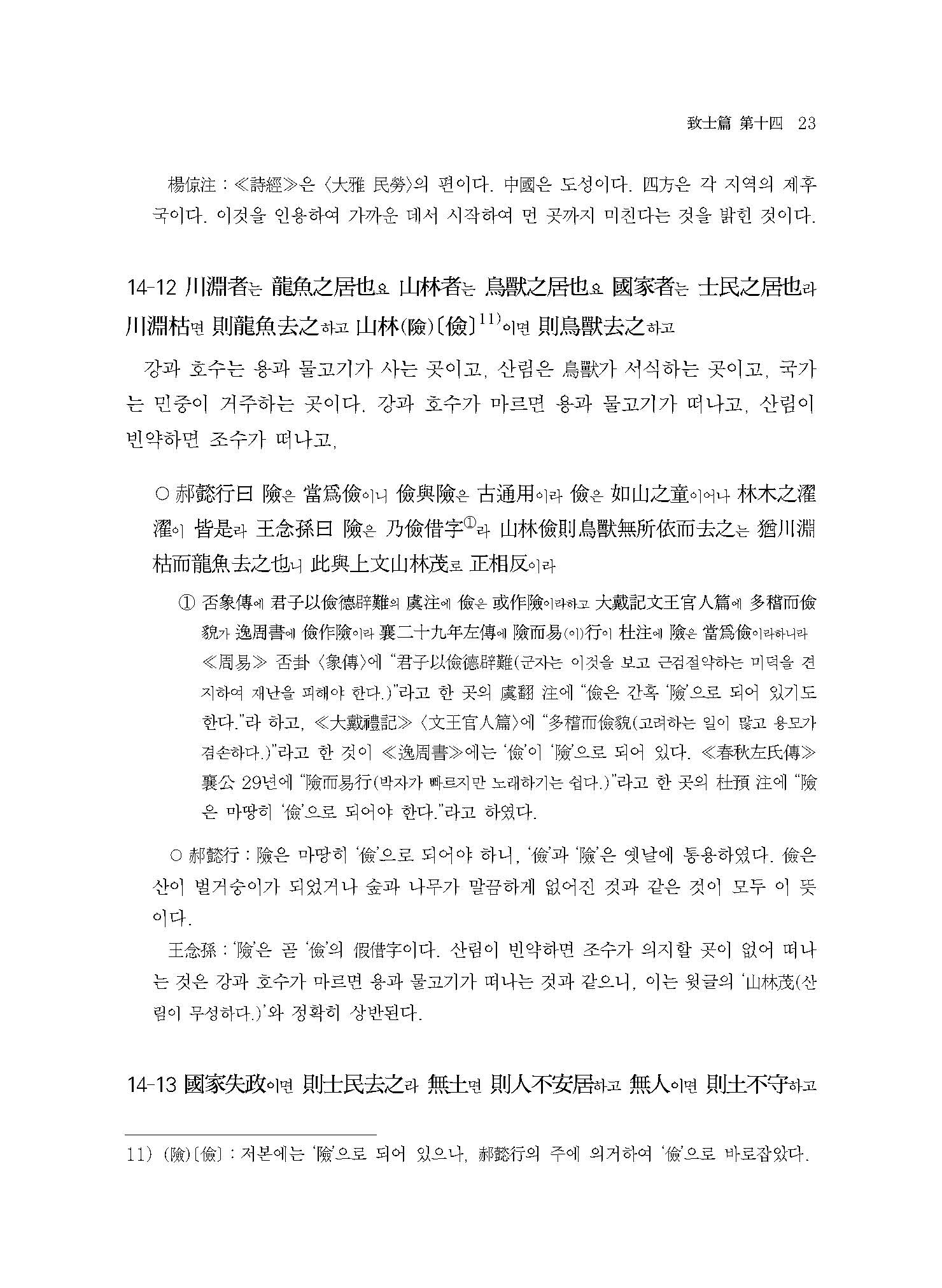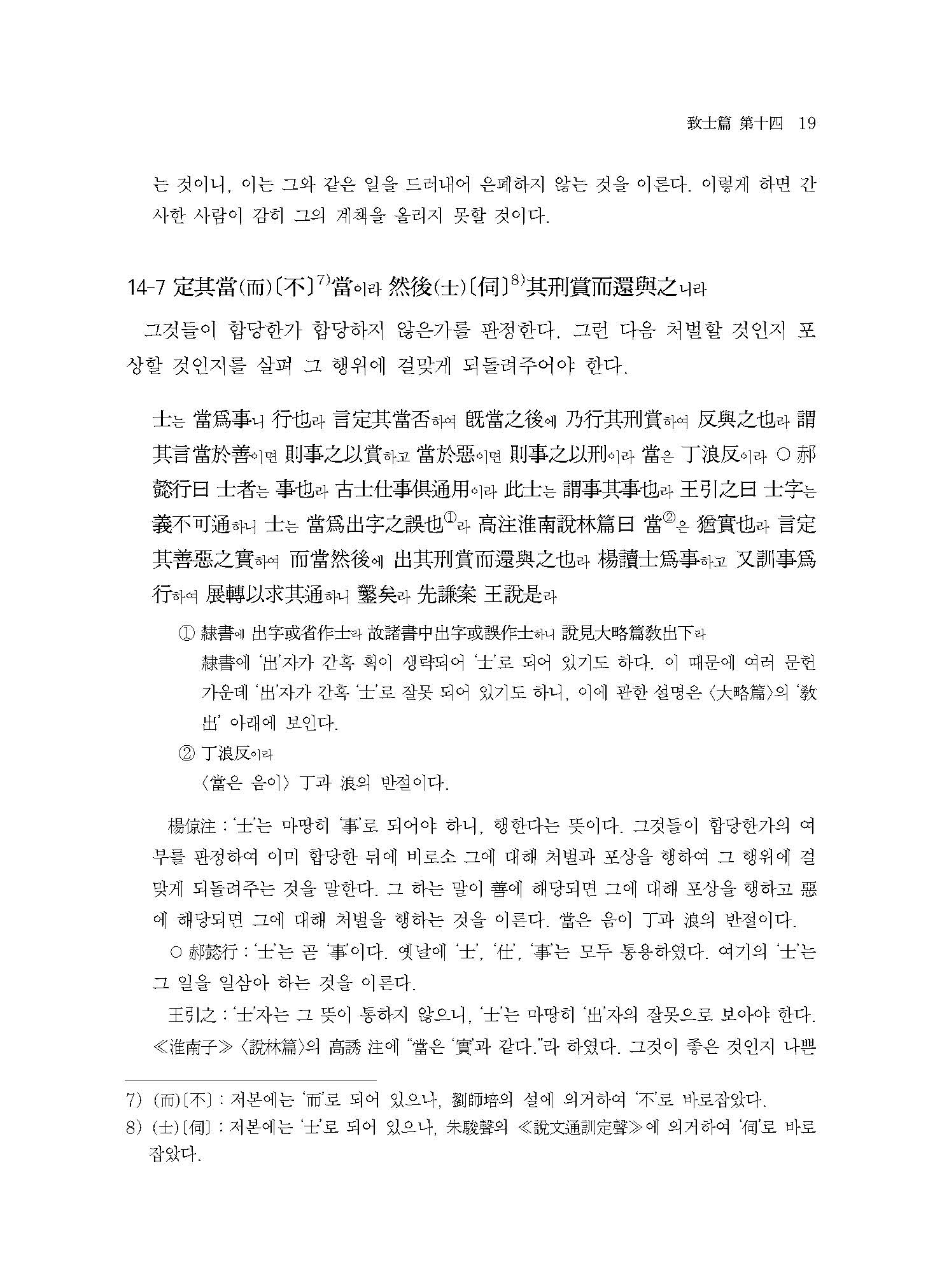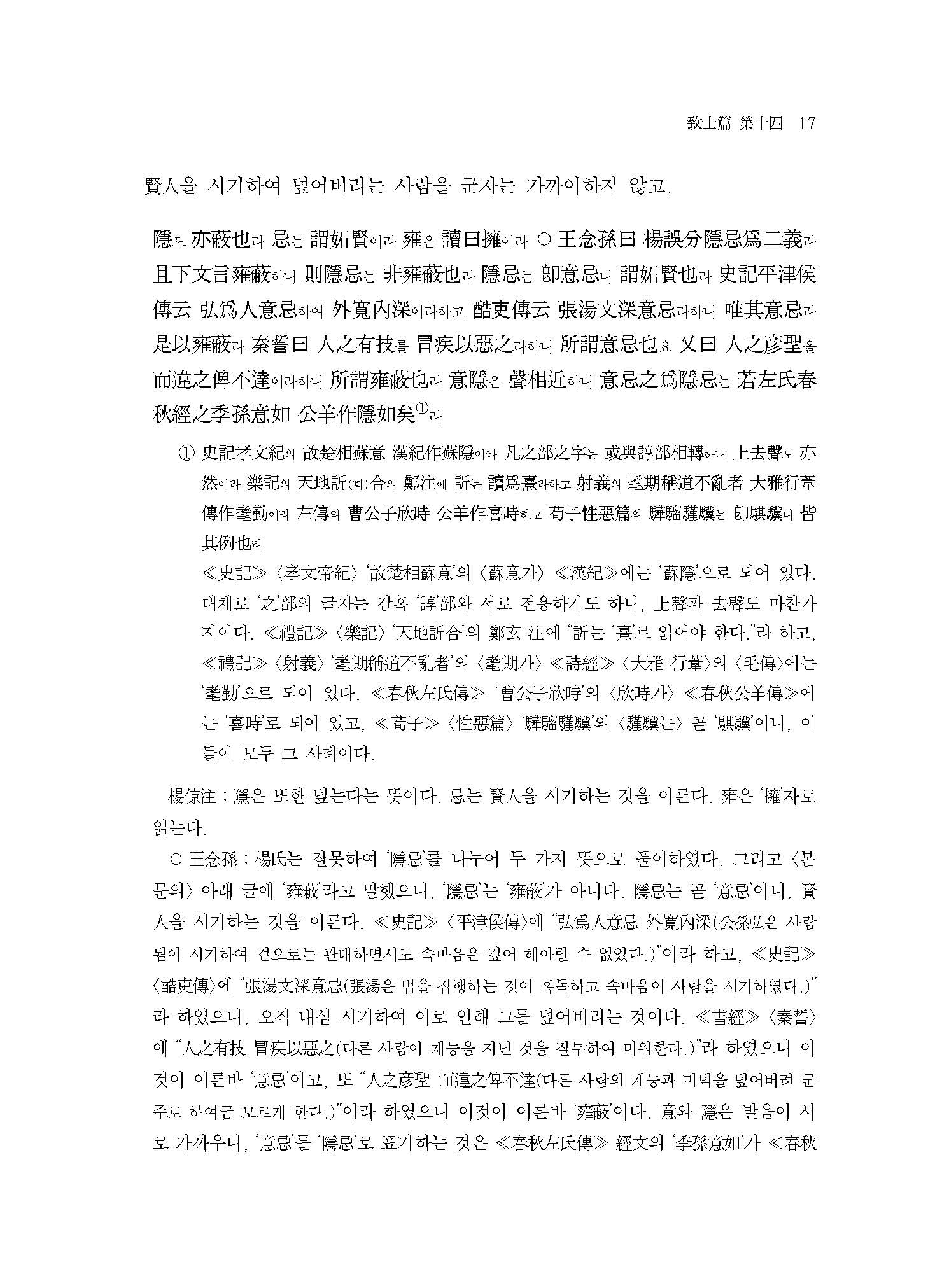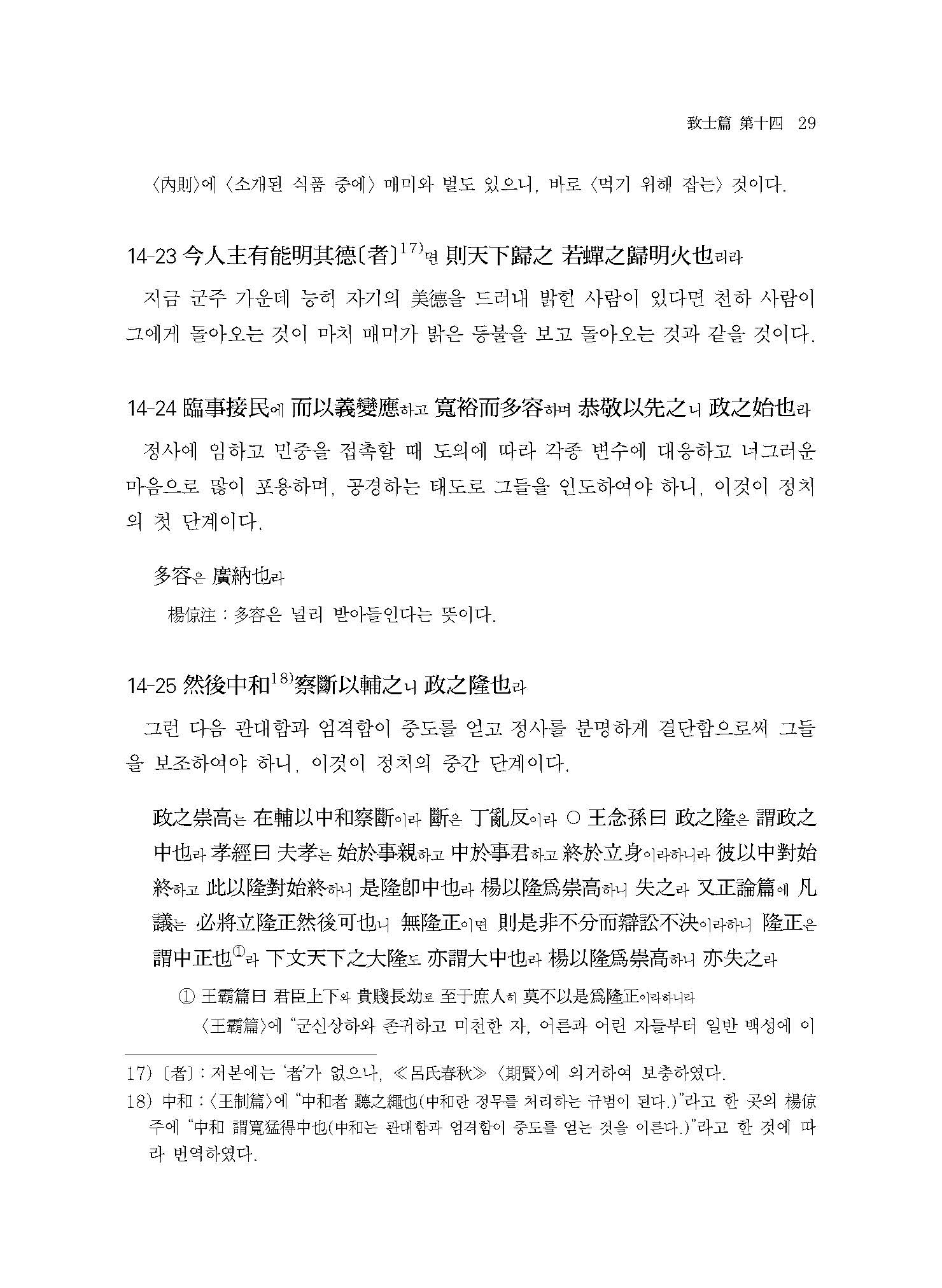 본 역주서譯註書는 동양고전 번역 전문가가, 국내외의 서적을 두루 참고하여 학술적으로 연구 번역한 책이다. 단락별로 원문과 번역문을 함께 실어놓고, 원문에는 원문의 문장구조를 한국적인 방식으로 이해하는 데 도움이 되도록 우리나라 전통적 방식의 현토懸吐를 하였다. 또한 주석은 관련 고사故事와 인물人物뿐만 아니라, 역사적 사실이나 제도적인 측면까지 심도 있게 밝혀 독자들의 내용 이해를 도왔다.