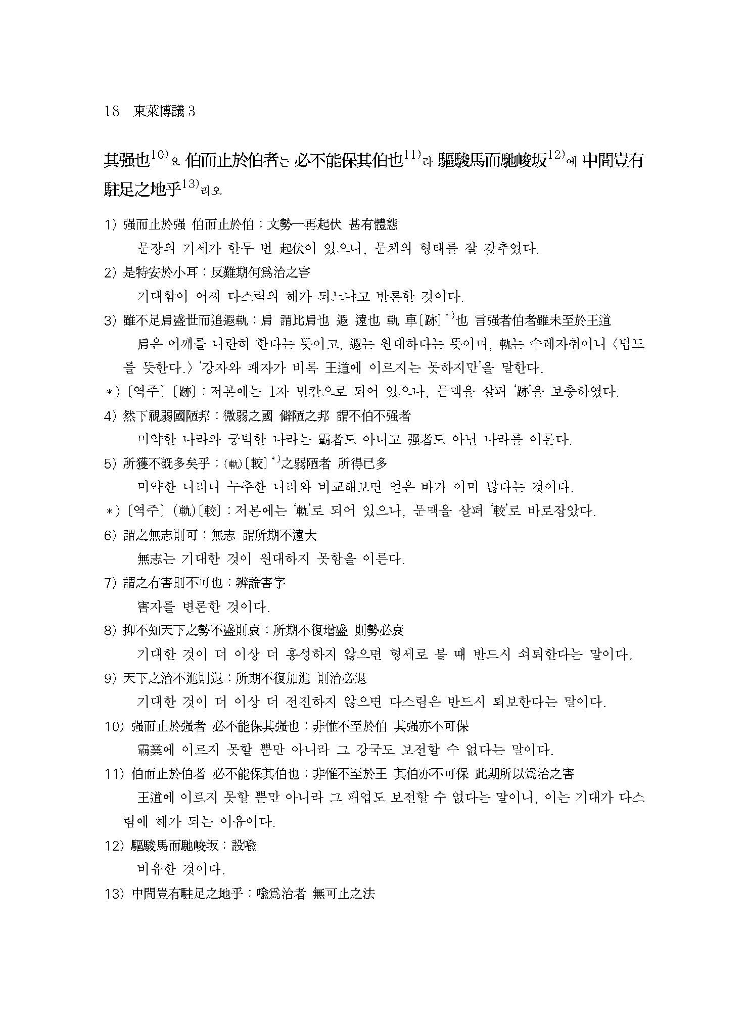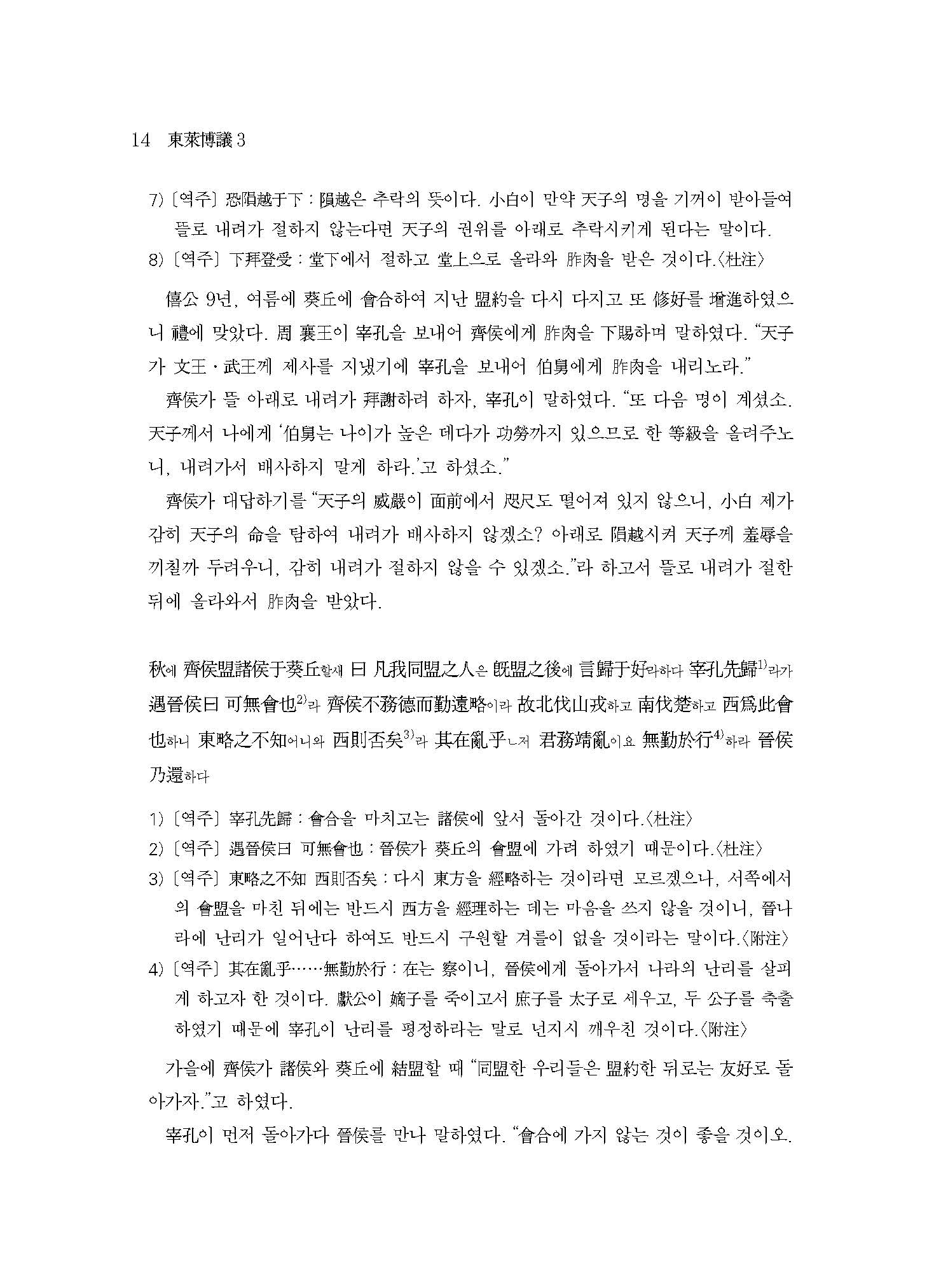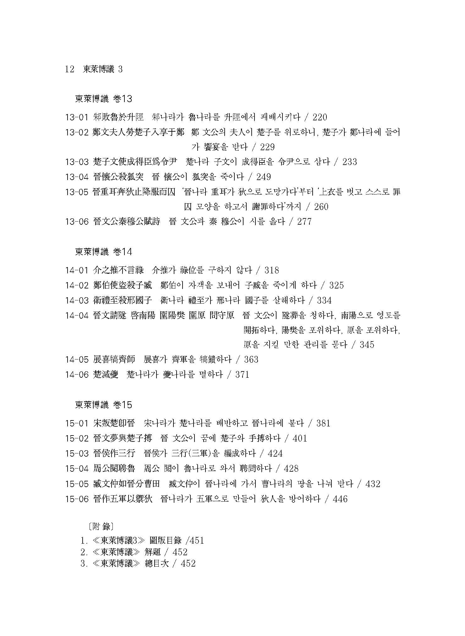 ≪역주 동래박의 3≫은 저본 11~15권까지의 내용을 담았다. 원문에는 전통적 방식의 현토懸吐를 하여 단락별로 번역문과 함께 실어놓음으로써, 원문의 문장구조를 이해하기 쉽도록 하였다. 또한 역주譯註에서는 관련 고사故事와 인물人物뿐만 아니라, 내용 이해에 필요한 역사적 사실이나 제도적인 면까지 심도 있게 밝힘으로써 일반 독자들도 쉽게 이해할 수 있도록 하였다. ≪춘추좌씨전≫의 대표적인 평론서評論書인 ≪동래박의≫를 통해 ≪춘추좌씨전≫을 요약하여 봄과 아울러 역사 평론의 진미를 맛볼 수 있을 것이다.